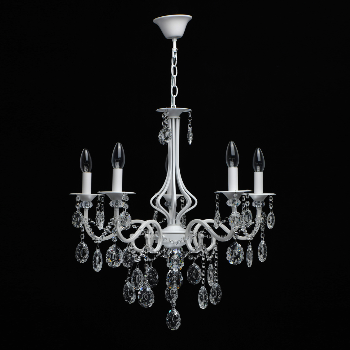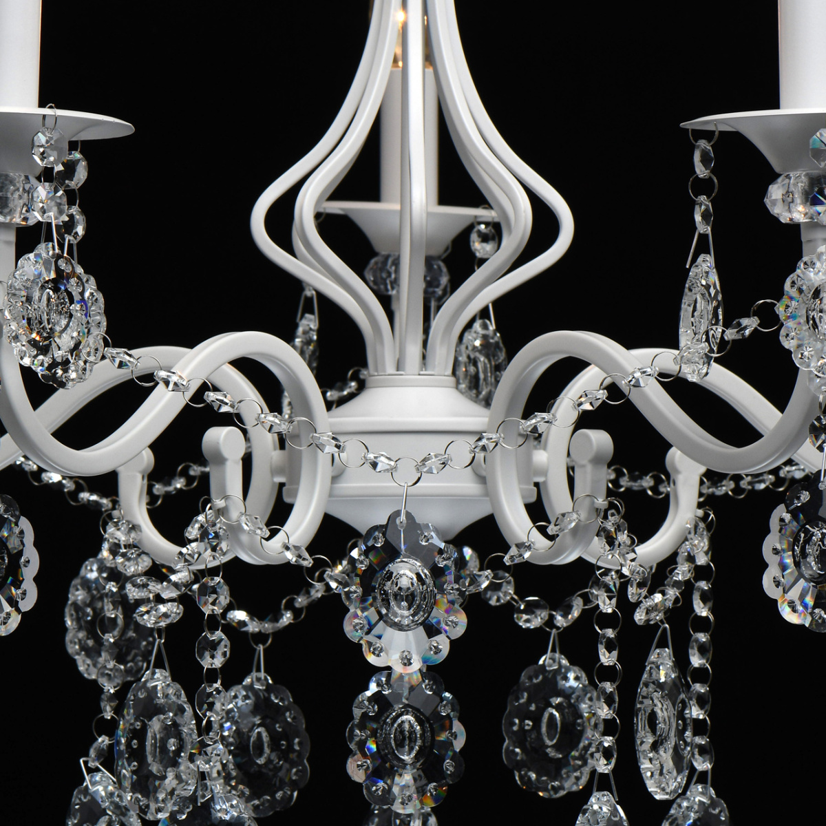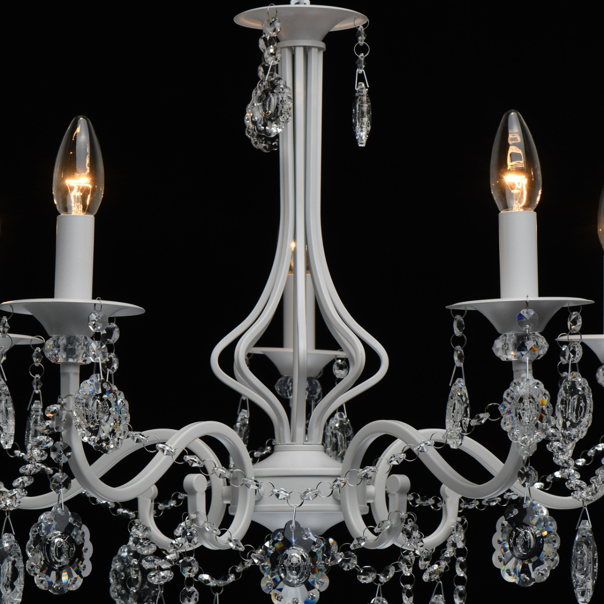 Основание светильника выполнено из металла и окрашено в белый цвет. Светильник декорирован прозрачным хрусталем оригинальной формы.