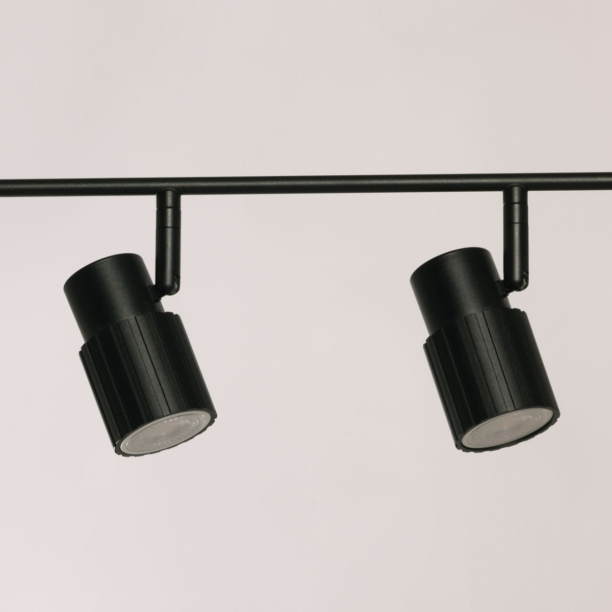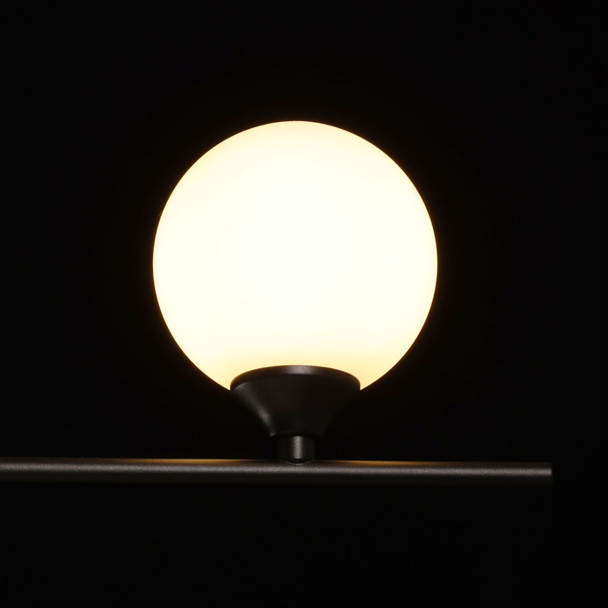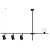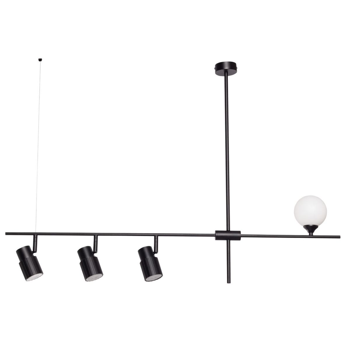 Металлическое основание подвесного светильника окрашено в черный цвет. Корпус плафонов спотов выполнен из сплава алюминия и окрашен в цвет основания. Светодиодный источник света закрыт декоративным плафоном из белого матового акрила.