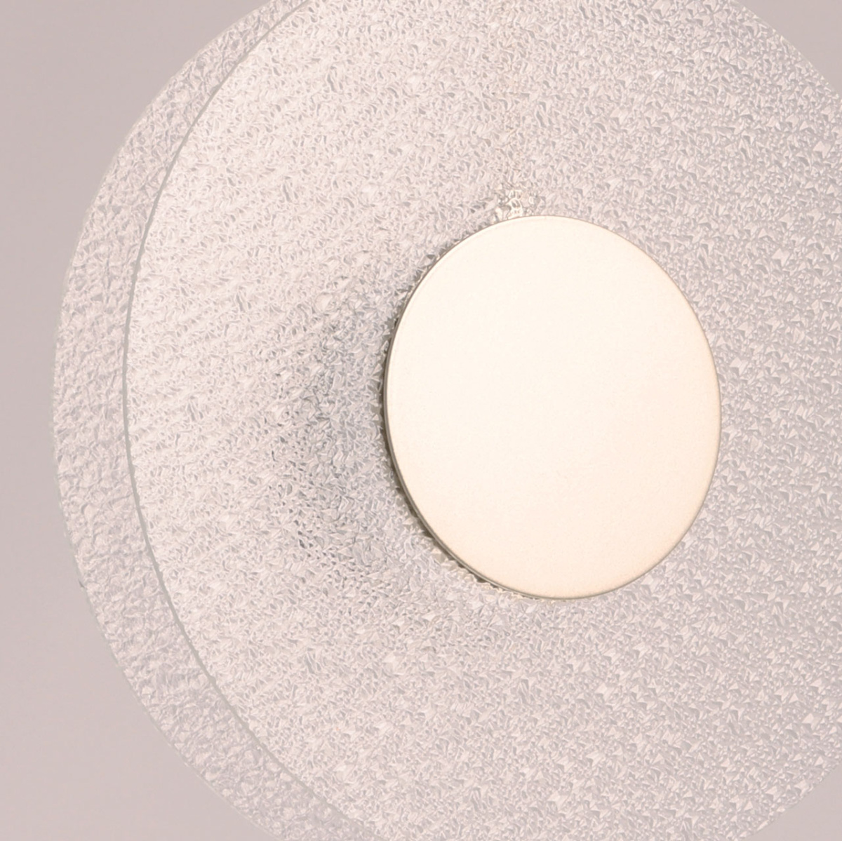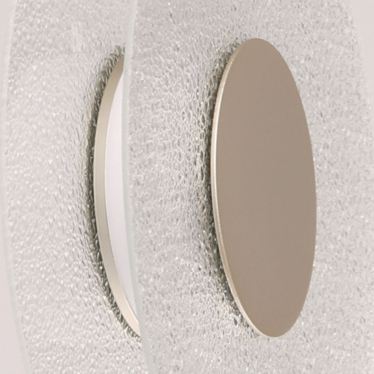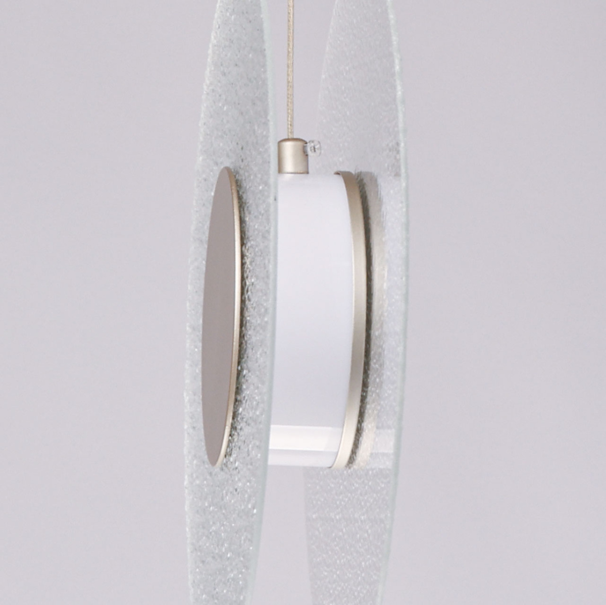 Металлическое основание подвеса гальванизировано в цвет никеля. Корпус плафона выполнен из сплава алюминия с цинком и гальванизирован в цвет основания. Светодиодные источники света закрыты матовым акрилом. Подвес декорирован прозрачным фактурным стеклом.