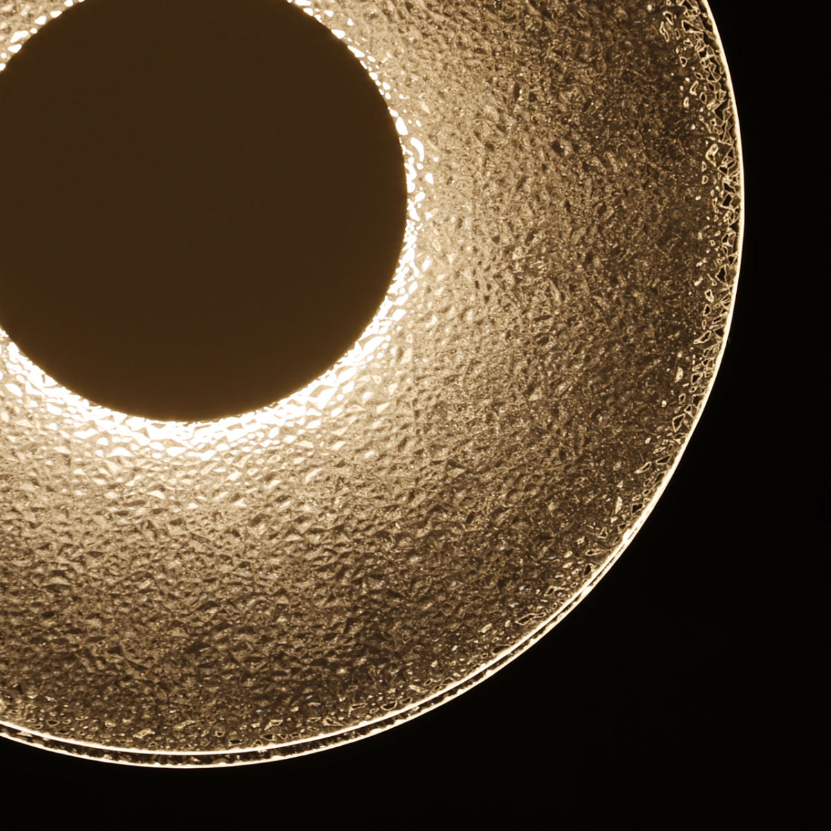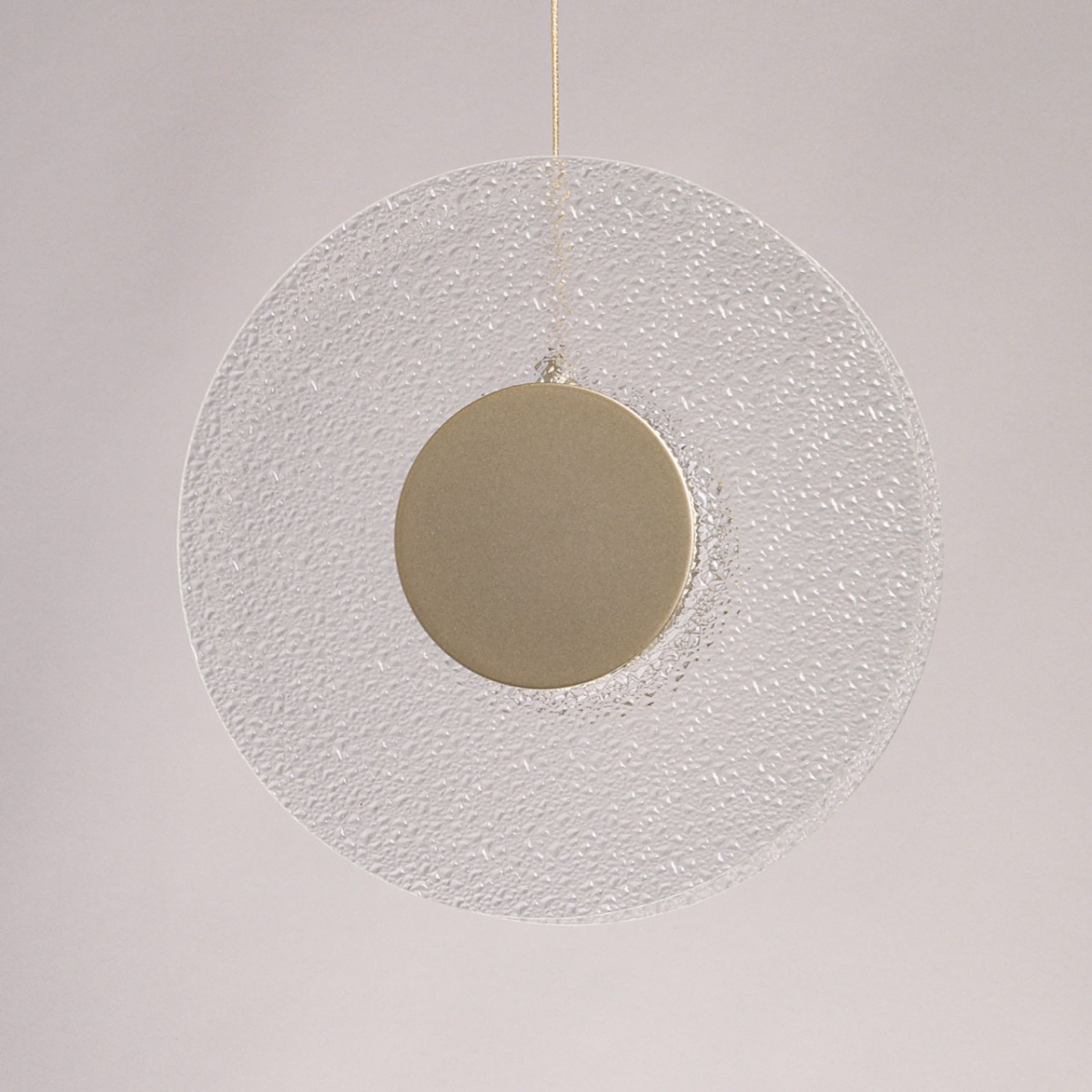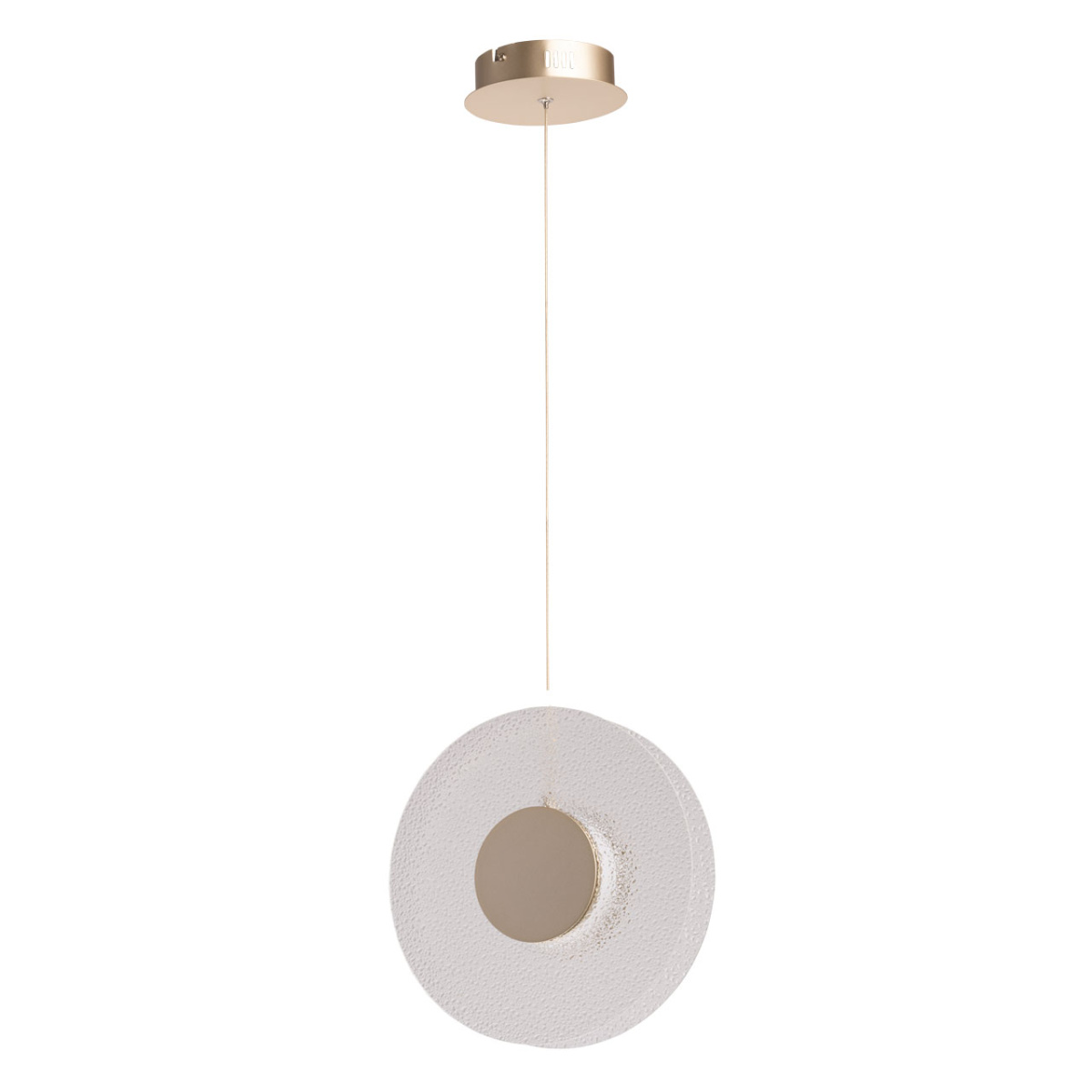 Металлическое основание подвеса гальванизировано в цвет никеля. Корпус плафона выполнен из сплава алюминия с цинком и гальванизирован в цвет основания. Светодиодные источники света закрыты матовым акрилом. Подвес декорирован прозрачным фактурным стеклом.