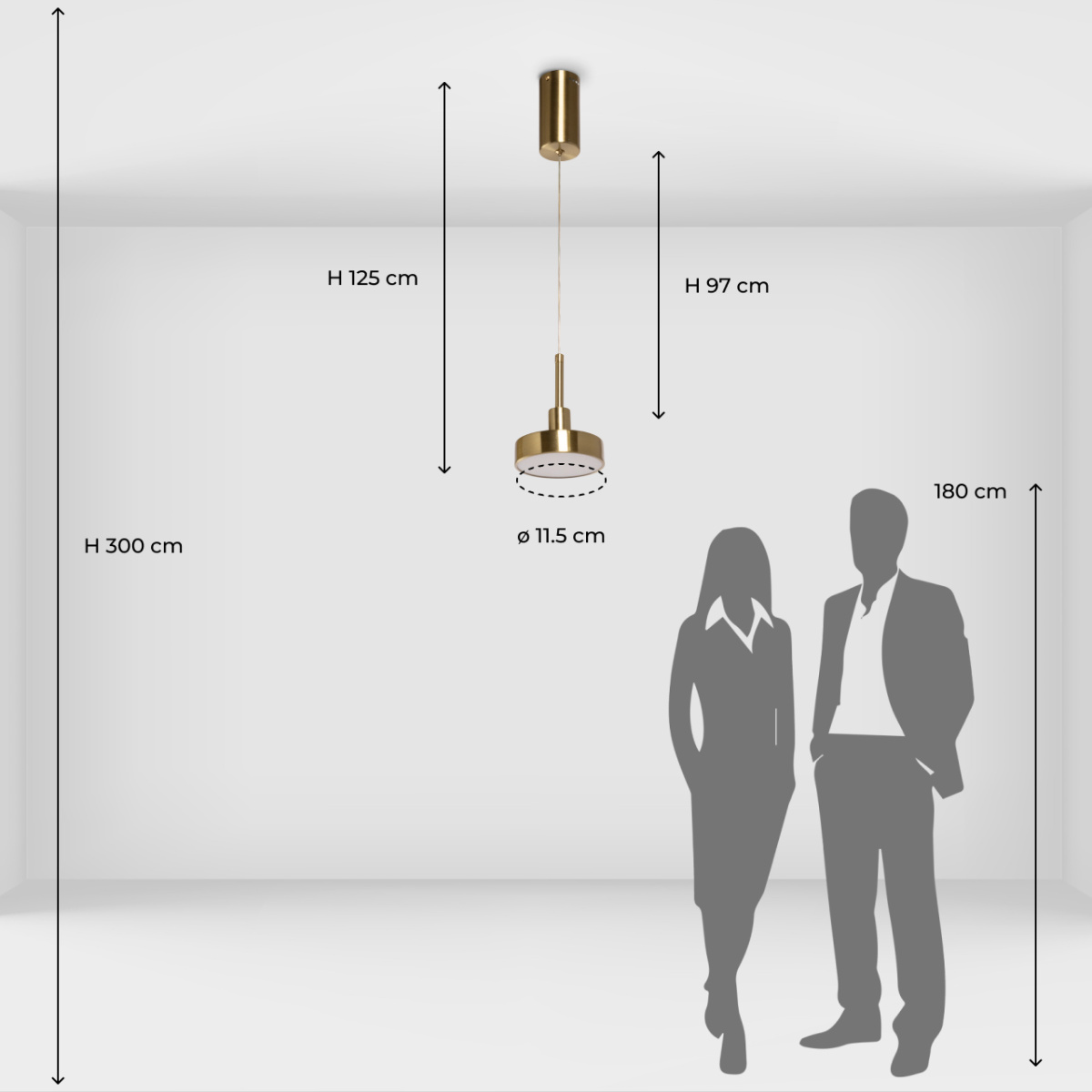 Металлическое основание подвеса гальванизировано в цвет латуни. Корпус плафона выполнен из сплава алюминия и гальванизирован в цвет основания. Светодиодный источник света закрыт матовым акрилом.