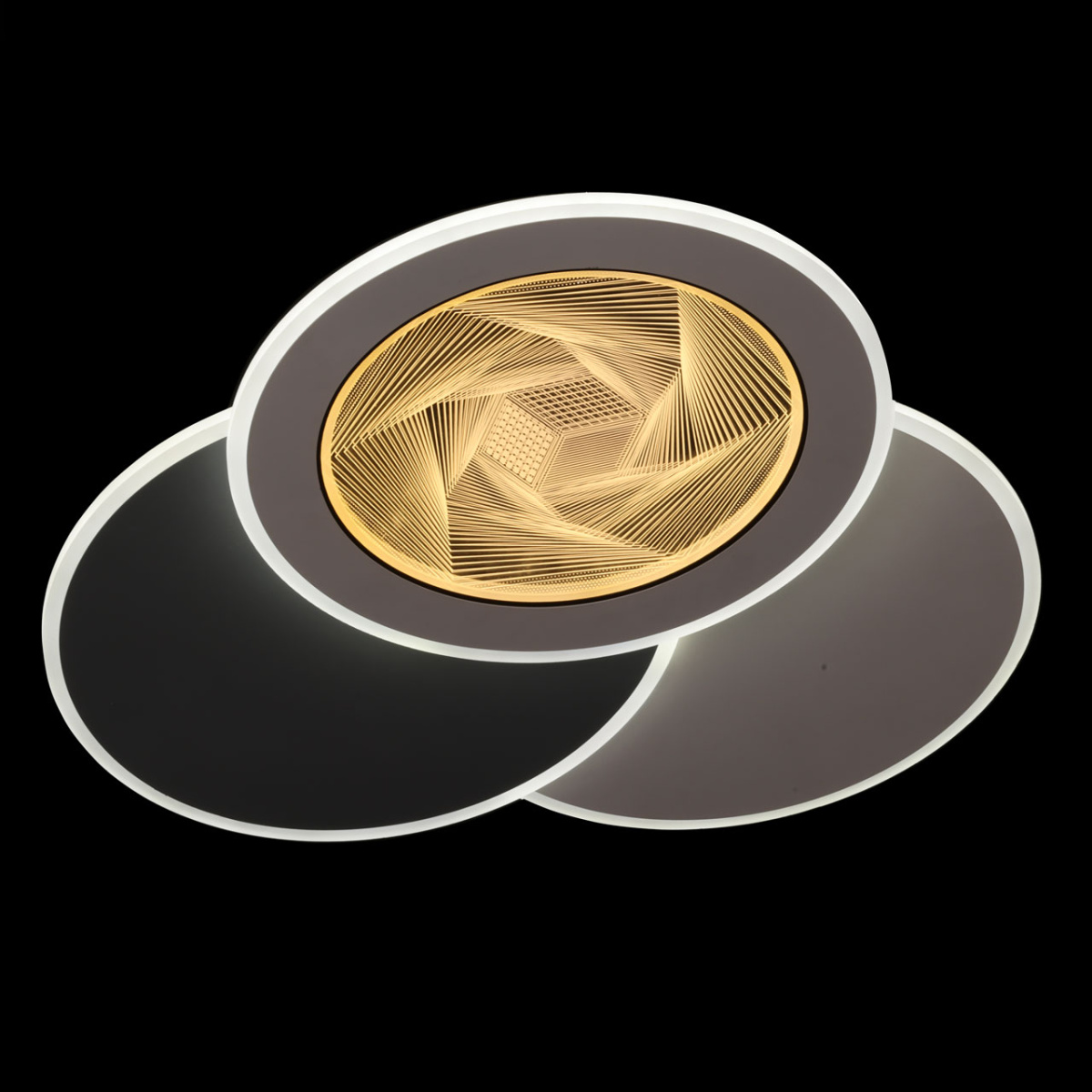 Металлическое основание потолочной люстры окрашено в белый цвет. Корпус плафонов выполнен из сплава алюминия с цинком и окрашен в белый и серый цвета. Светодиодные источники света закрыты матовым акрилом с 3D-эффектом.