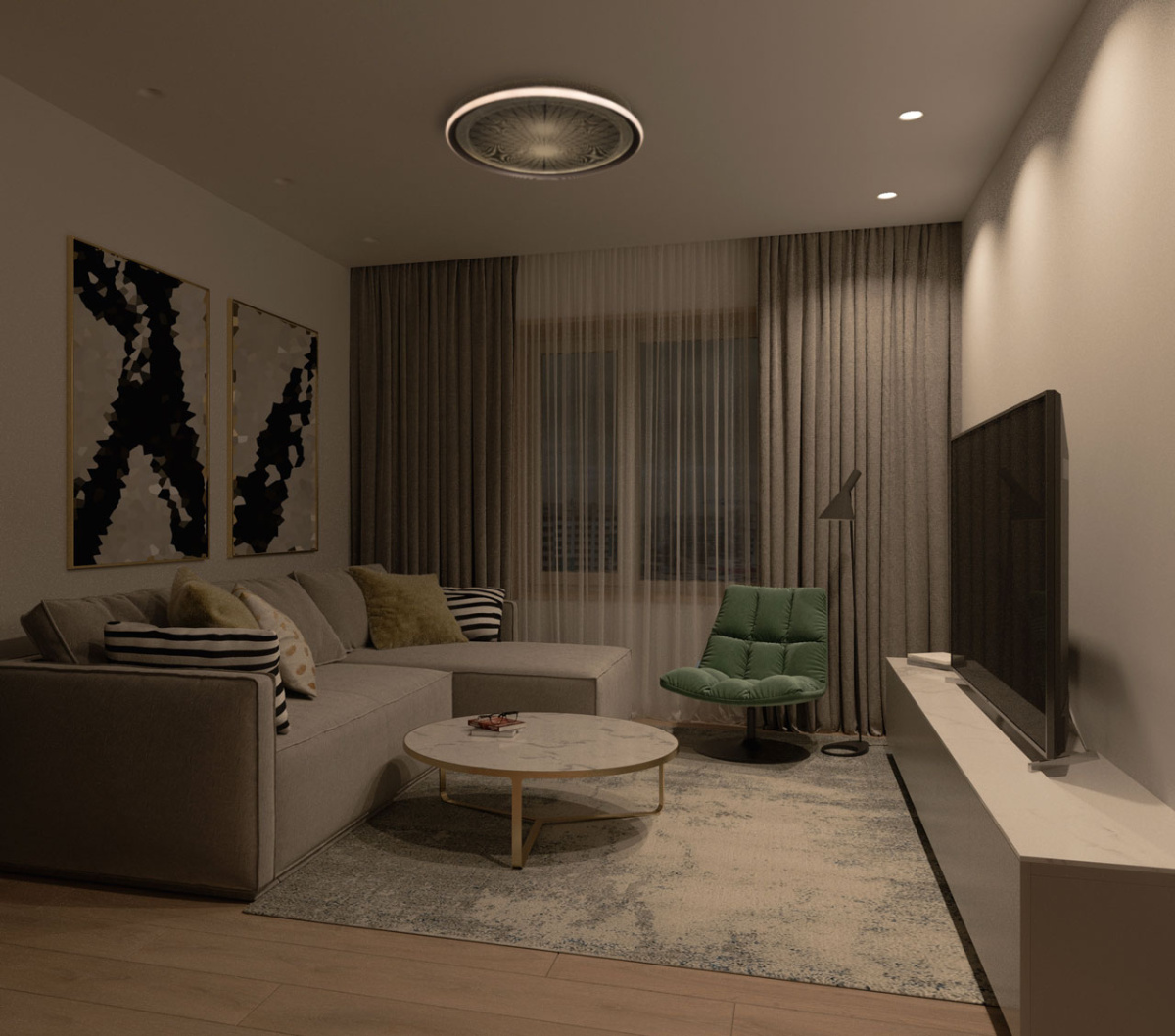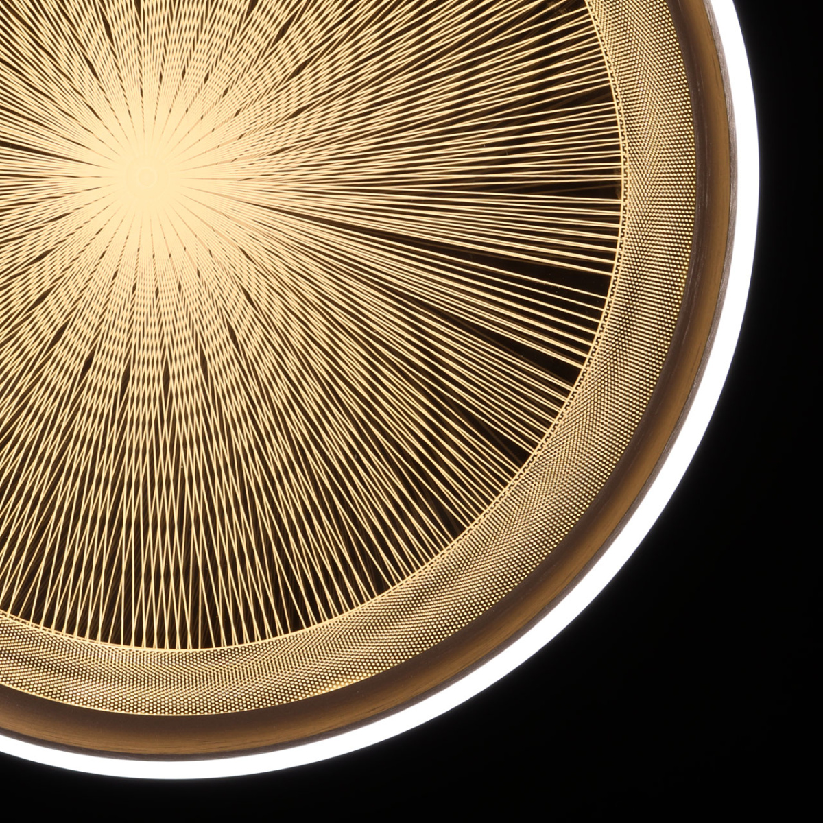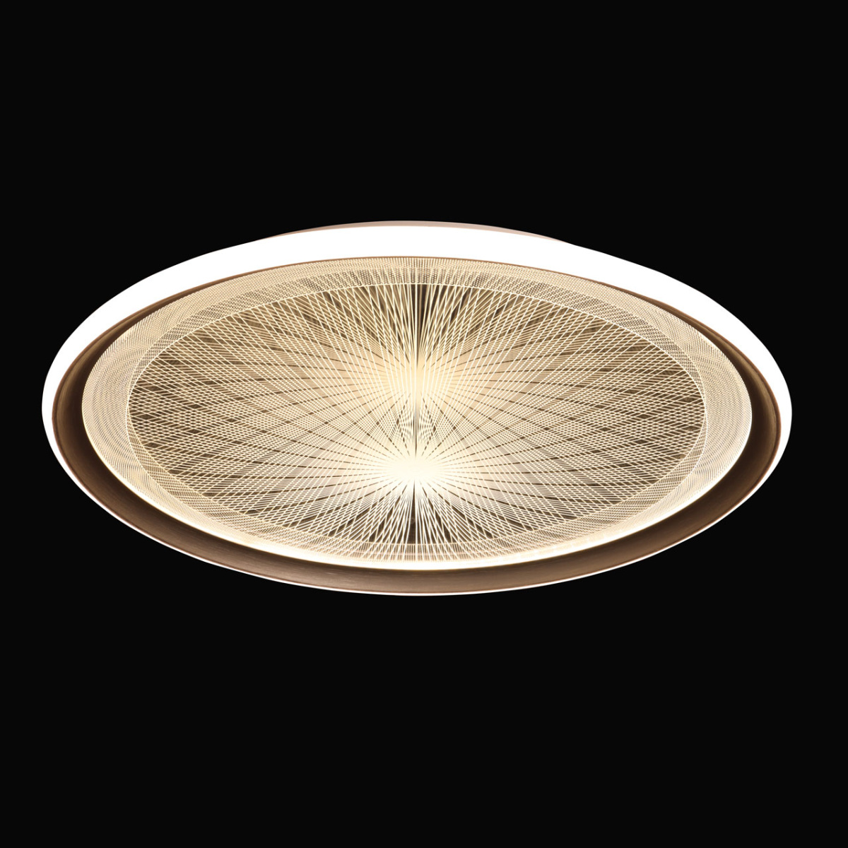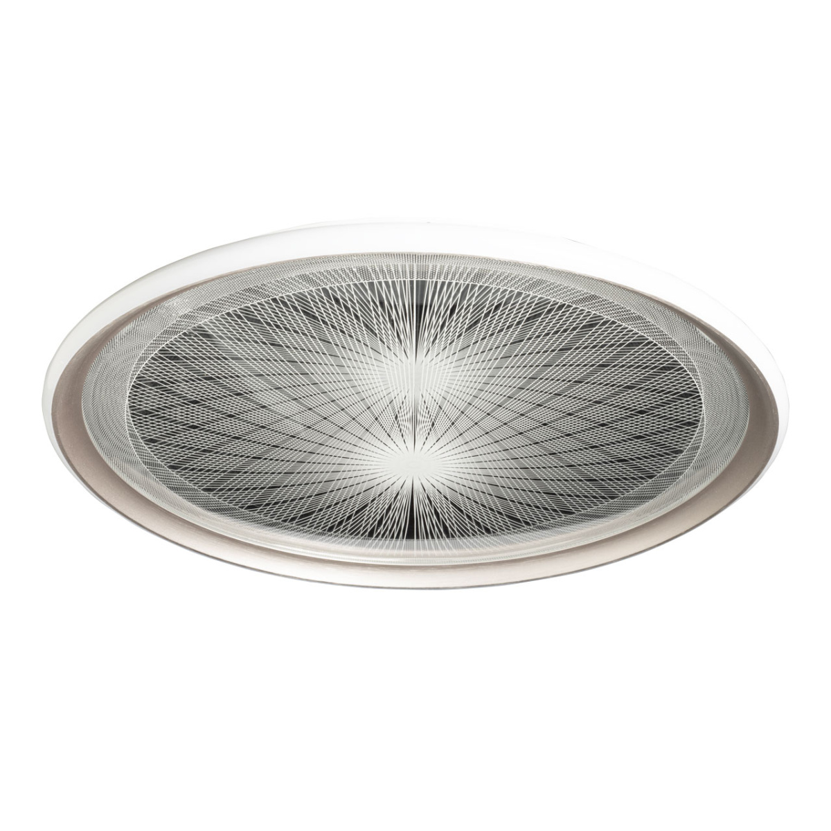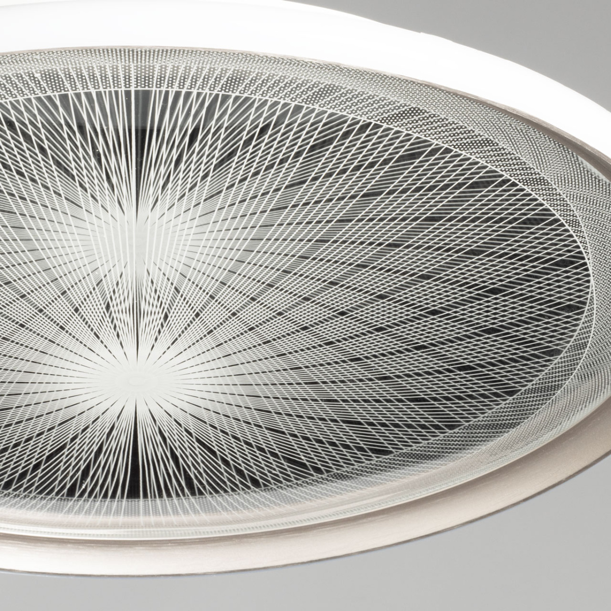 Металлическое основание светильника окрашено в белый цвет. Плафон выполнен из сплава алюминия с цинком и окрашен в цвет серебра. Светодиодные источники света закрыты белым матовым акрилом. Потолочная люстра декорирована металлической пластиной, гальванизированной в цвет хрома и прозрачным акрилом с 3D-эффектом.