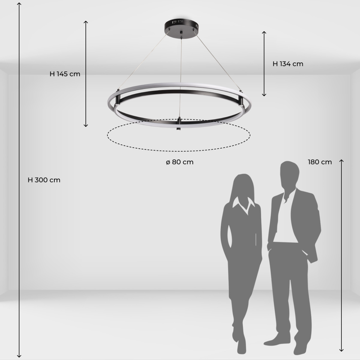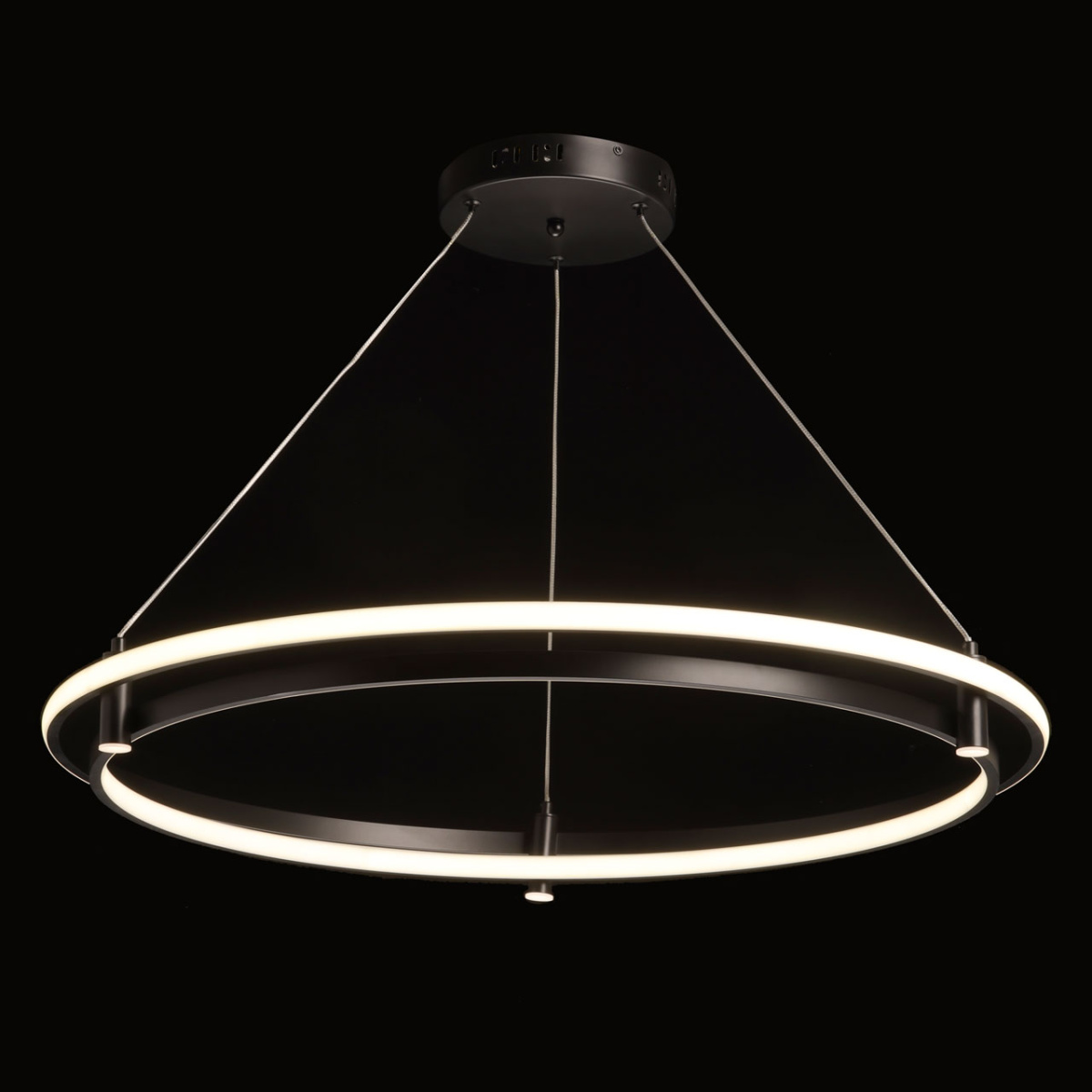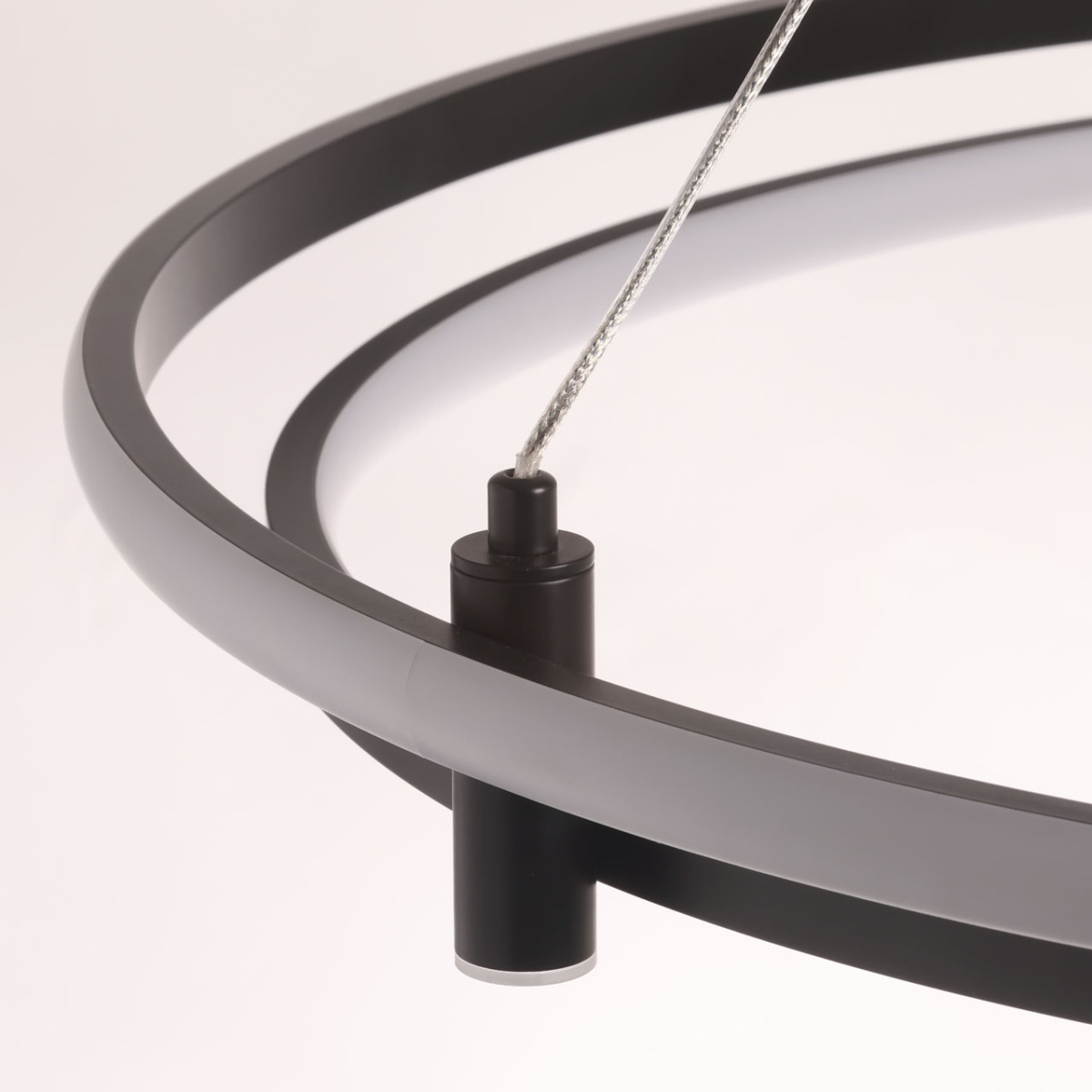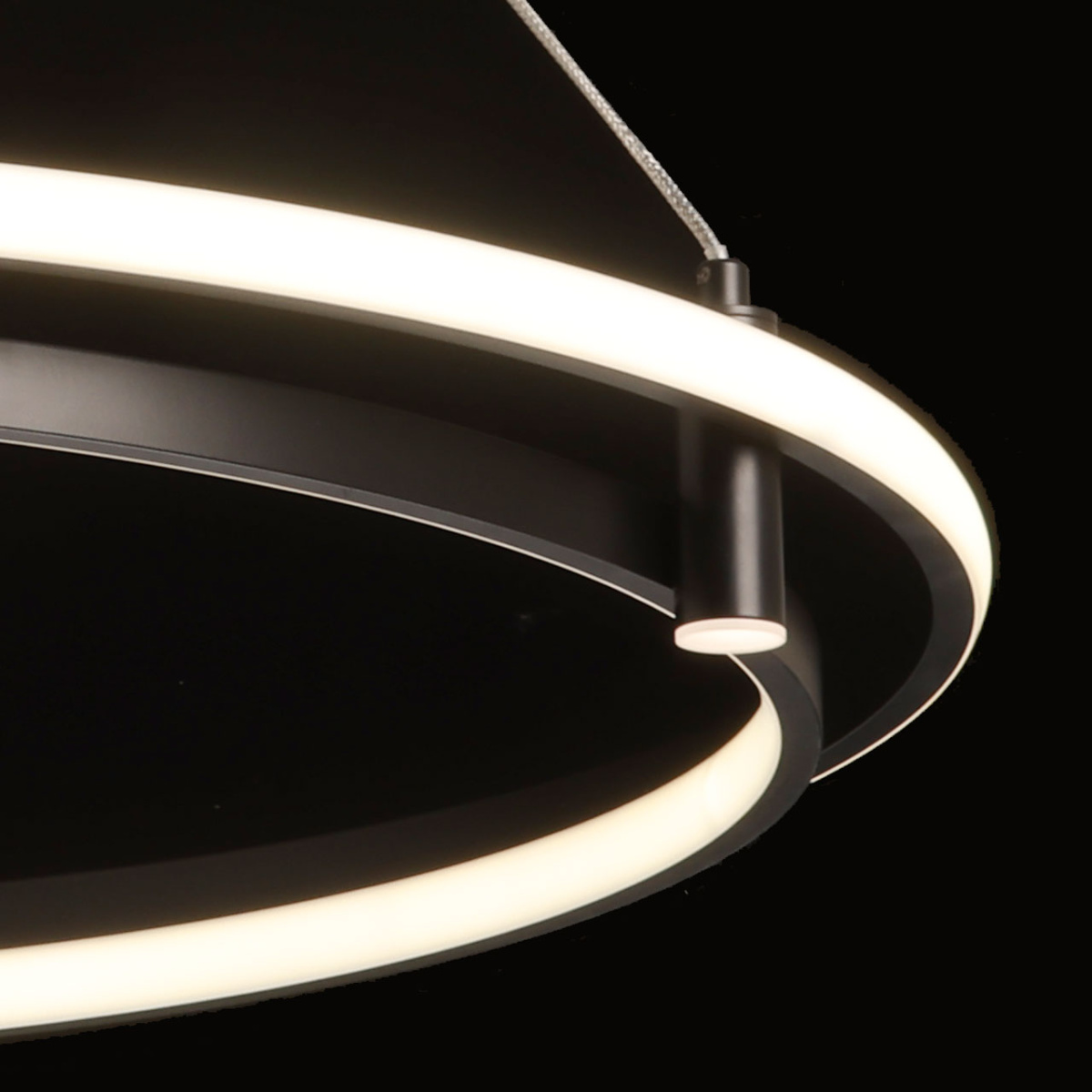 Металлическая потолочная чаша подвесной люстры окрашена в черный цвет. Плафон выполнен из сплава алюминия с цинком и окрашен в цвет основания. Светодиодные источники света закрыты белым матовым силиконом.