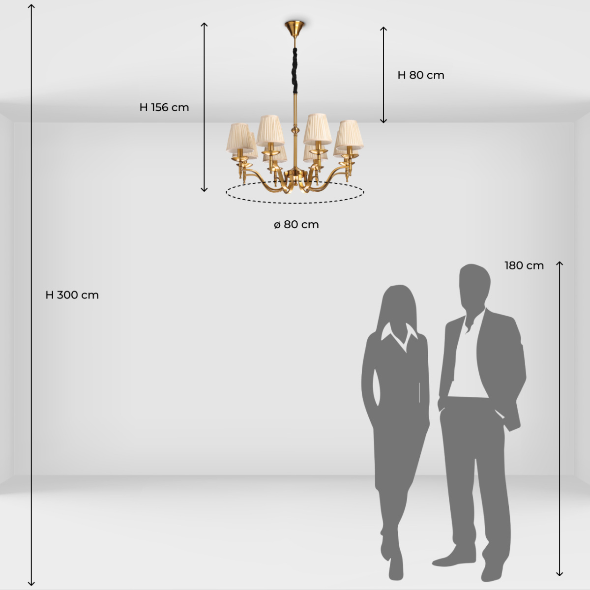 Металлическое основание светильника гальванизировано в цвет медовая бронза. Светильник декорирован текстильными абажурами бежевого цвета.