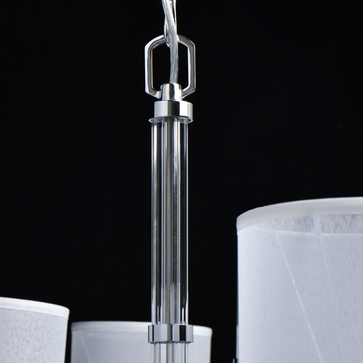 Основание светильника выполнено из металла и гальванизировано в цвет блестящего хрома. Абажуры с термостойким акрилом внутри и текстилем с рисовым рисунком белого цвета снаружи. Абажуры отделаны кантом и прошиты. Светильник декорирован прозрачным массивом хрусталя.