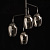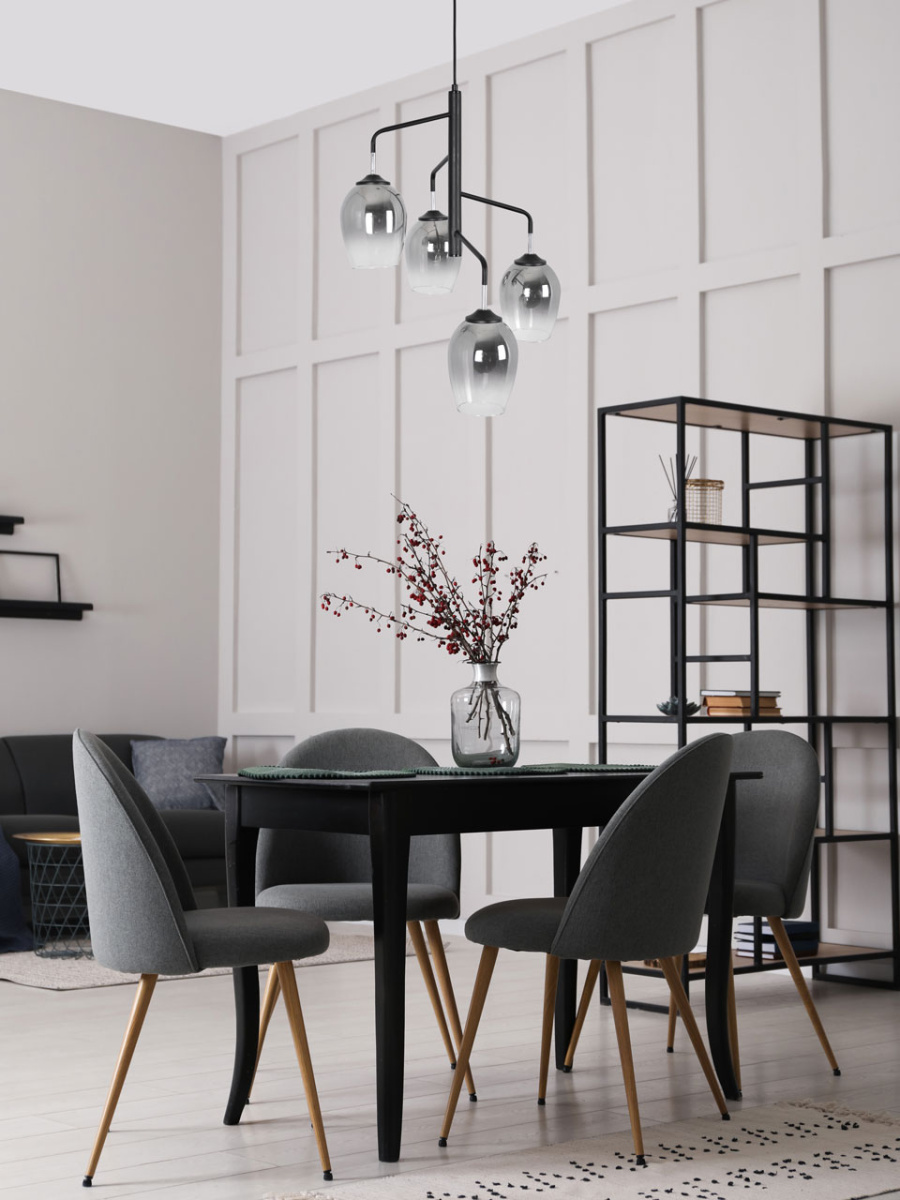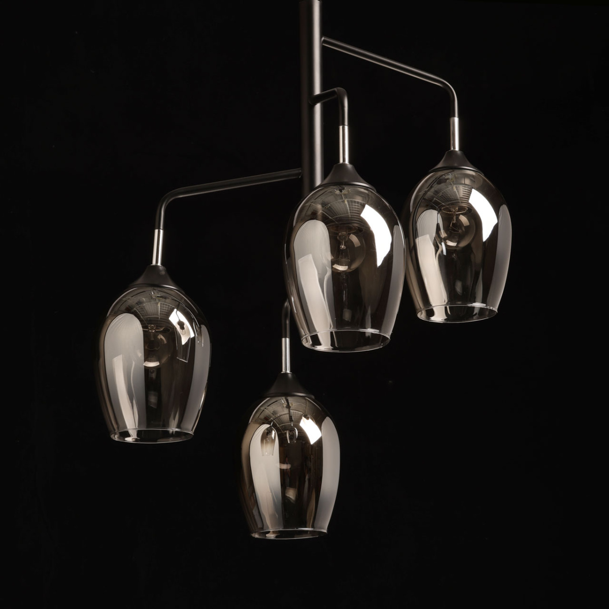 Металлическое основание подвесной люстры окрашено в черный цвет. Отдельные элементы основания гальванизированы в цвет хрома. Стеклянные плафоны выдуваются в форму и гальванизированы в дымчатый цвет по принципу градиента - от основания плафона к краю цвет истончается.