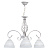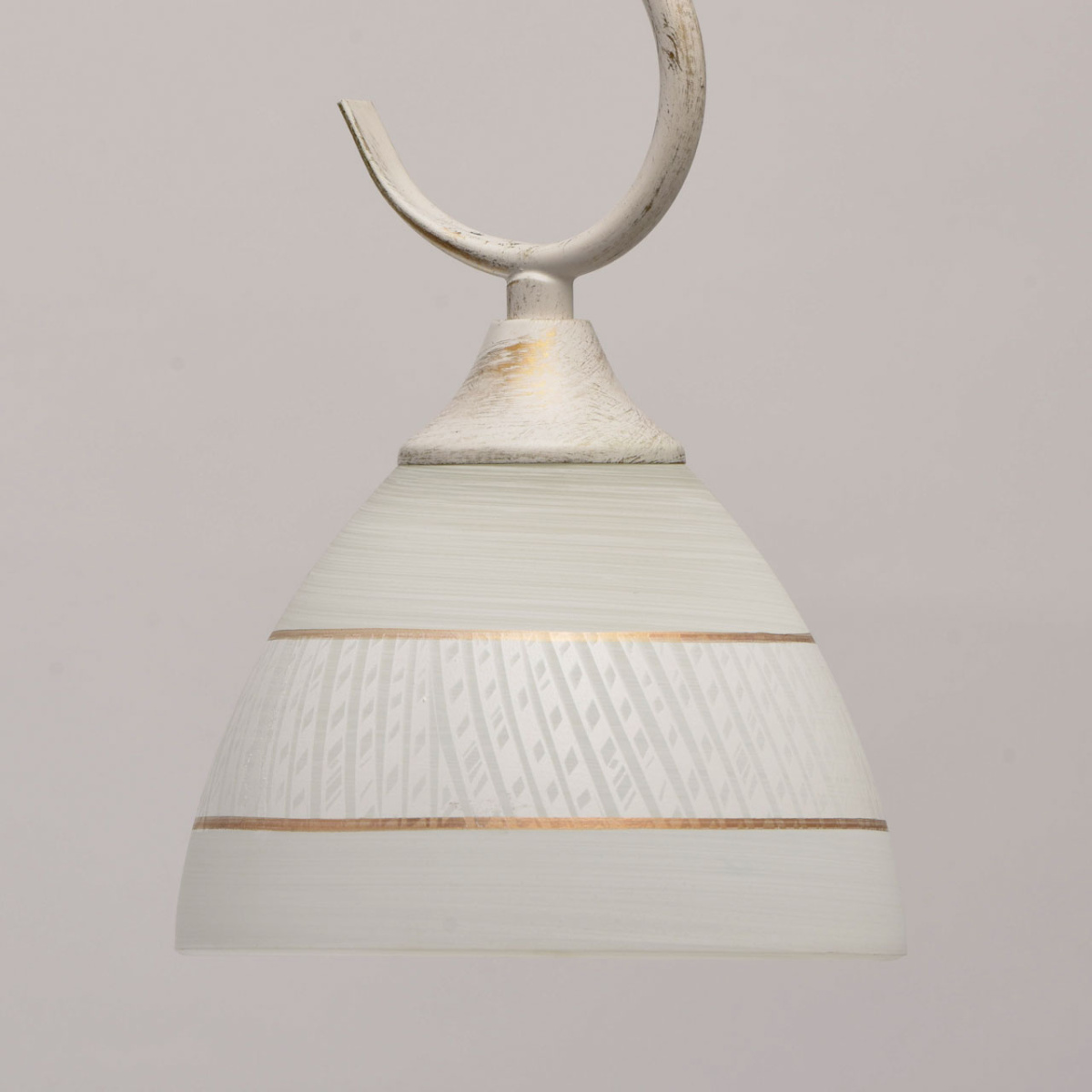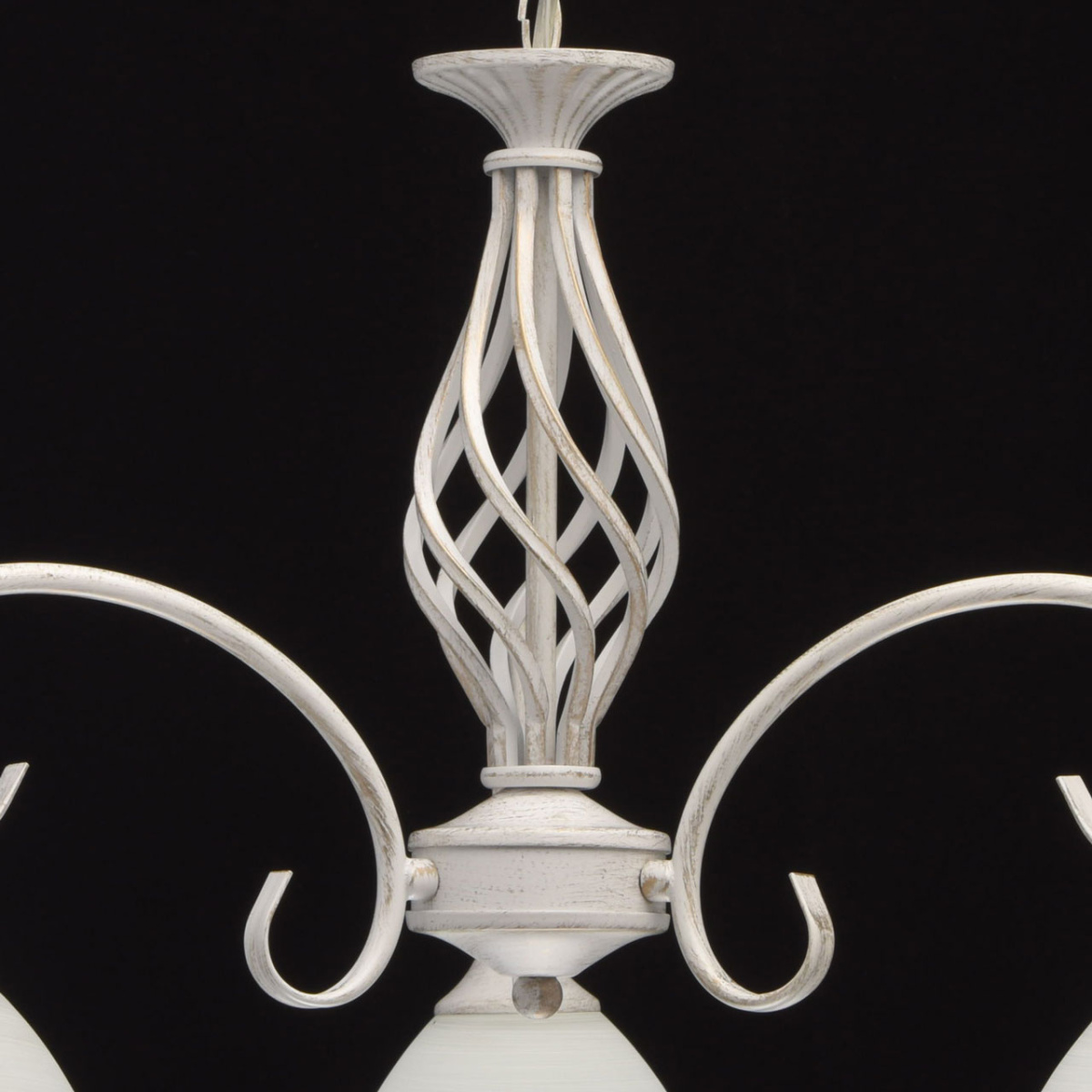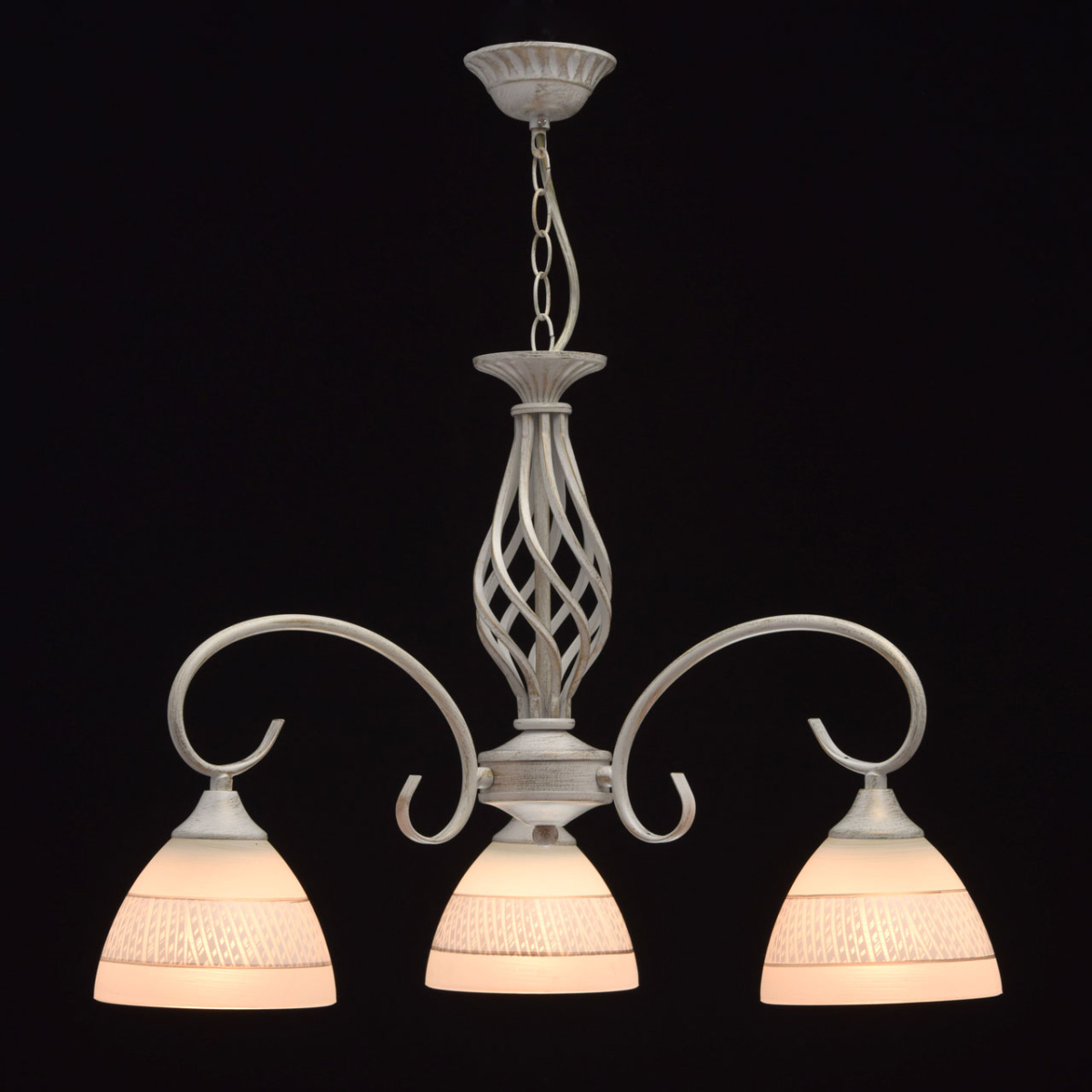Основание: металл, окрашивание по технологии хай-лайт, защитный слой - белый цвет, декоративный слой золотого цвета нанесен сухой кистью . Плафоны: стекло, обработано по технологии матирования. На плафоны нанесен рисунок белой и золотой краской. Декор: центральная часть выполнена по технологии твист.