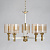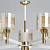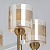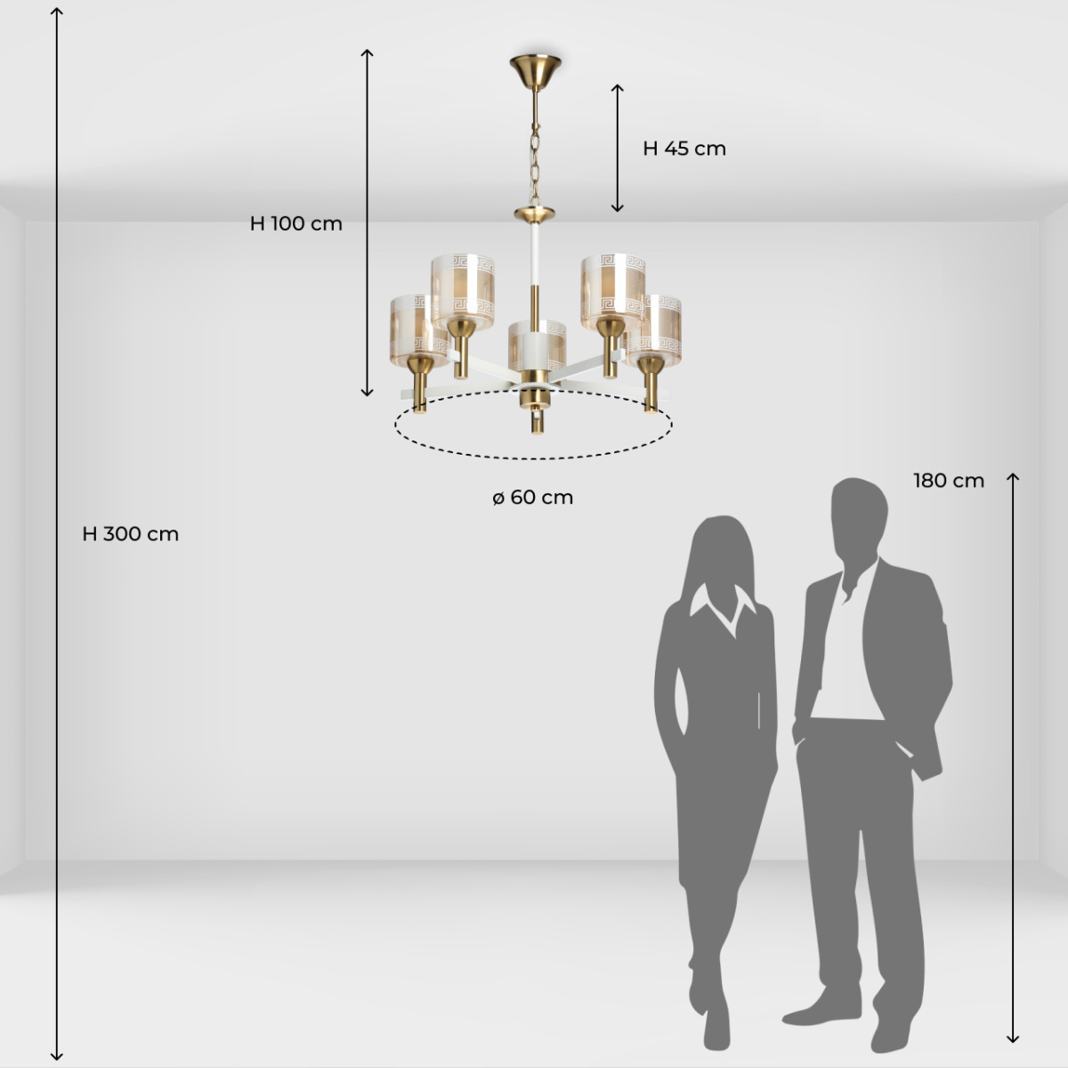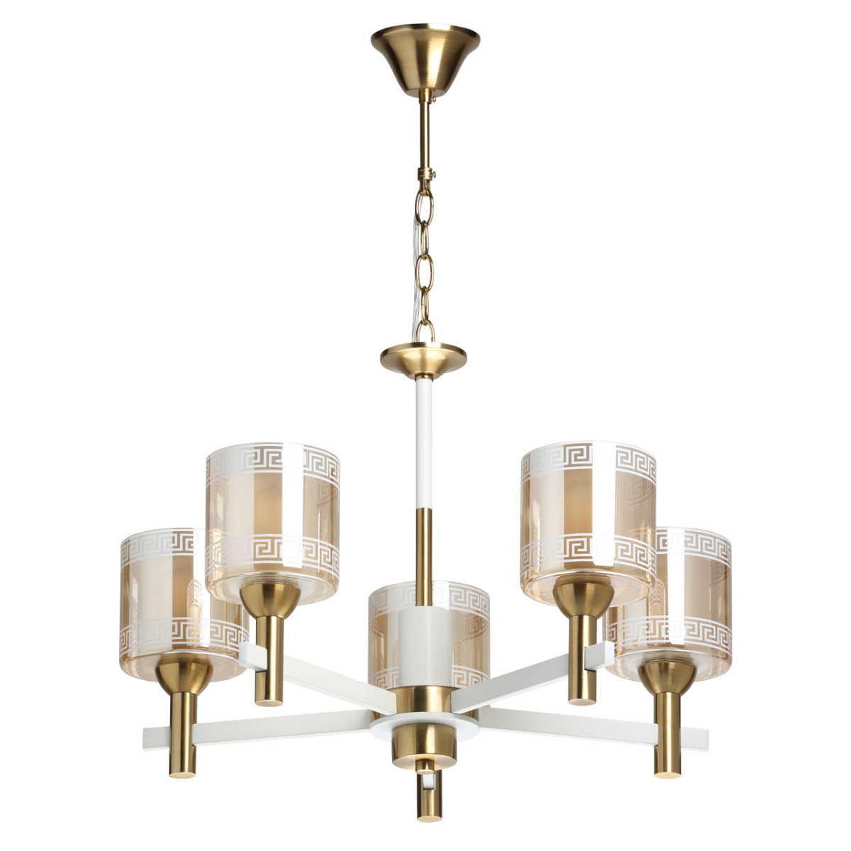 Металлическое основание подвесной люстры окрашено в белый цвет. Отдельные элементы основания гальванизированы в цвет золота. Источники света закрыты двойными стеклянными плафонами, где внутренний плафон матирован, а внешний плафон гальванизирован в цвет шампань. На внешние плафоны белой краской по трафарету нанесен орнамент в греческом стиле.