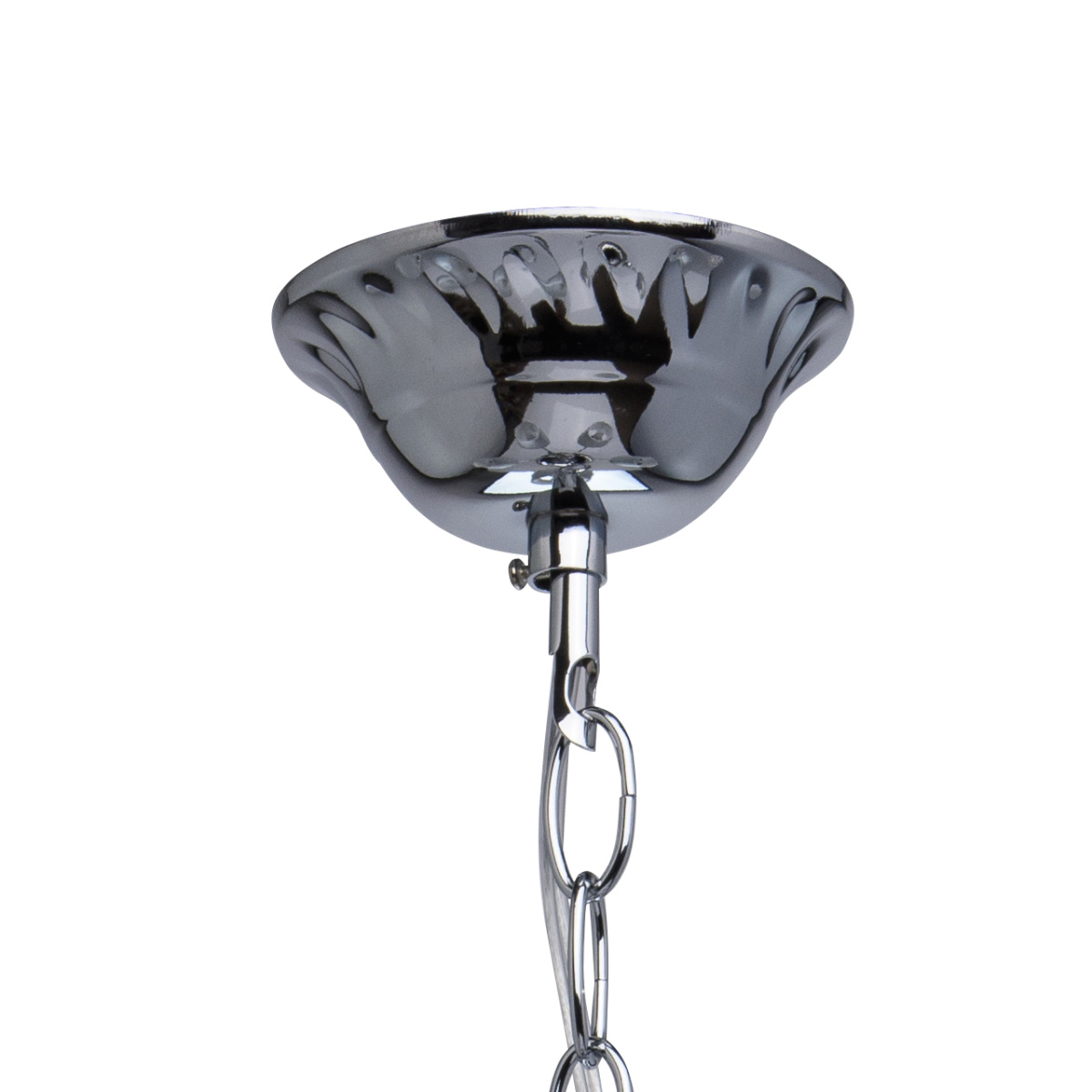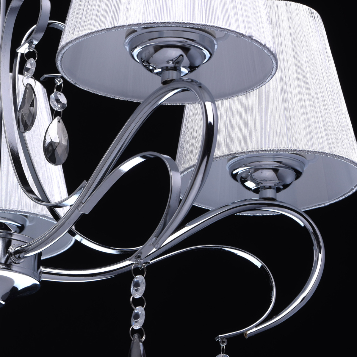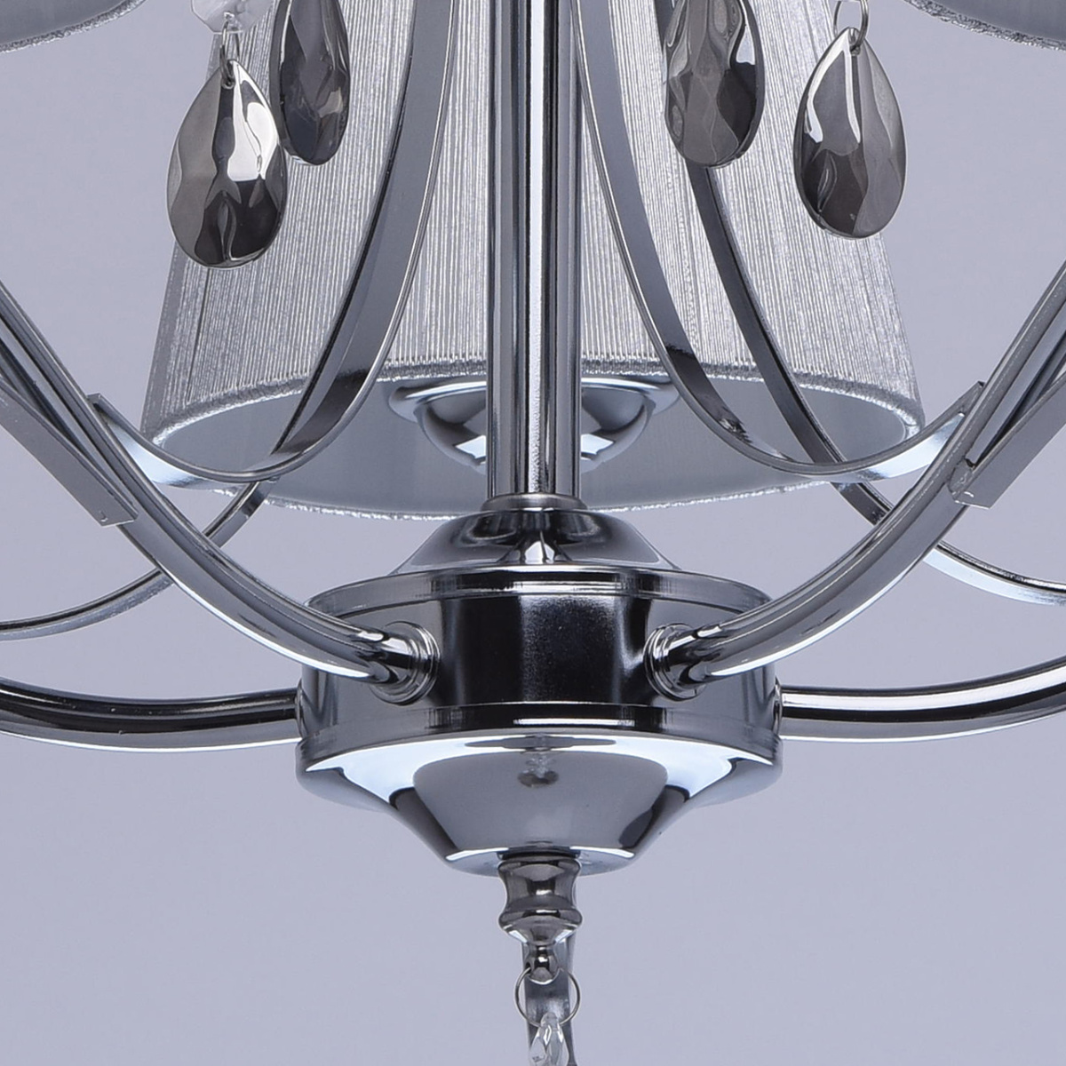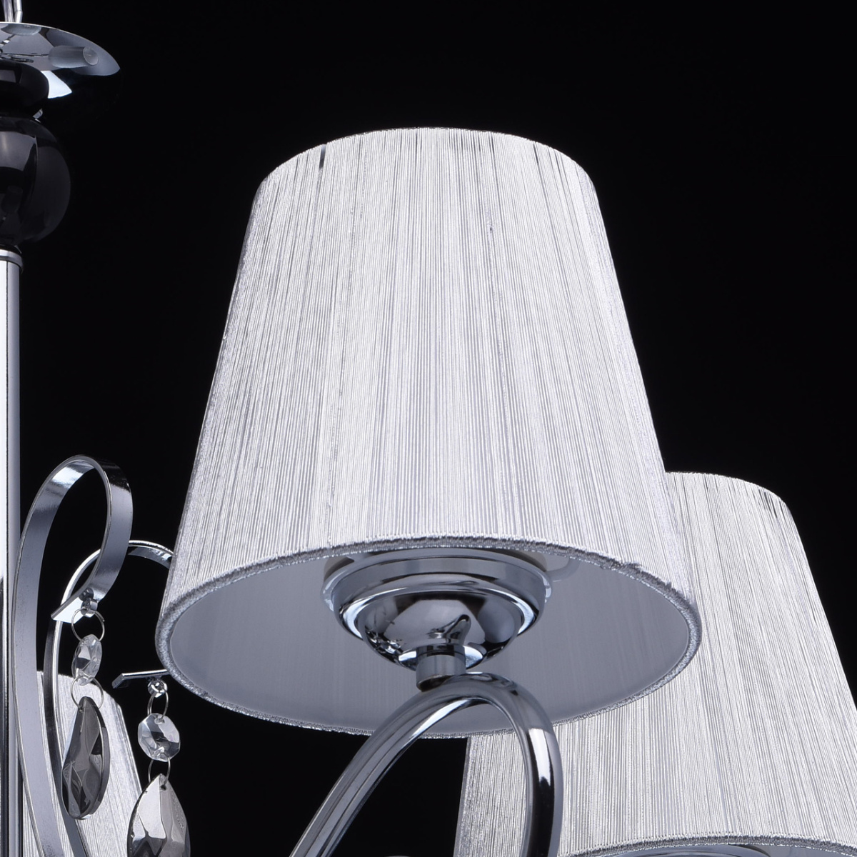 Основание светильника выполнено из металла и гальванизировано в цвет хрома. Рожки и декоративные элементы изящно изогнуты по технологии проката на роликовом станке. Центральный стержень светильника декорирован массивом из хрустального стекла, окрашенного в массе в черный цвет. Абажуры: выполнены из текстильных нитей стального цвета с термостойким акрилом внутри.Декор: подвески из прозрачного и гальванизированного в цвет антрацит декоративного стекла.