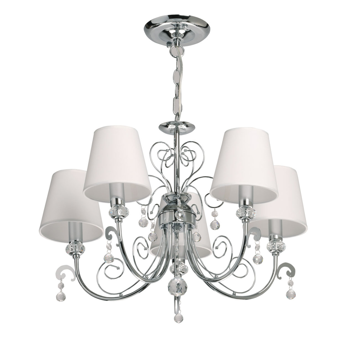 Металлическое основание подвесной люстры гальванизировано в цвет хрома. Источники света закрыты двухслойными текстильными абажурами белого цвета с термостойким акрилом внутри. Абажуры прошиты. Светильник декорирован прозрачным хрусталем.