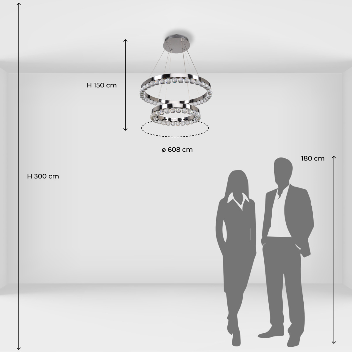 Металлическая потолочная чаша гальванизирована в цвет хрома. Корпус плафонов выполнен из нержавеющей стали, отполированной до зеркального блеска. Подвесная люстра декорирована прозрачным хрусталем в форме шаров.