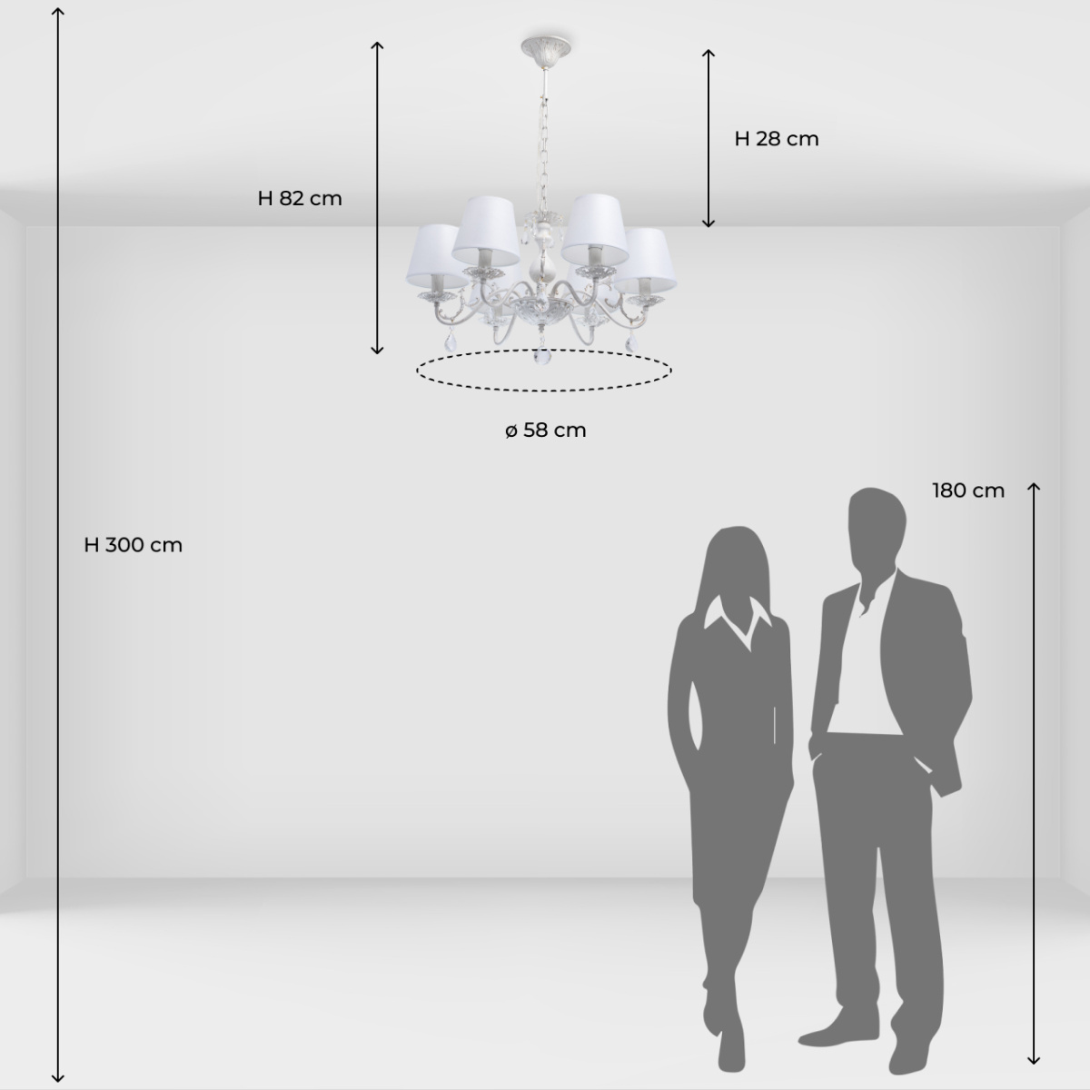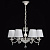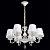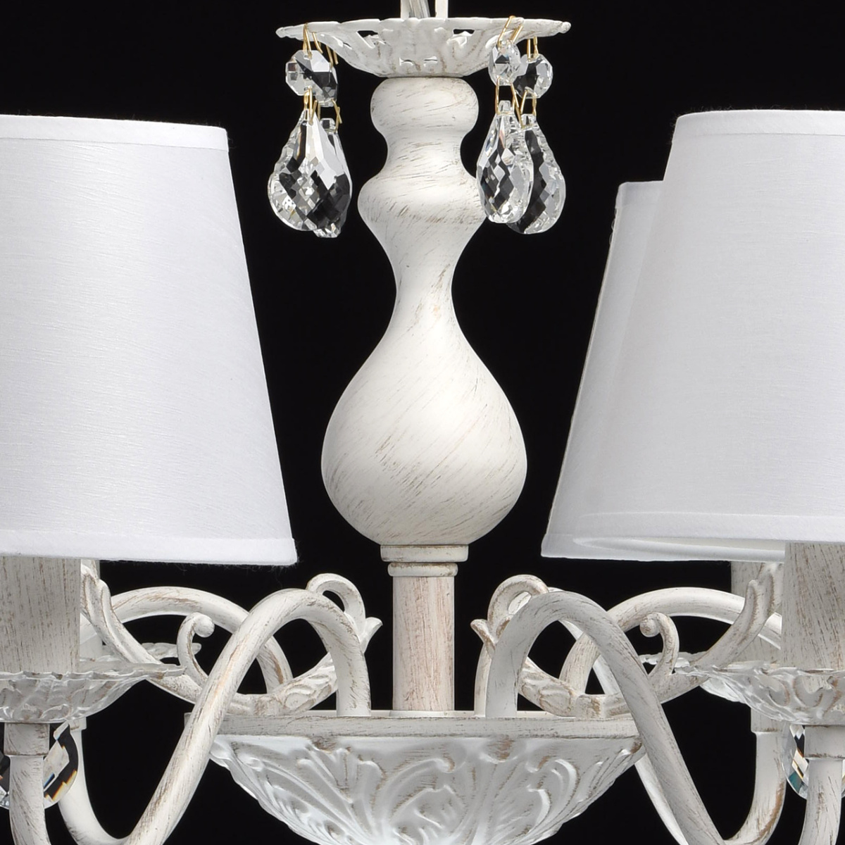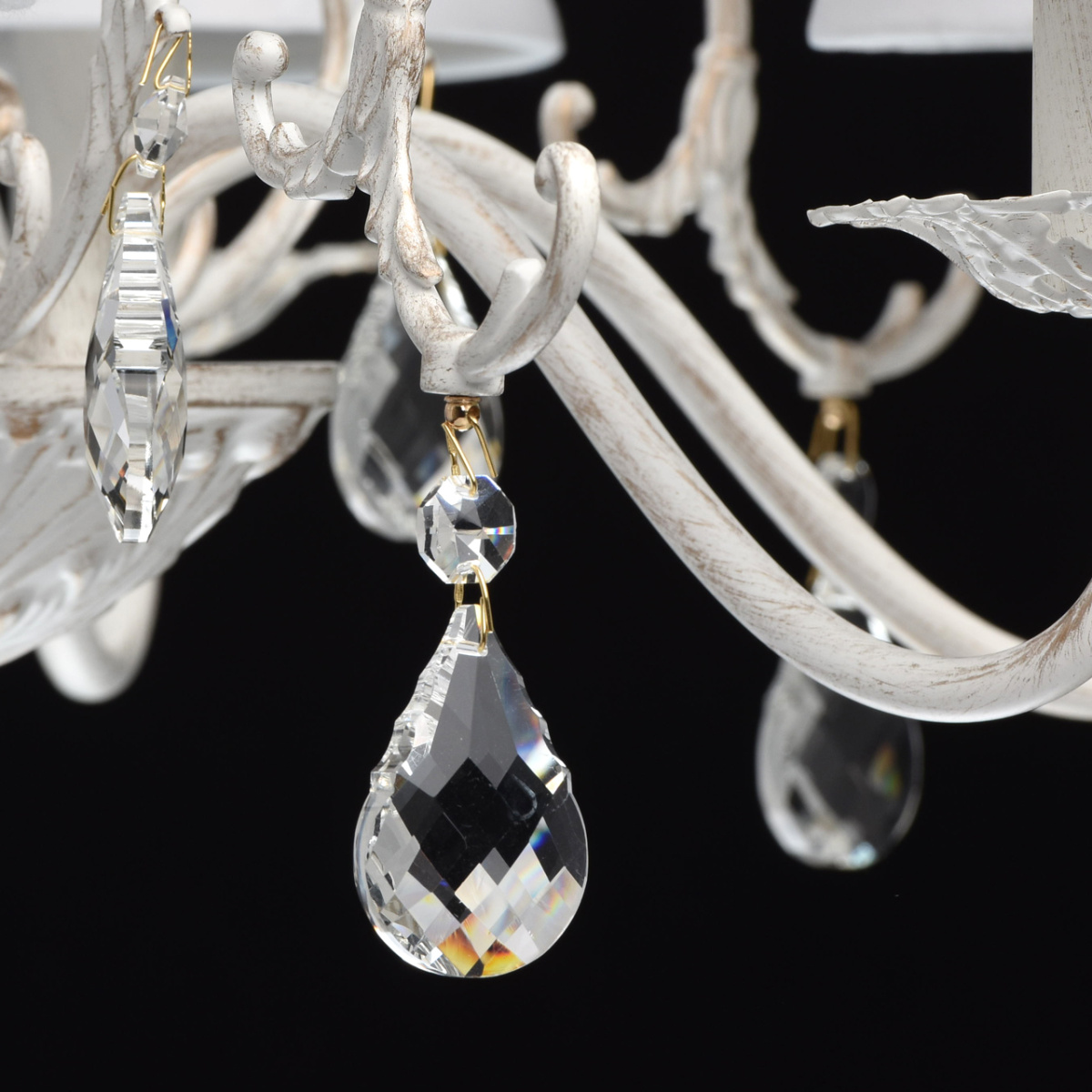 Основание светильника выполнено из комбинации сплавов металлов и применена технология двойного окрашивания в белый цвет с золотистой патиной. Потолочная чаша, декоративные розетки, корпус: металл, прессование.Центральный стержень: металл, обработка на токарном станке.Завитки: сплав алюминия, художественное литье.Рожки: металл, прокат на роликовом станке.Светильник декорирован текстильными абажурами белого цвета. Края абажуров декорированы тесьмой золотого цвета.Декор: прозрачный хрусталь: дубовый лист, октагон, шар.