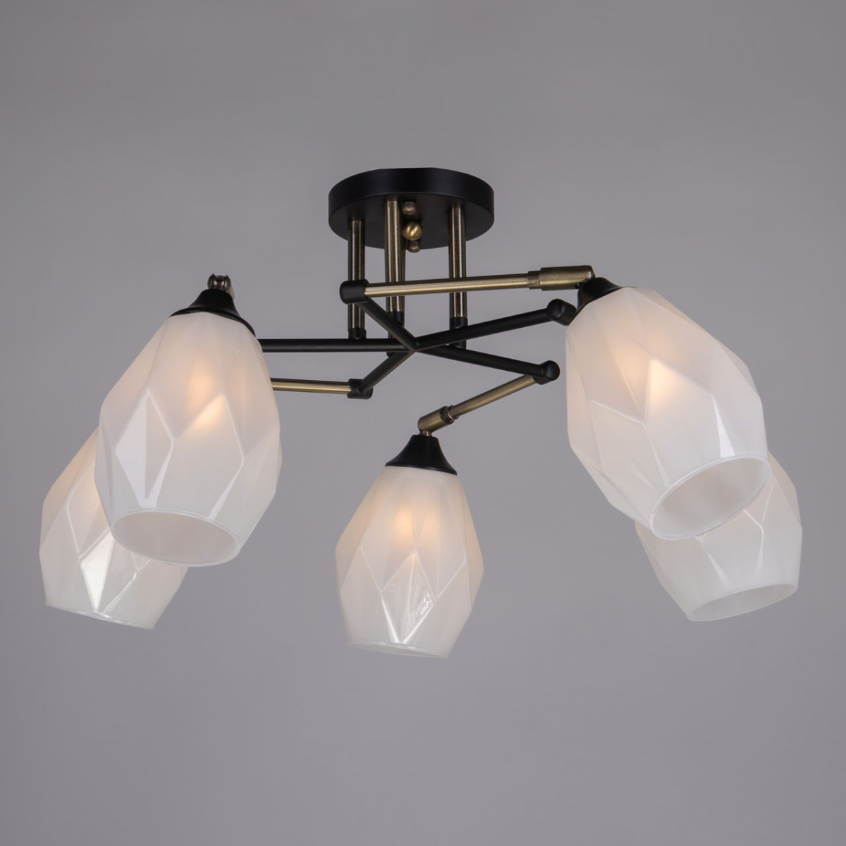 Металлическое основание потолочной люстры окрашено в черный цвет. Отдельные элементы основания гальванизированы в цвет античной бронзы. Потолочная люстра декорирована белыми стеклянными плафонами сложной формы.