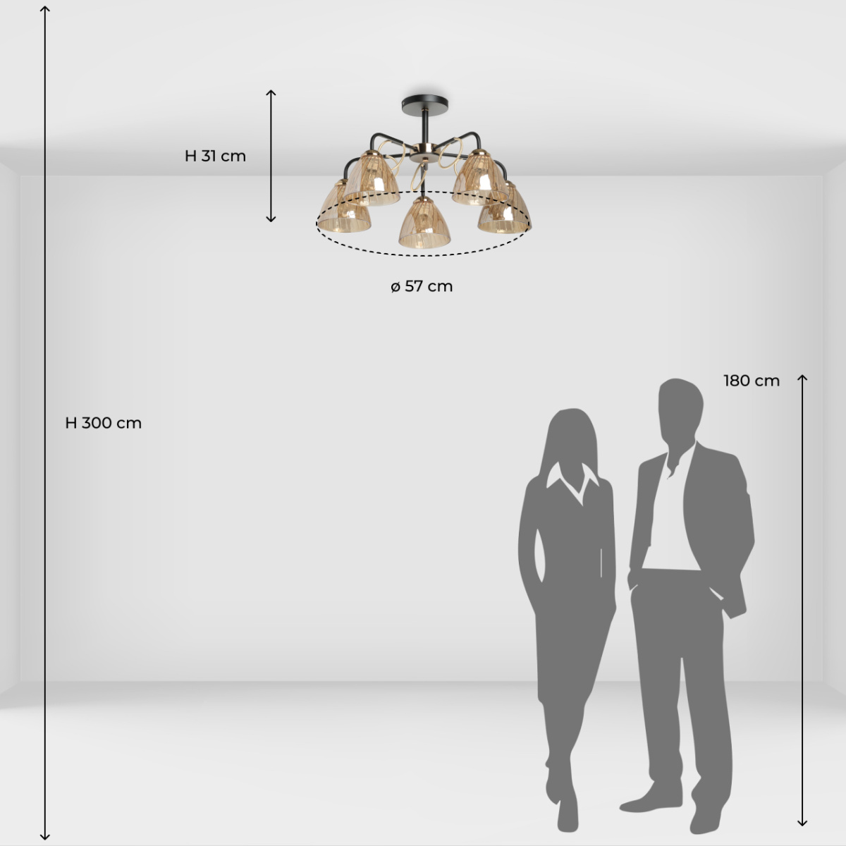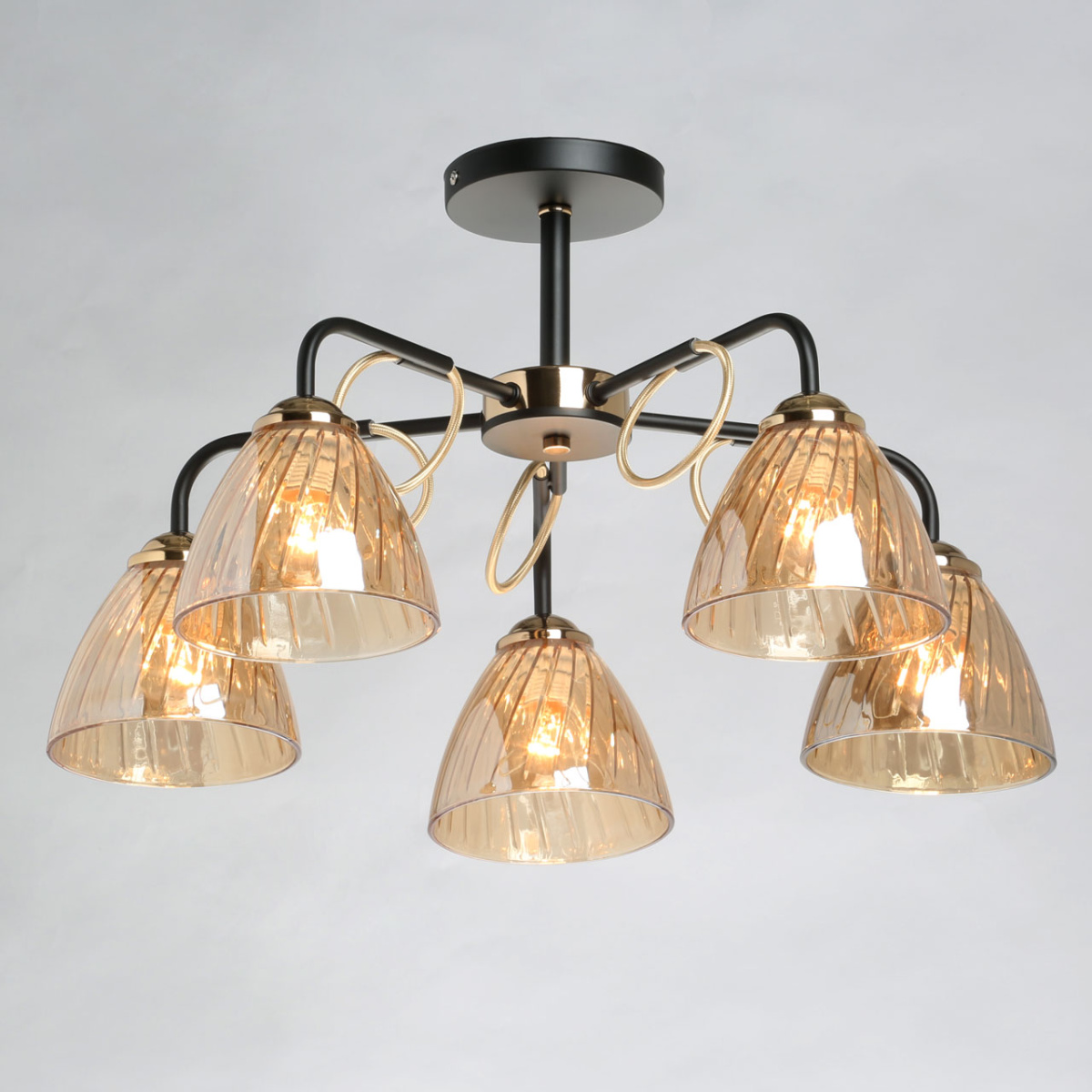 Металлическое основание потолочного светильника окрашено в черный цвет. Отдельные элементы гальванизированы в цвет золота. Стеклянные плафоны выдуваются в сложную форму и гальванизированы в цвет шампань