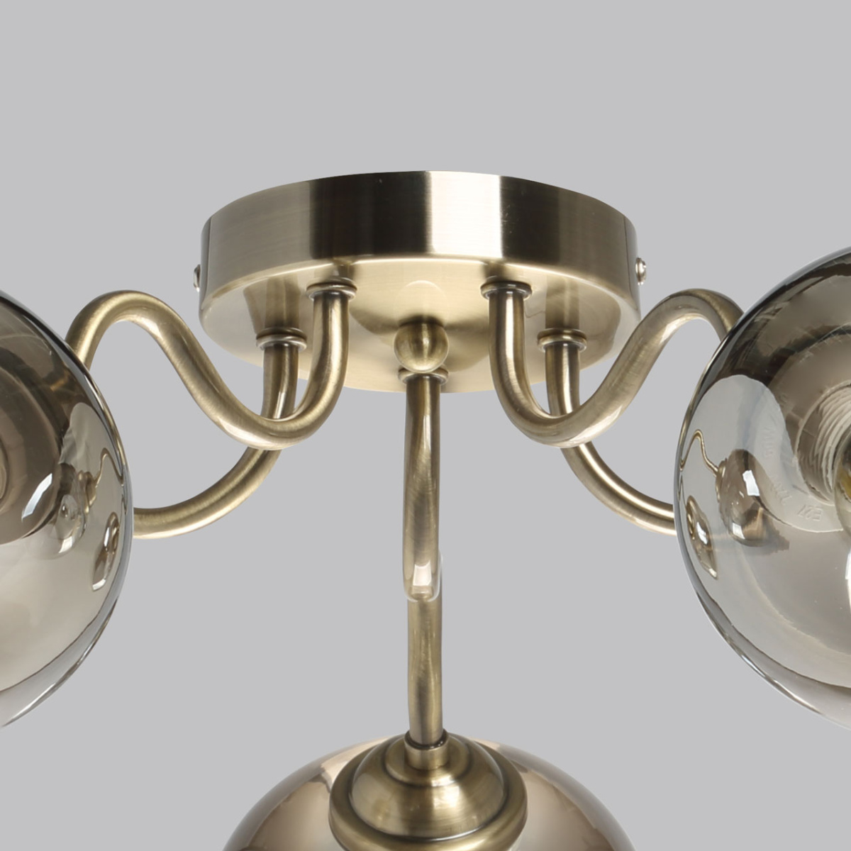 Металлическое основание потолочного светильника гальванизировано в цвет античной бронзы. Стеклянные плафоны выдуваются в форму и градиентно гальванизированы в цвет бронзы. Градиент уменьшается от основания плафона к внешнему краю.