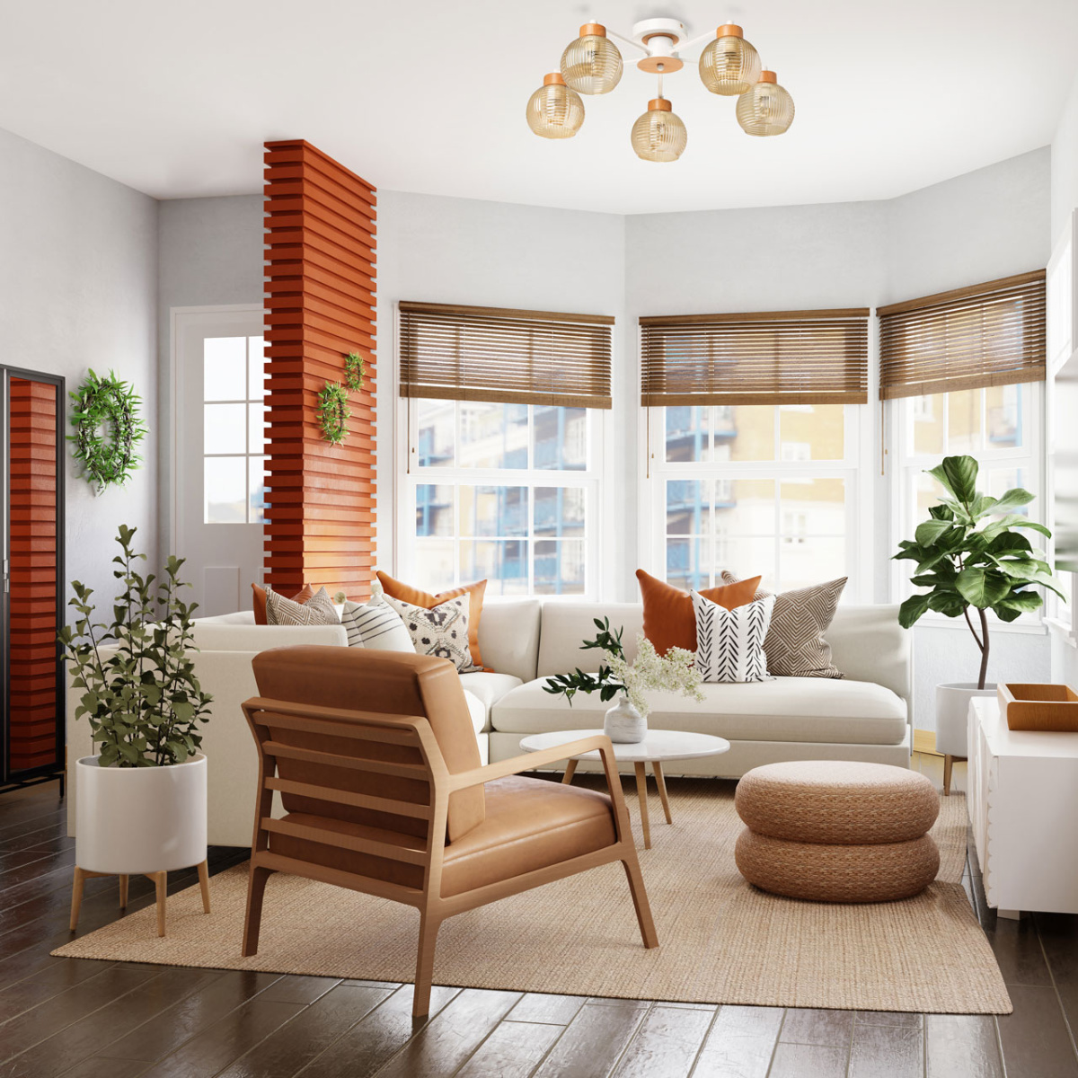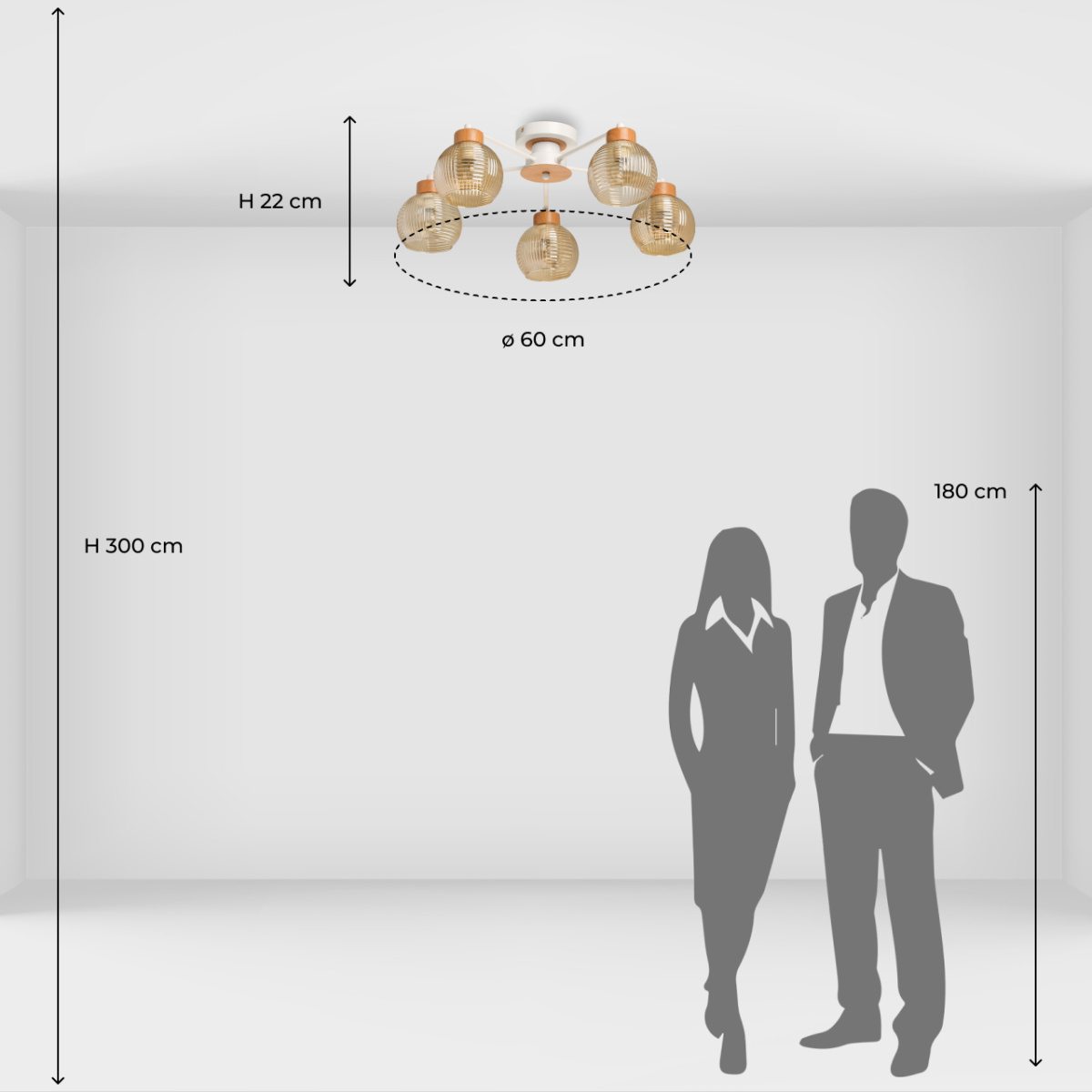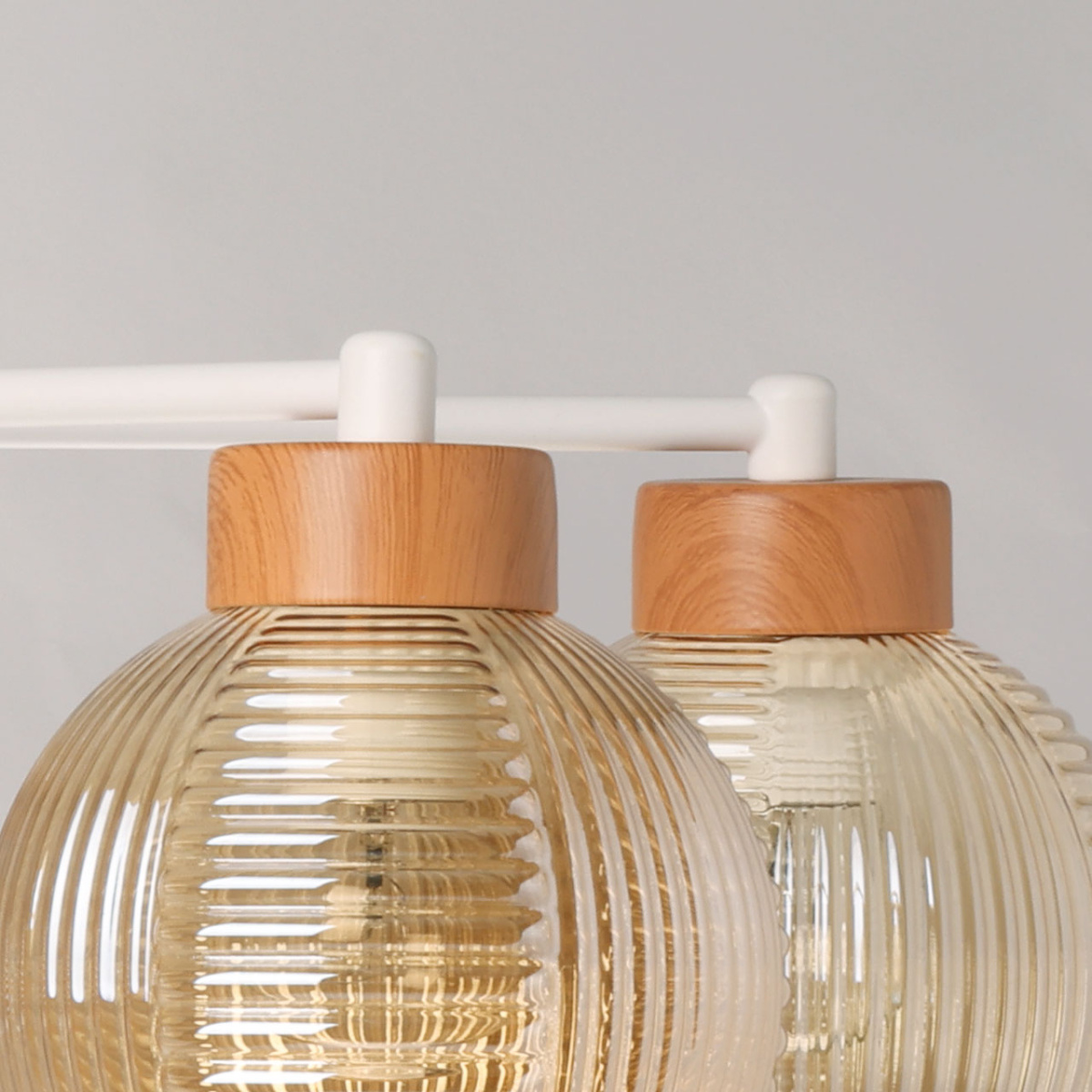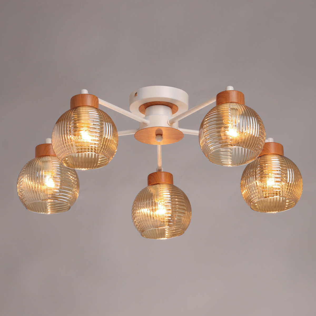 Металлическое основание потолочной люстры окрашено в белый цвет. Фактурные стеклянные плафоны, гальванизированные в цвет коньяк, выдуваются в форму вручную. Люстра декорирована металлическими элементами, имитирующими светлое дерево по технологии иммерсионной печати.