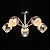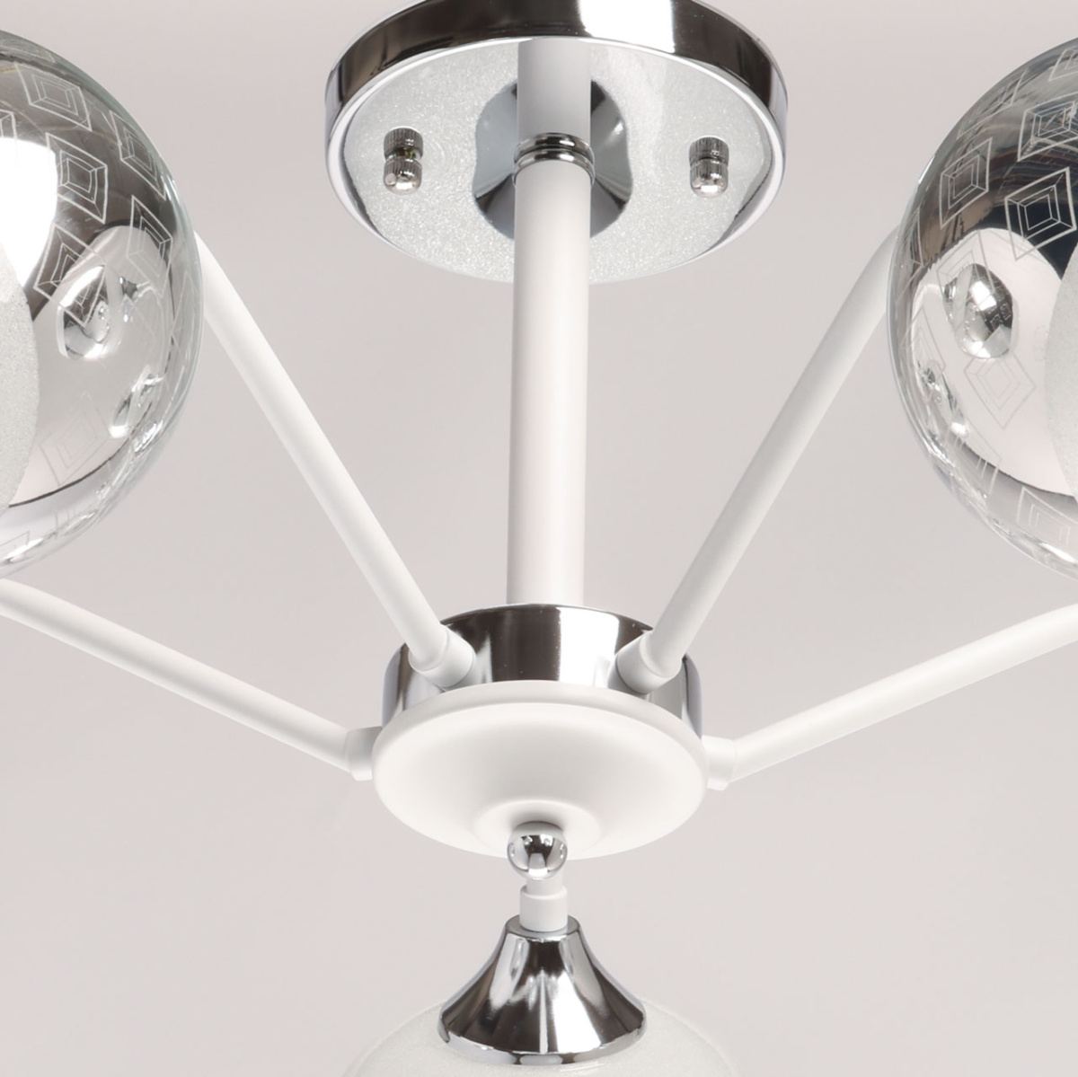 Металлическое основание потолочной люстры окрашено в белый цвет. Отдельные элементы основания гальванизированы в цвет хрома. Выдувные вручную стеклянные плафоны гальванизированы в дымчатый цвет и окрашены в белый цвет по трафарету. Край плафонов оплавлен. С внутренней стороны плафоны декорированы белой стеклянной крошкой.