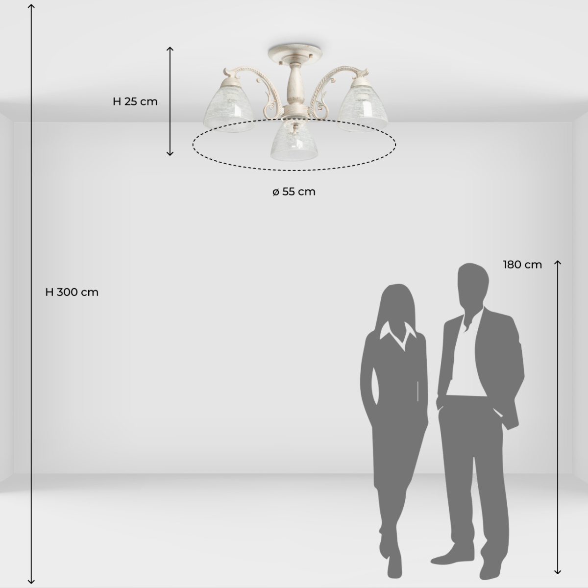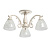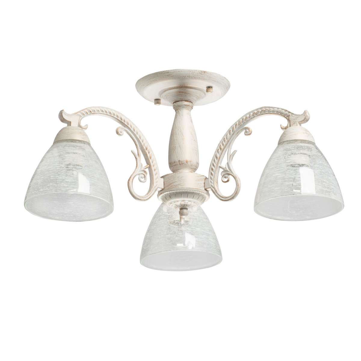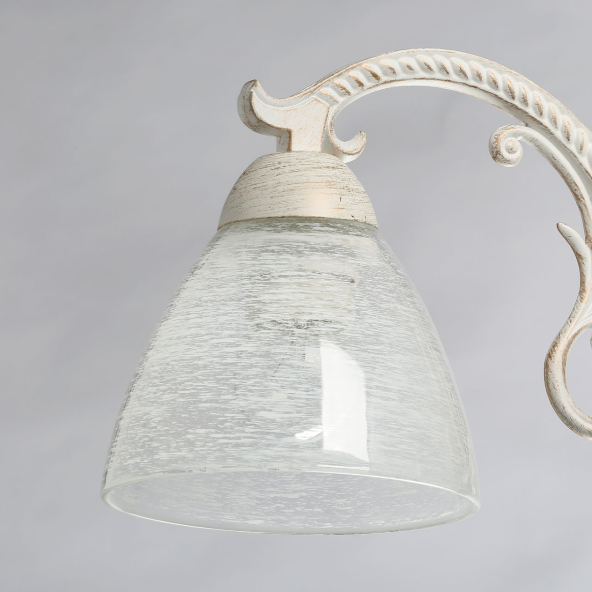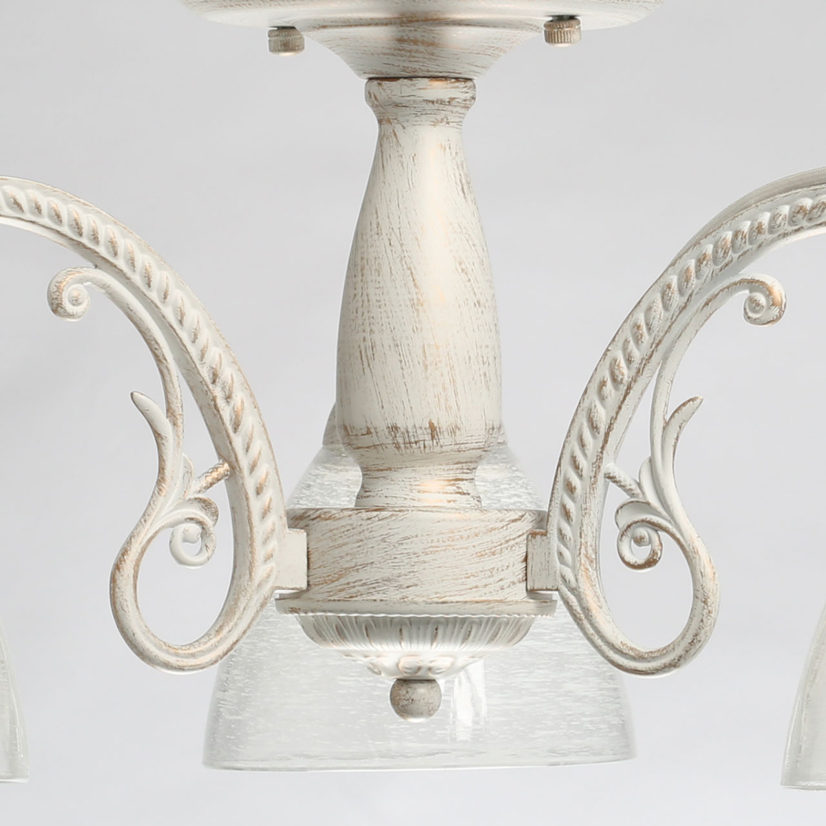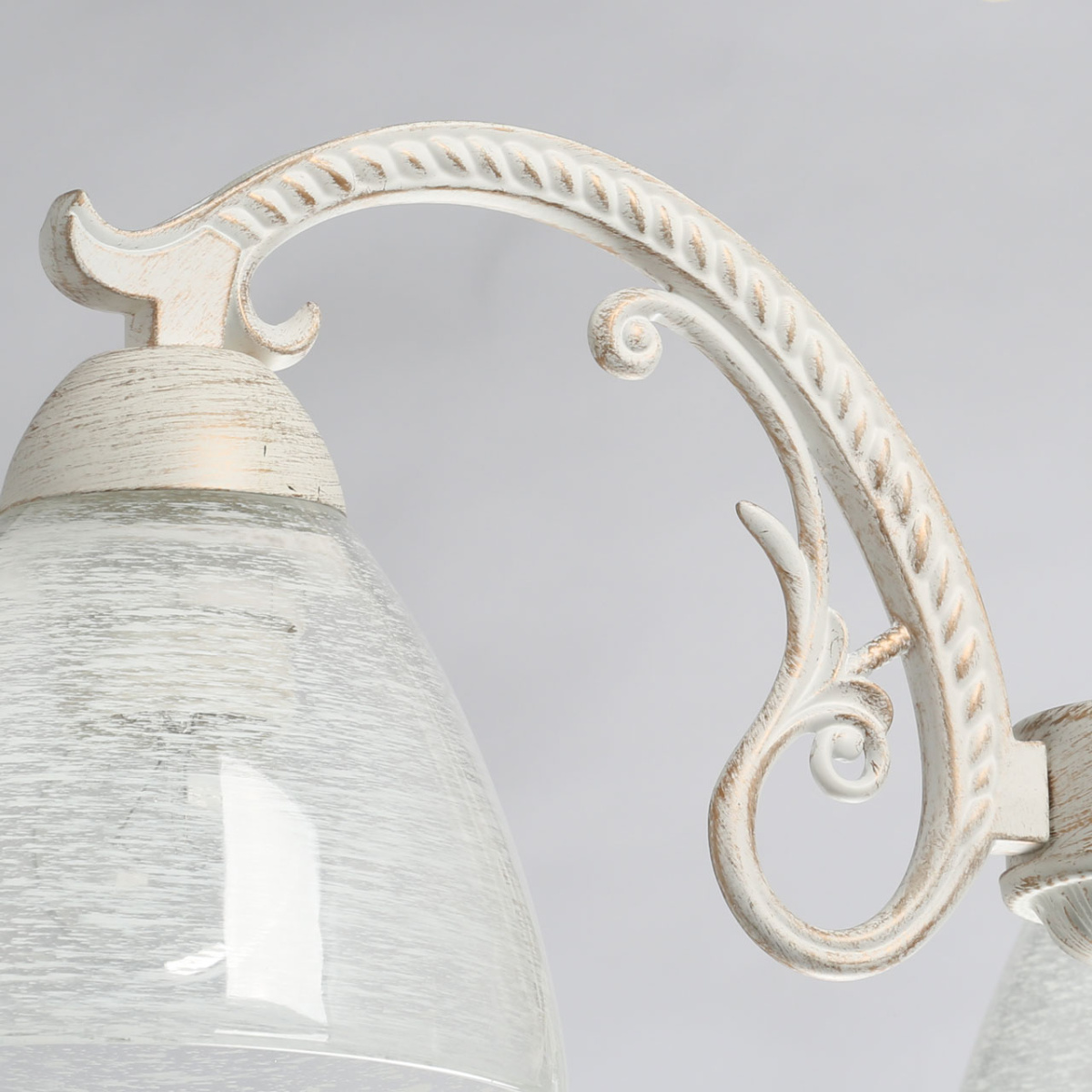 Основание светильника выполнено из комбинации сплавов металлов и обработано по технологии хай-лайт, где основной слой белого цвета, а декоративный слой - золотого. Рожки выполнены из сплава алюминия по технологии художественного литья. На стеклянные плафоны нанесен рисунок белой краской в виде паутинки.