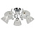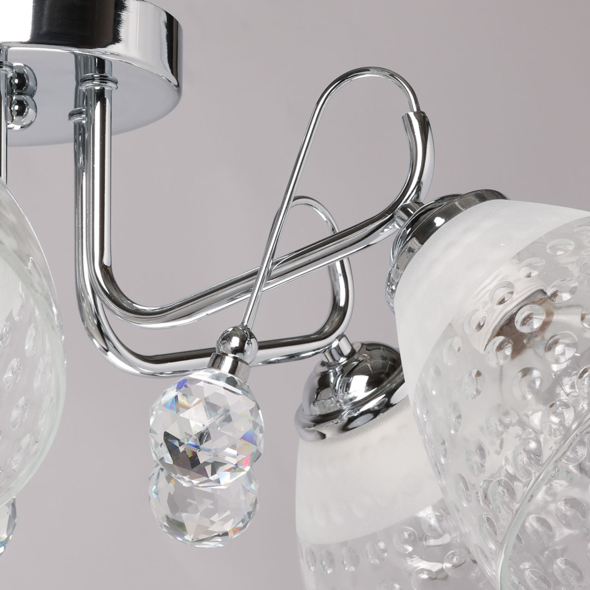Металлическое основание потолочной люстры гальванизировано в цвет хрома. Плафоны из прозрачного фактурного стекла окрашены в белый цвет у основания. Люстра декорирована прозрачным хрусталем в форме шара.