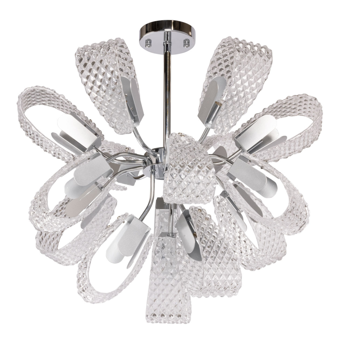 Металлическое основание люстры гальванизировано в цвет хрома. Светильник декорирован оригинальными плафонами из прозрачного фактурного стекла.