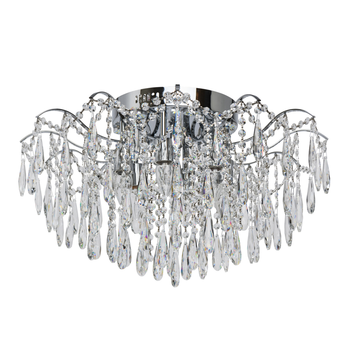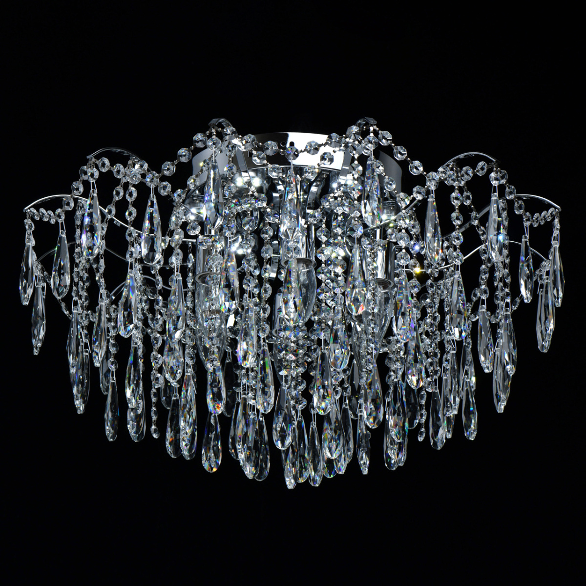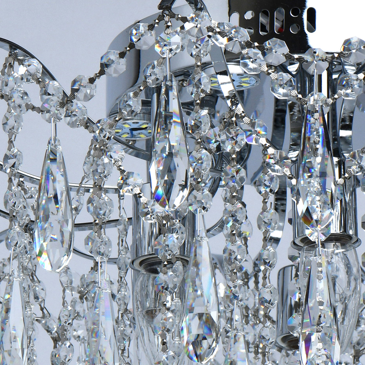 Основание светильника выполнено из металла и гальванизировано в цвет хрома. Светильник декорирован прозрачным хрусталем формы октагон и капля.