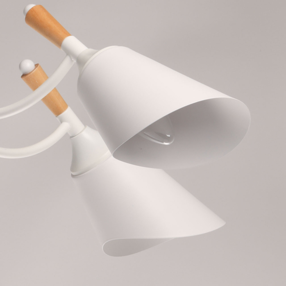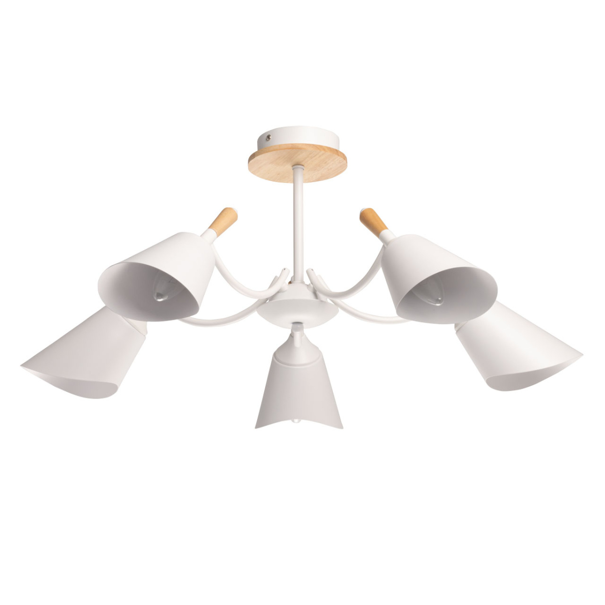 Металлическое основание потолочной люстры окрашено в белый цвет. Металлические плафоны с окрашены в белый цвет. Потолочная люстра декорирована элементами из светлого натурального дерева.