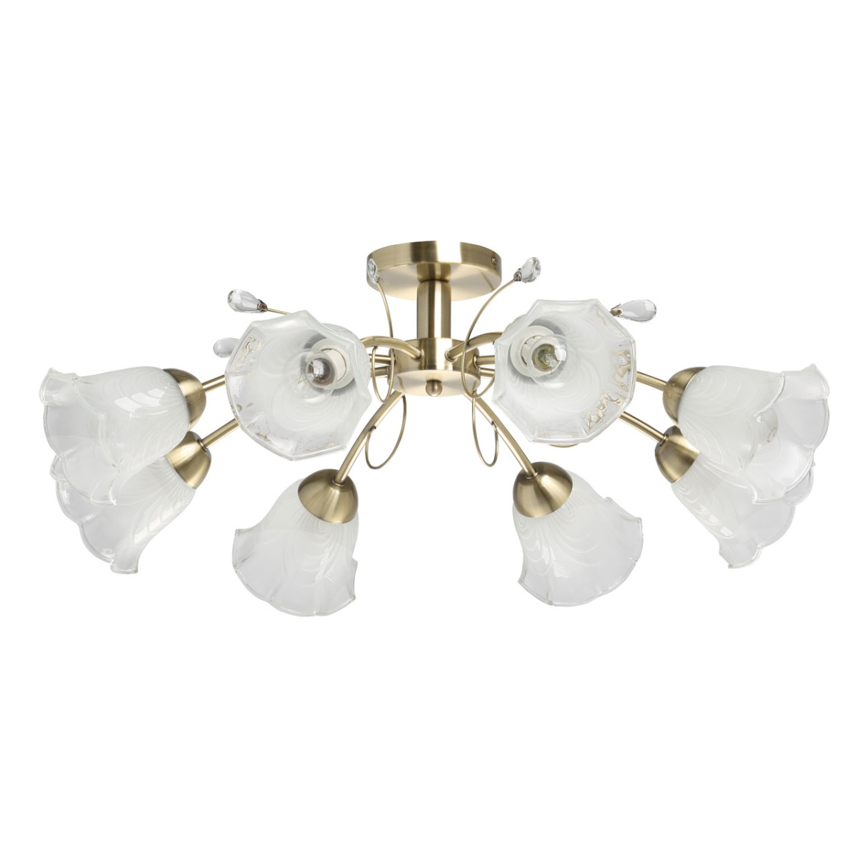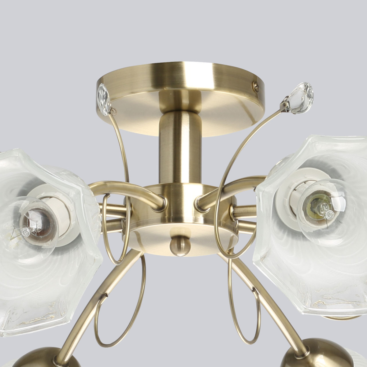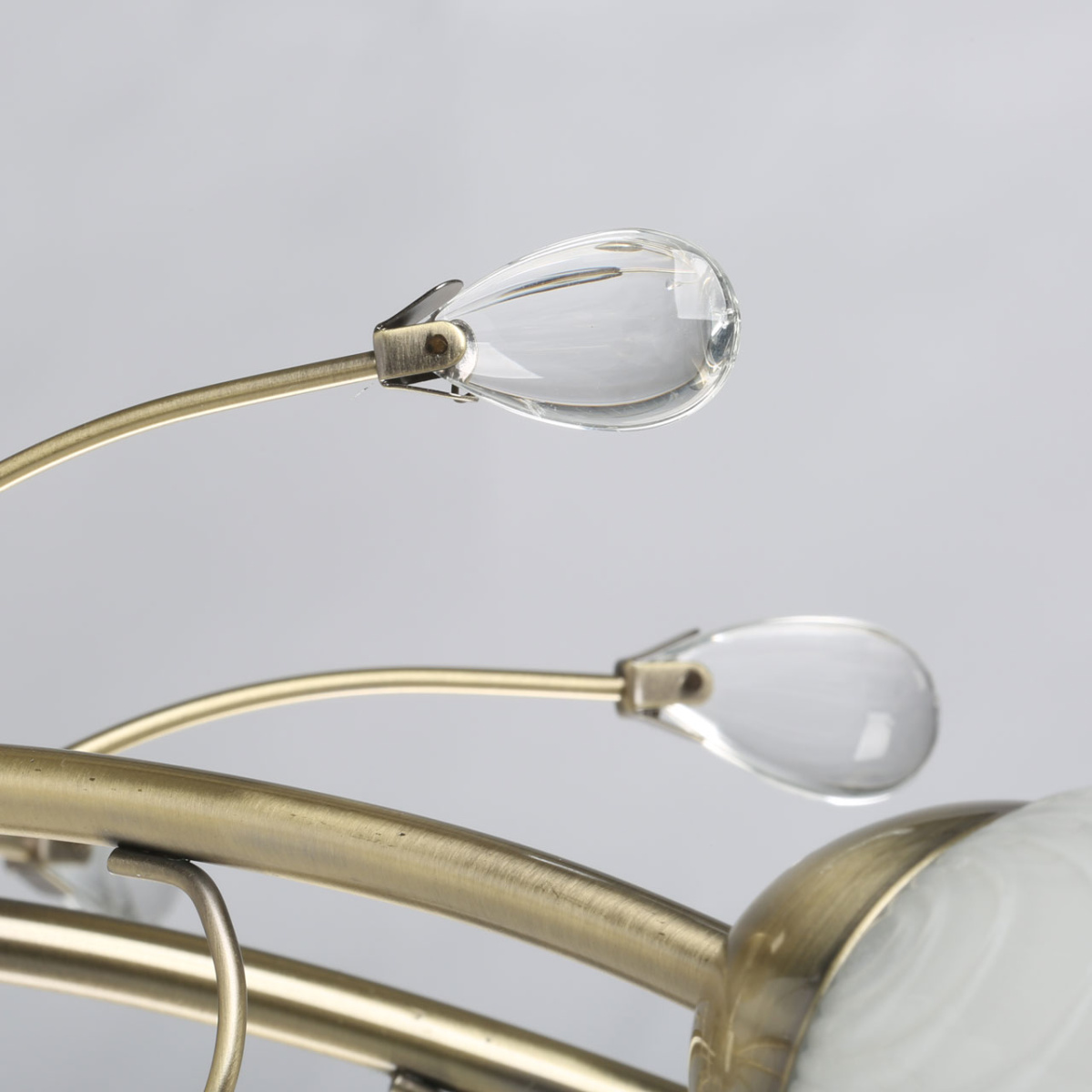 Металлическое основание потолочного светильника гальванизировано в цвет античной бронзы. Стеклянные плафоны отлиты в сложную форму и матированы. Светильник декорирован хрустальным стеклом миндальной формы.