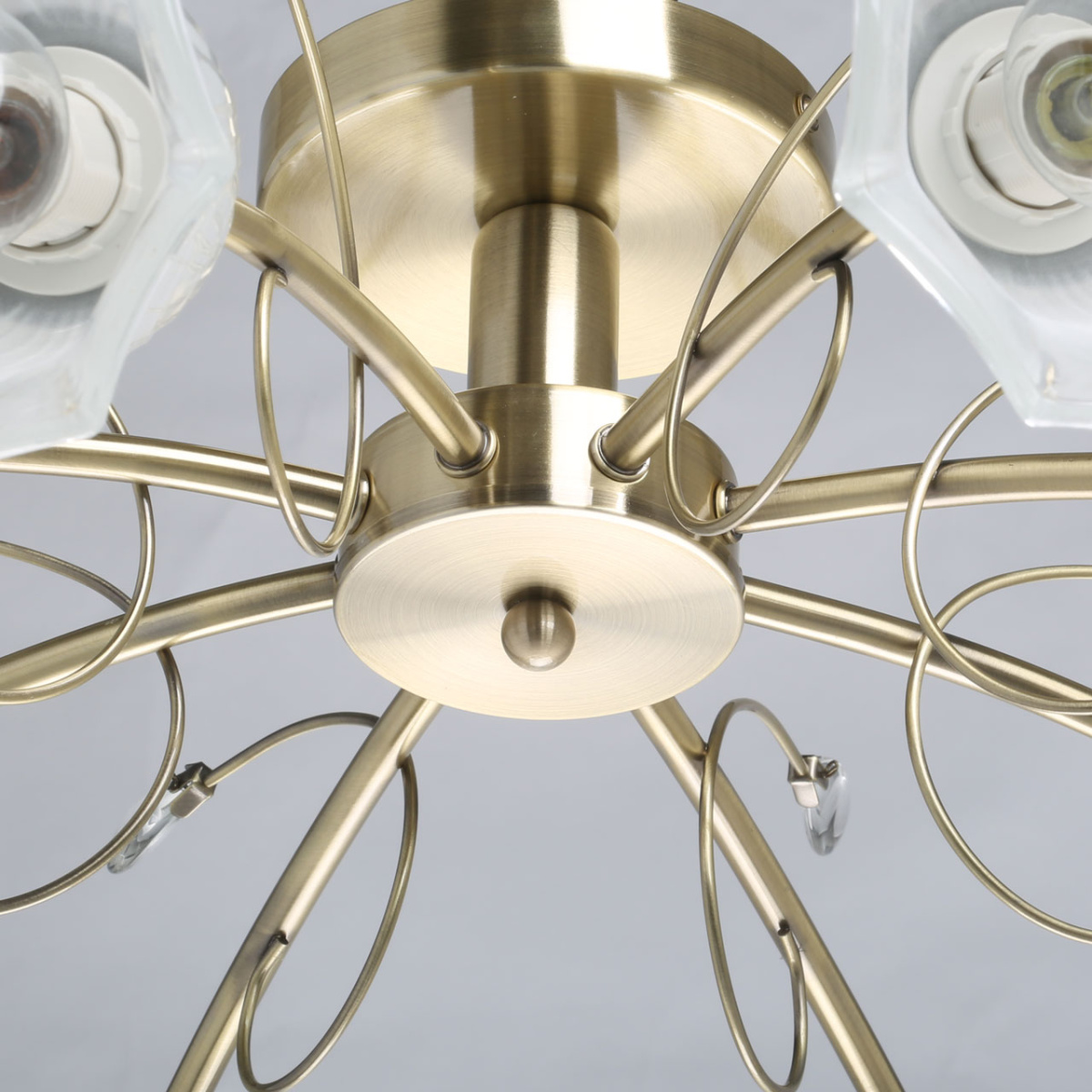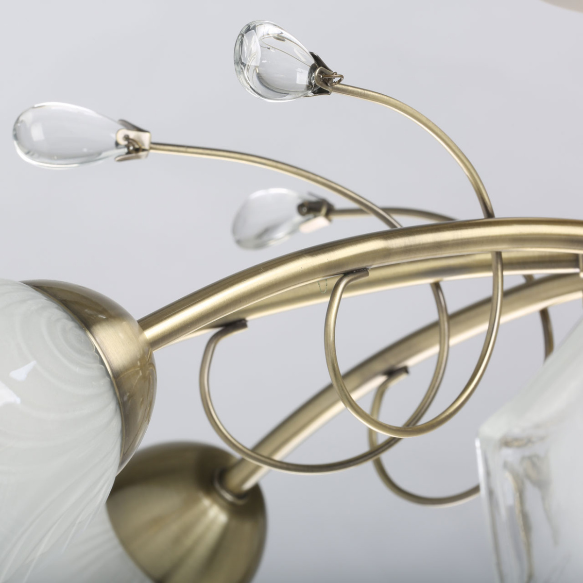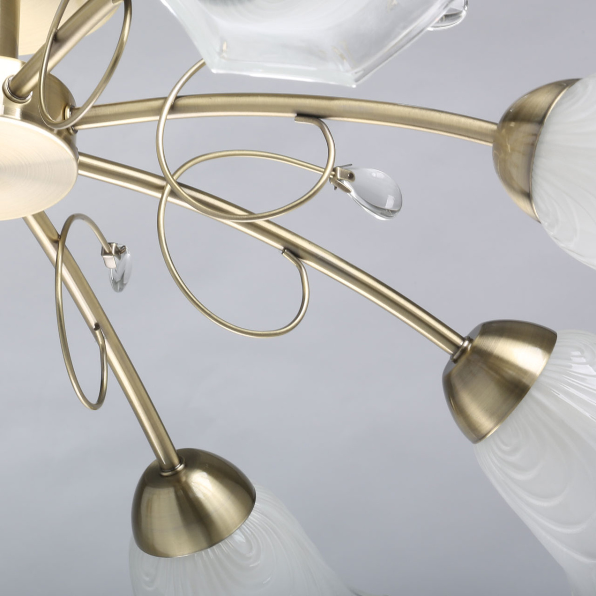 Металлическое основание потолочного светильника гальванизировано в цвет античной бронзы. Стеклянные плафоны отлиты в сложную форму и матированы. Светильник декорирован хрустальным стеклом миндальной формы.
