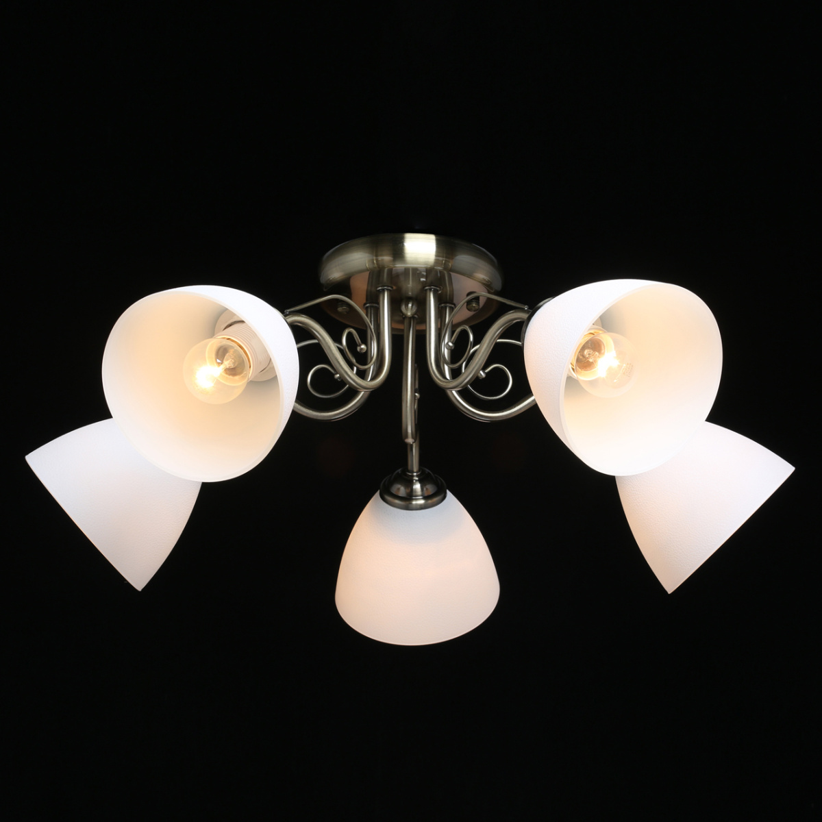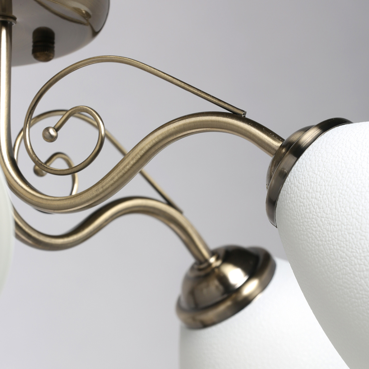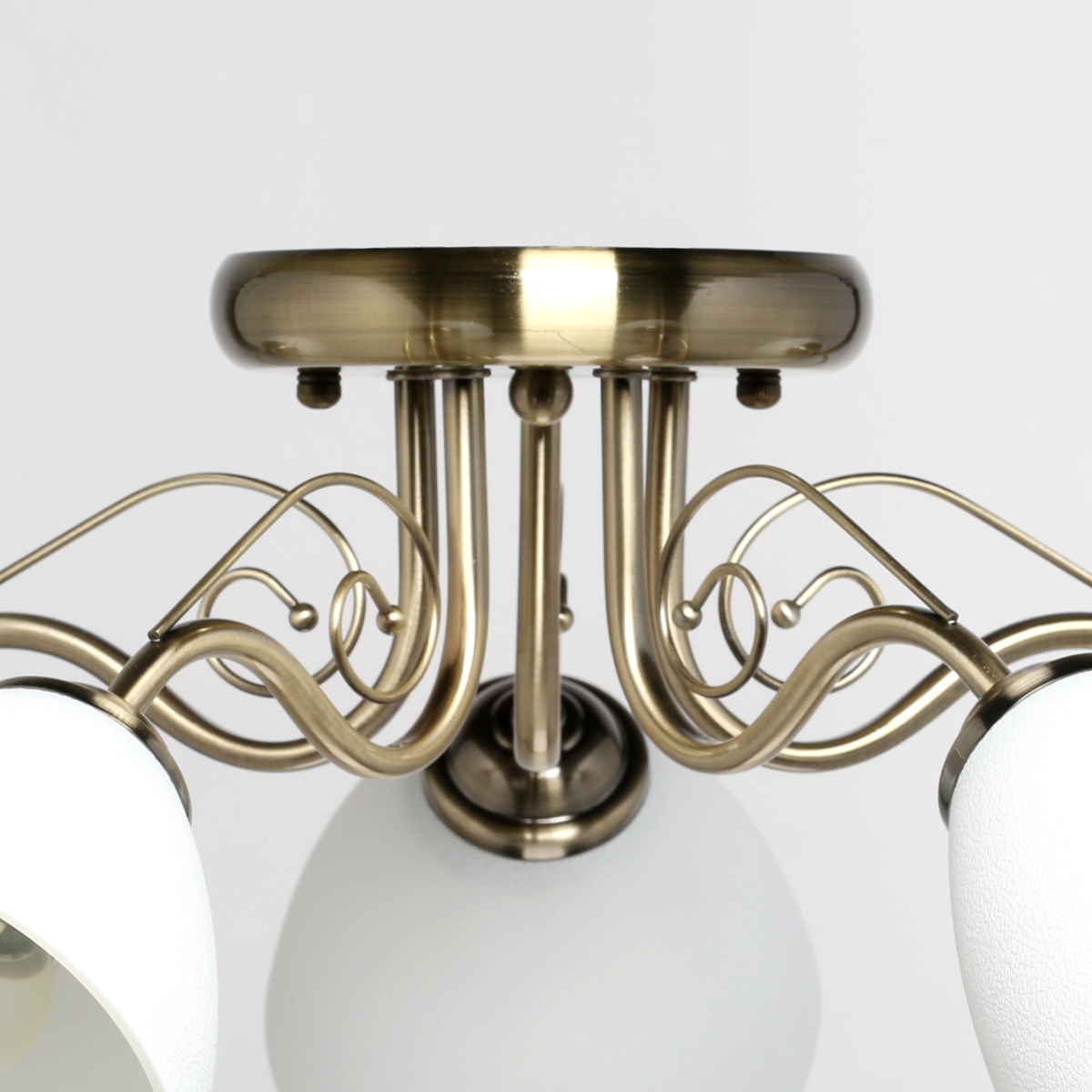 Основание светильника выполнено из металла и гальванизировано в цвет античной бронзы. Светильник декорирован стеклянными плафонами белого цвета.
