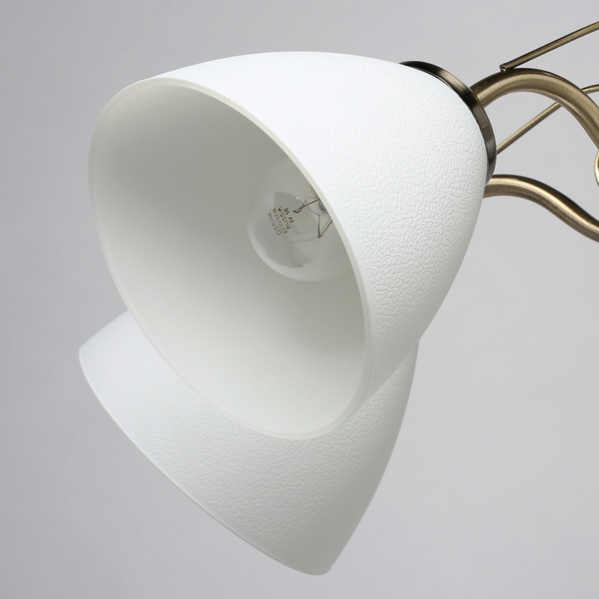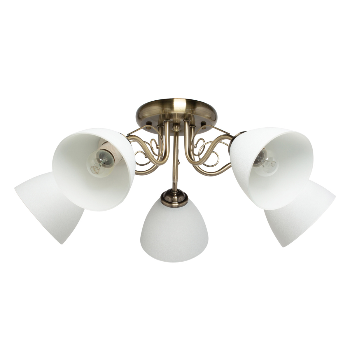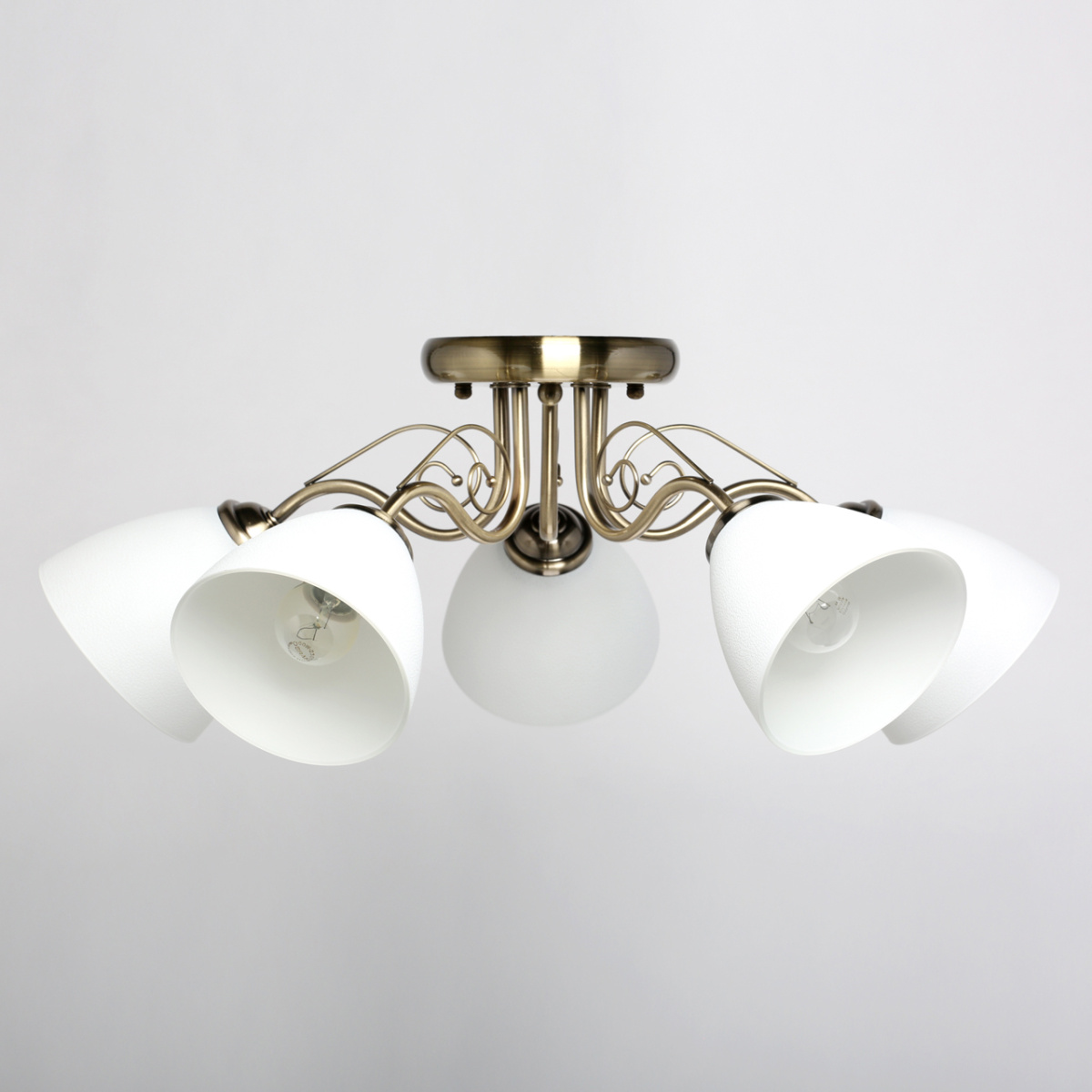 Основание светильника выполнено из металла и гальванизировано в цвет античной бронзы. Светильник декорирован стеклянными плафонами белого цвета.