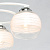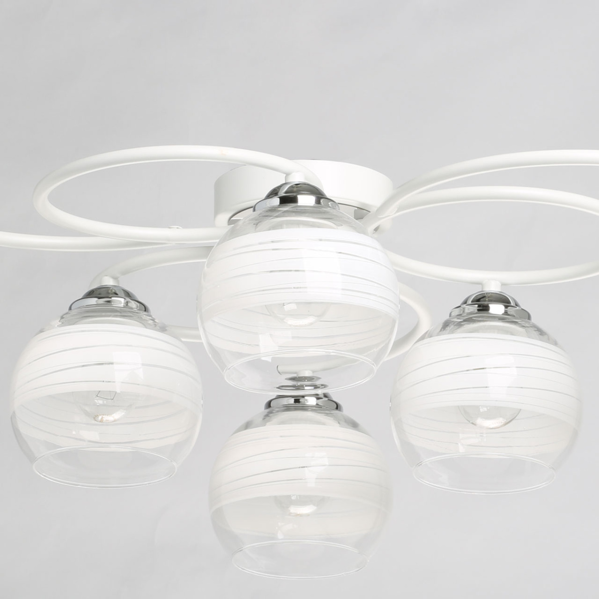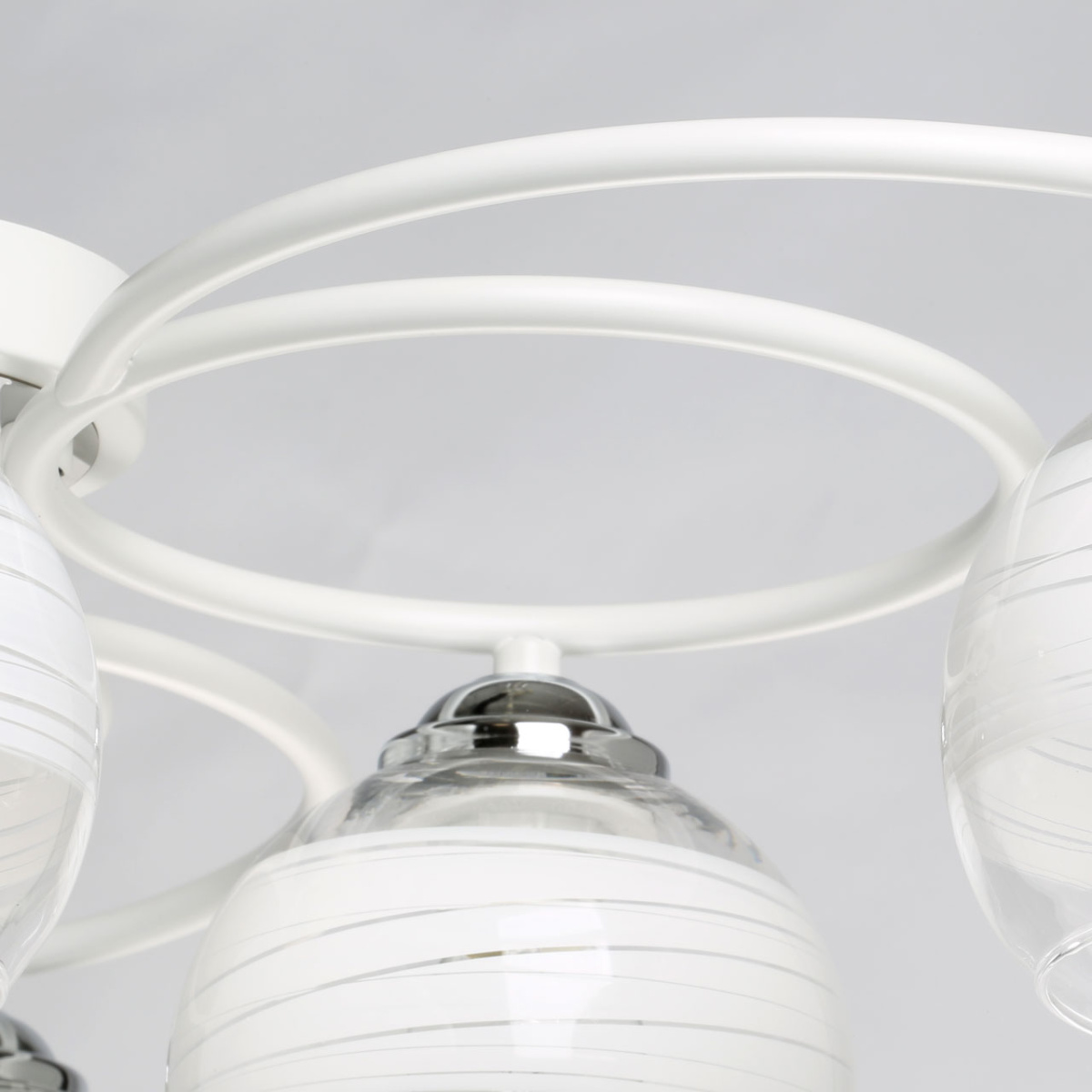 Металлическое основание потолочного светильника гальванизировано в цвет хрома. Отдельные элементы окрашены в белый цвет. Светильник декорирован выдувными вручную стеклянными плафонами. На плафоны нанесен рисунок в виде параллельных полос белого цвета.