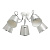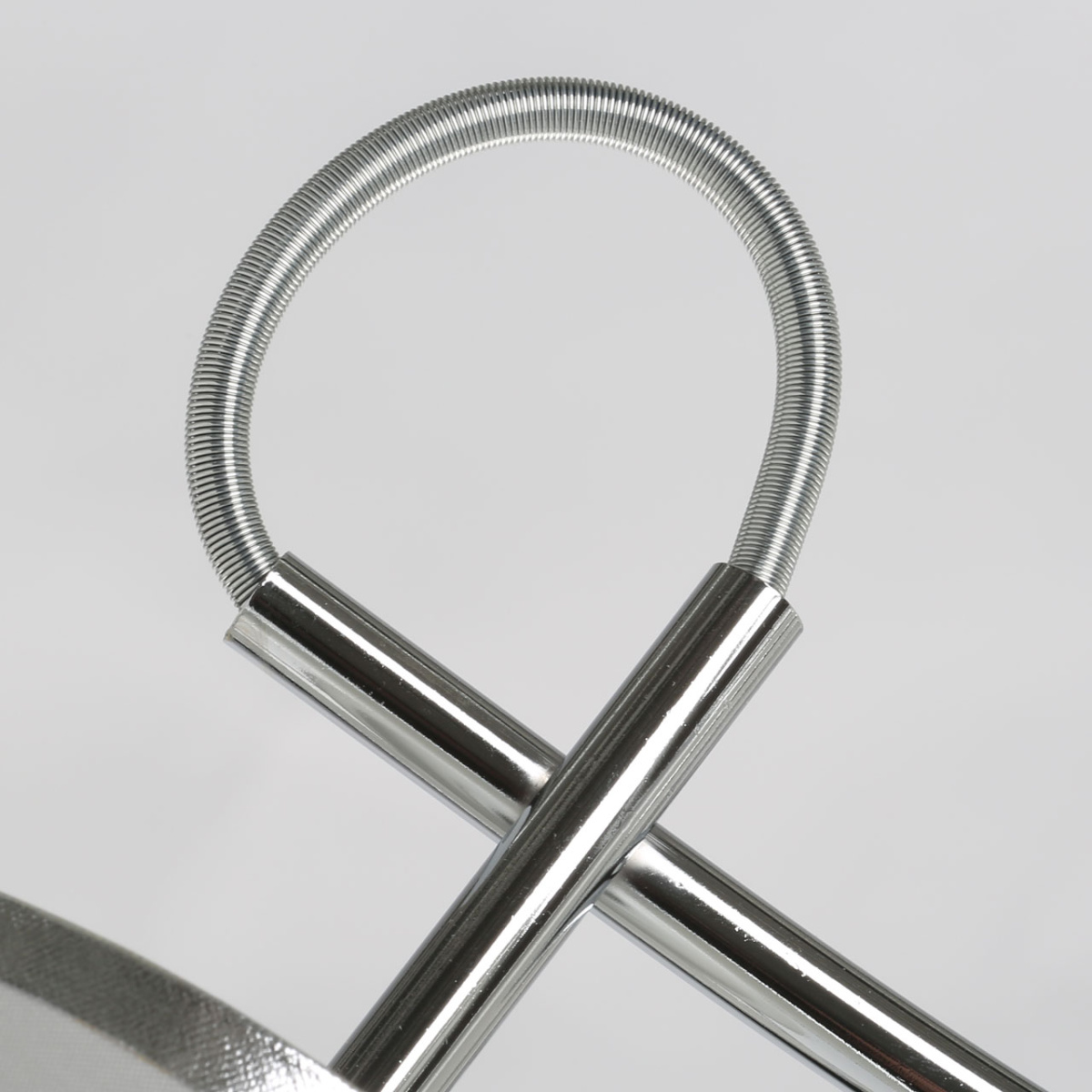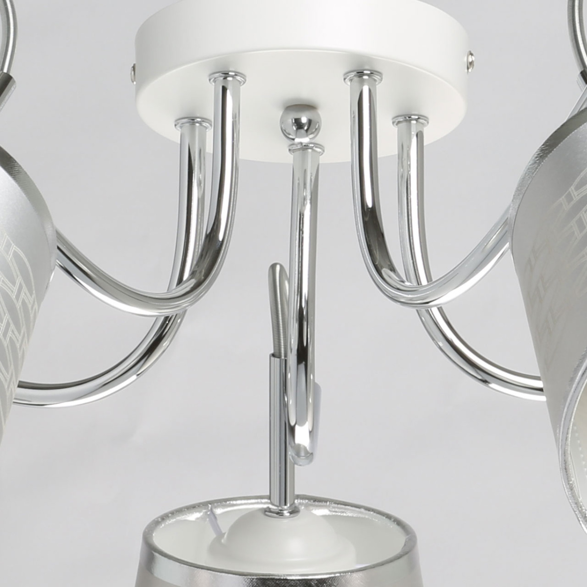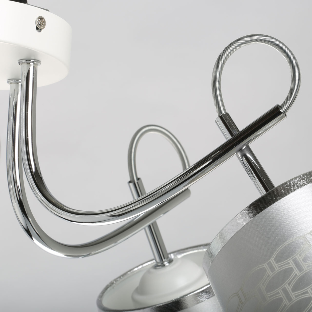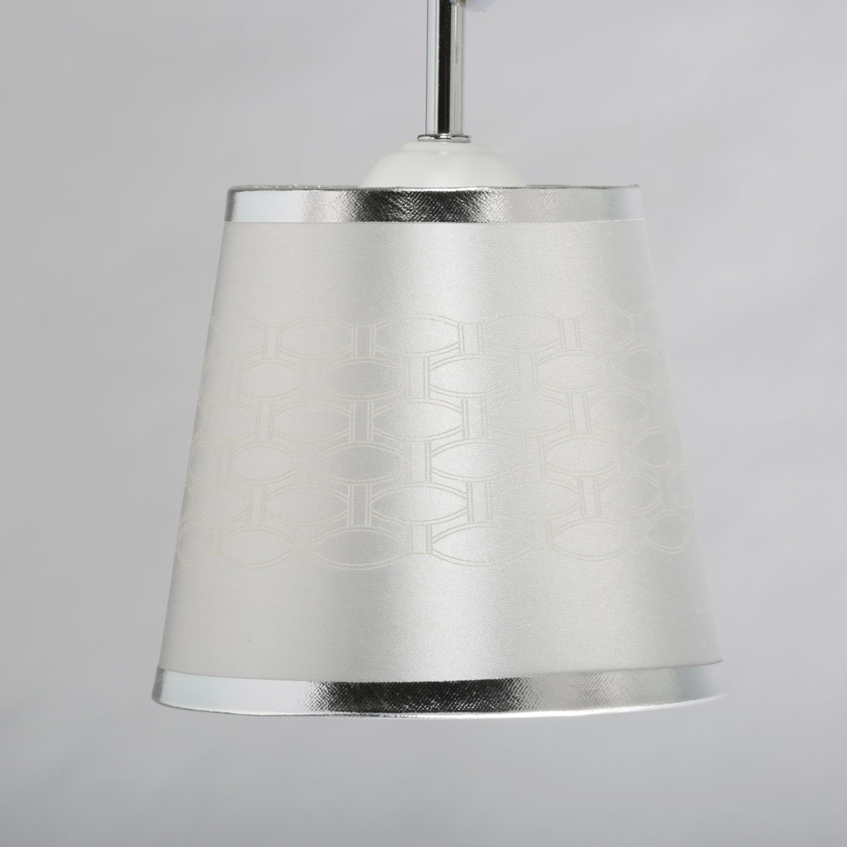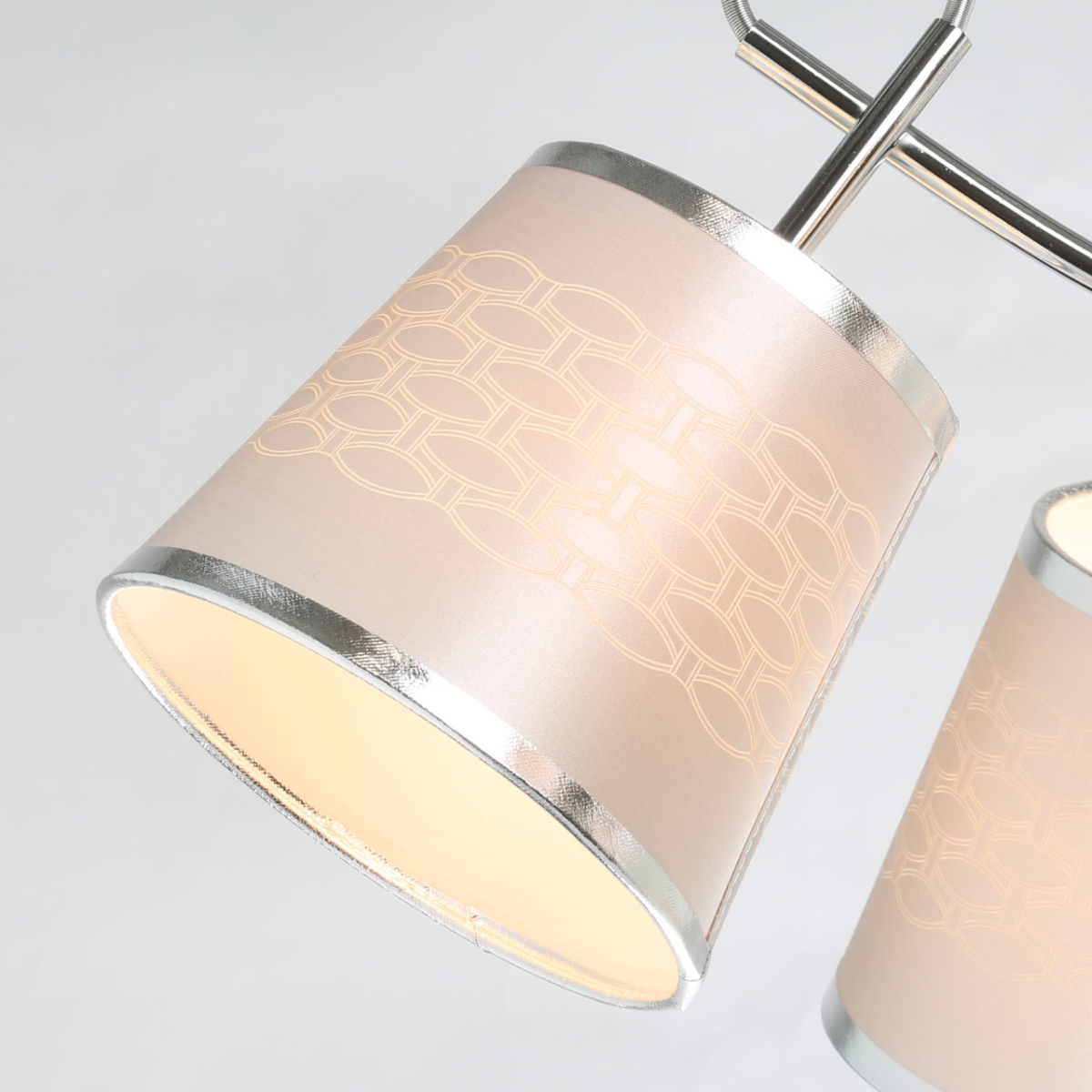 Металлическое основание потолочного светильника гальванизировано в цвет хрома. Отдельные элементы окрашены в белый цвет. Двухслойные текстильные абажуры выполнены из белого текстиля с геометрическим рисунком и термостойкого прозрачного акрила с внутренней стороны.
