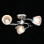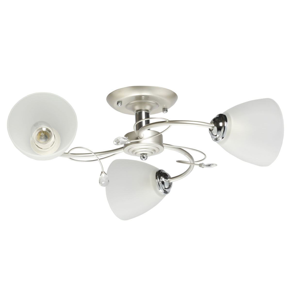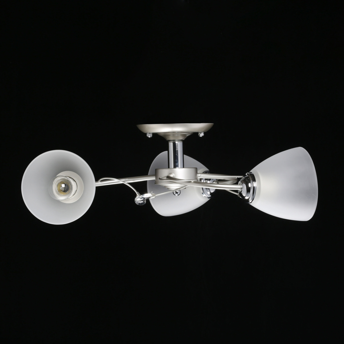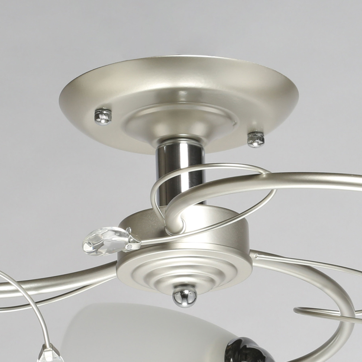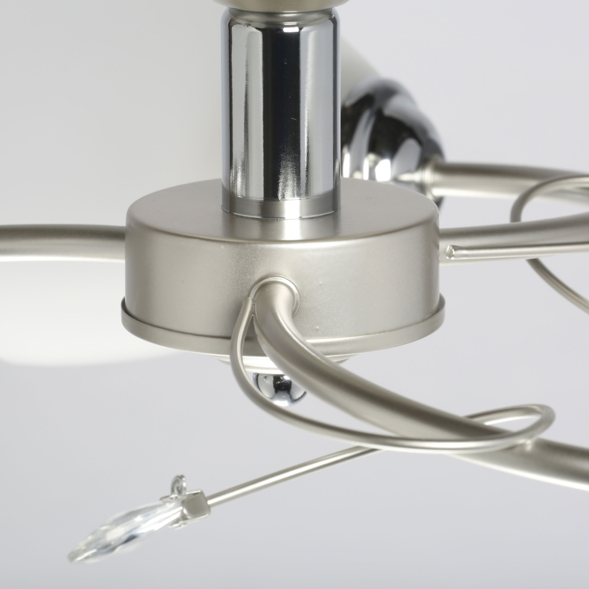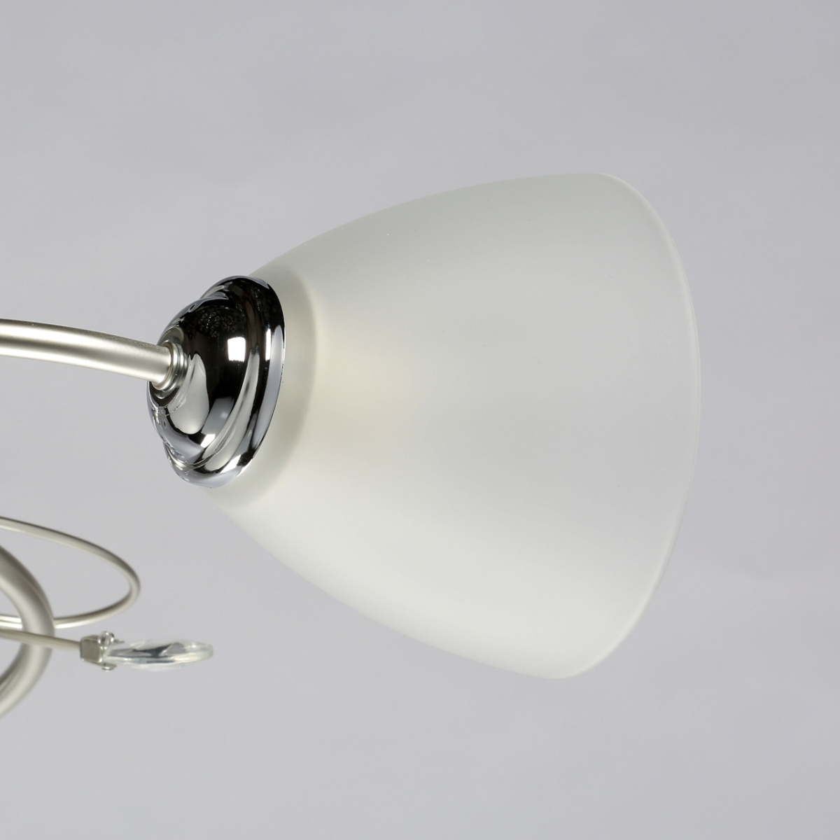 Основание светильника выполнено из сплава металла и окрашено в цвет перламутрового серебра. Отдельные элементы основания гальванизированы в цвет хрома. Светильник декорирован стеклянными матированными плафонами и прозрачным хрусталем.