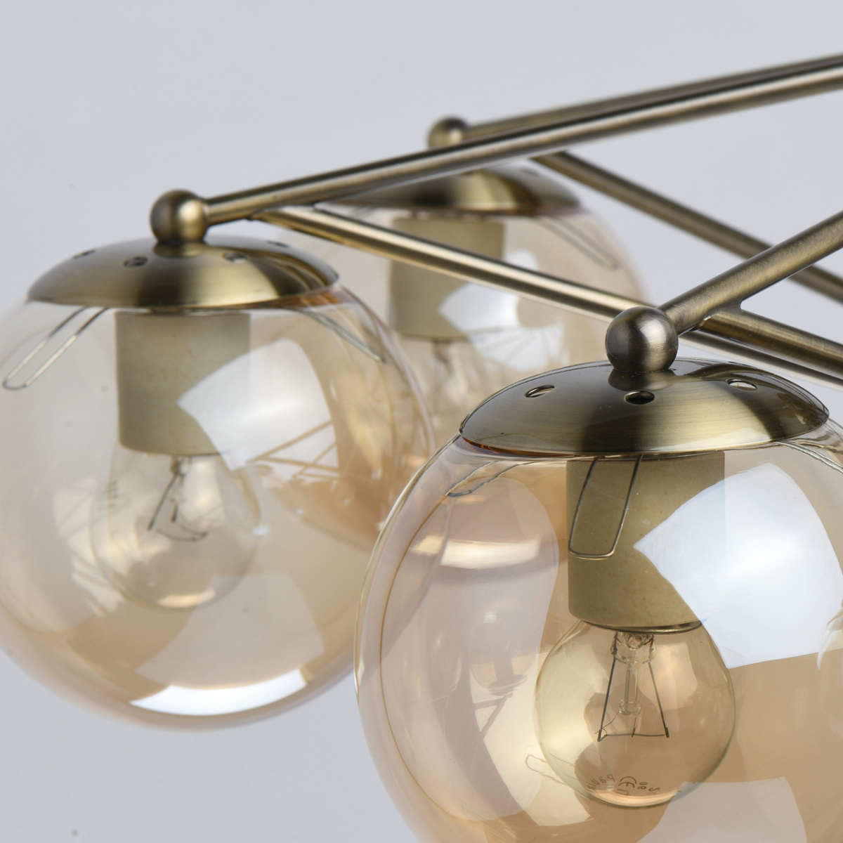 Основание светильника выполнено из металла и гальванизировано в цвет античной бронзы. Светильник декорирован стеклянными плафонами, гальванизированными в цвет топаз.