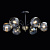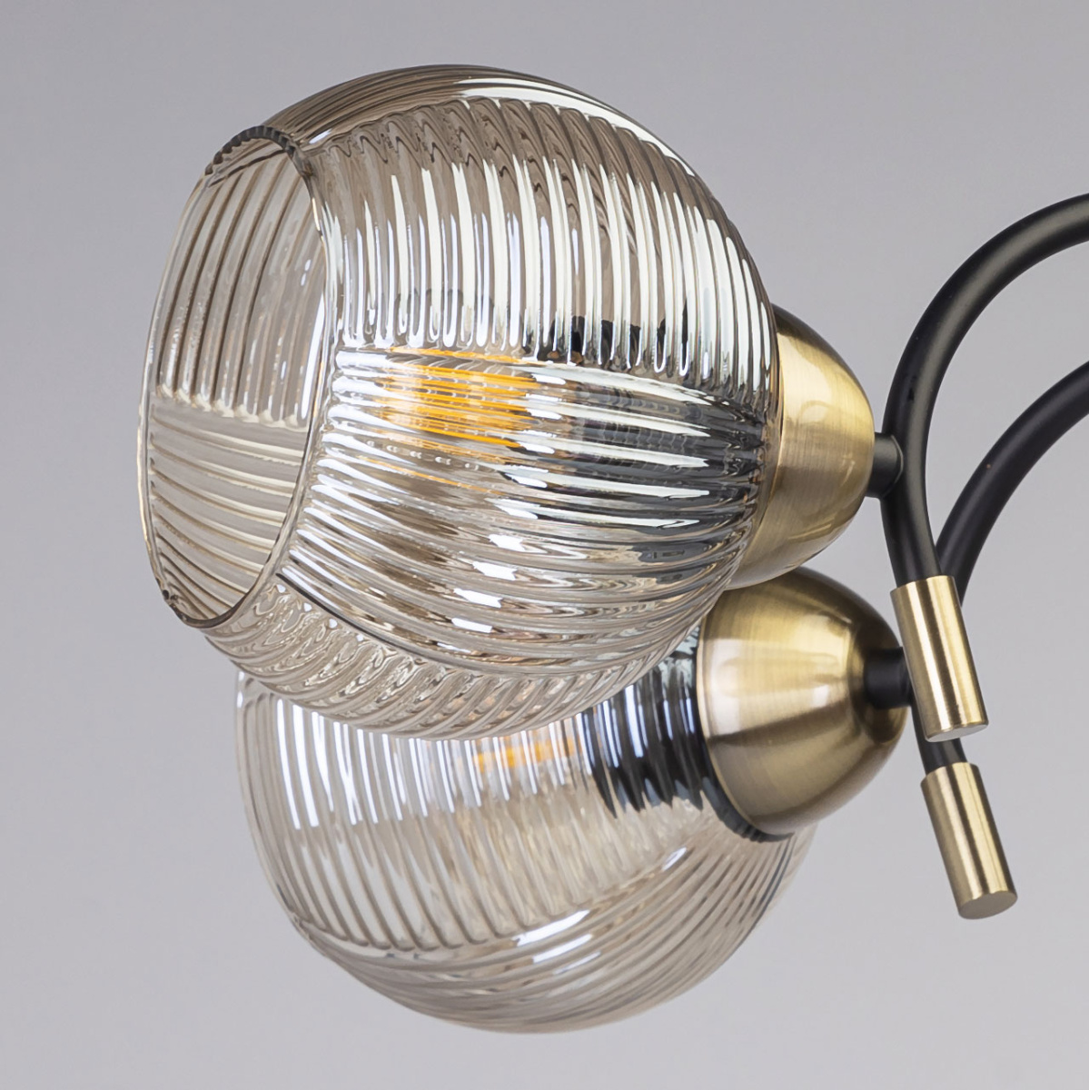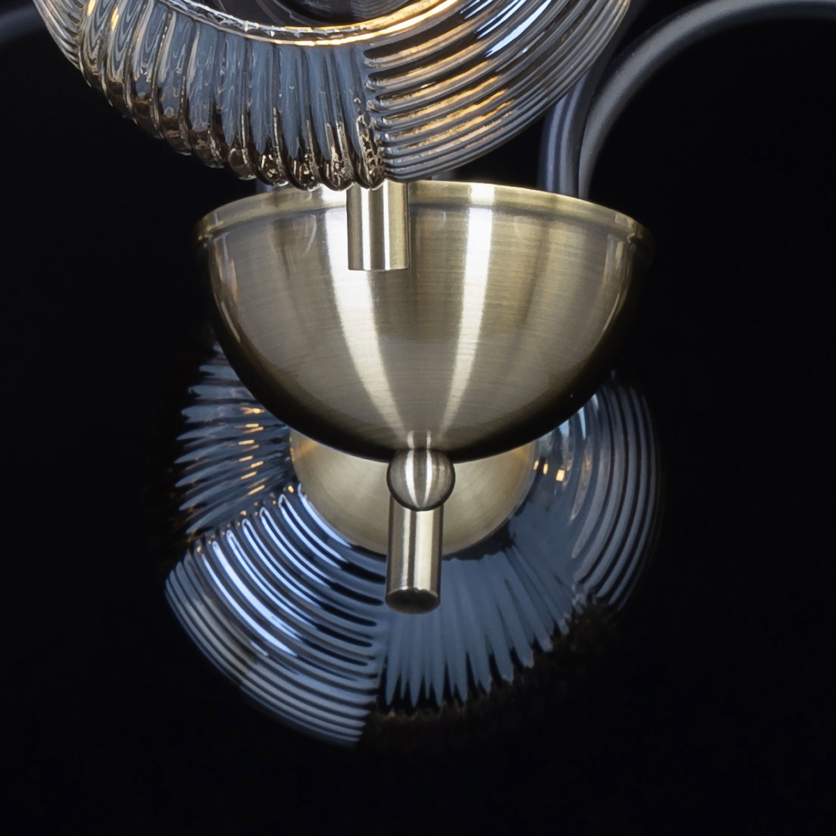Металлическое основание подвесной люстры окрашено в черный цвет. Отдельные элементы основания гальванизированы в цвет античной бронзы. Светильник декорирован стеклянными фактурными плафонами цвета шампань.