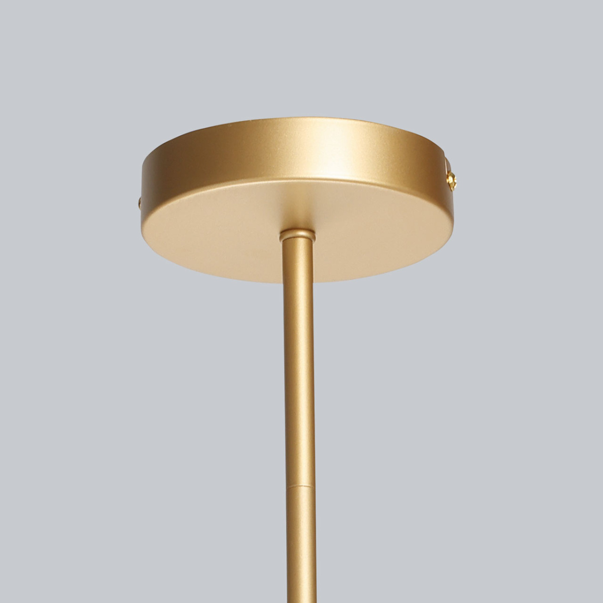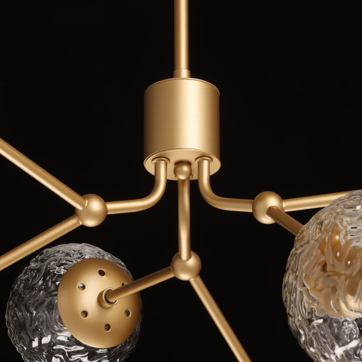 Металлическое основание люстры окрашено в цвет перламутрового золота. Источники света закрыты плафонами из прозрачного фактурного стекла.