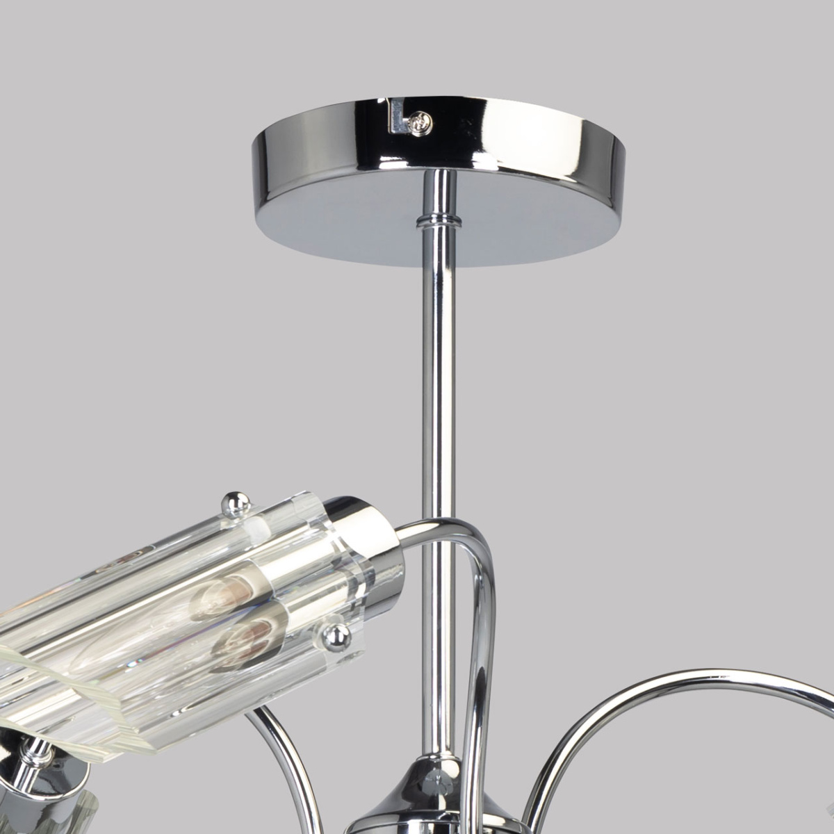 Металлическое основание потолочной люстры гальванизировано в цвет хрома. Люстра декорирована прозрачными фактурными стеклянными плафонами вытянутой формы.