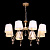 Металлическое основание подвесной люстры окрашено в цвет перламутрового золота. Заменяемые источники света закрыты текстильными абажурами бежевого цвета. С внутренней стороны текстиль защищен прозрачным термостойким акрилом. Абажуры отделаны кантами и прошиты. Люстра декорирована хрусталем, гальванизированным в цвет топаз.
