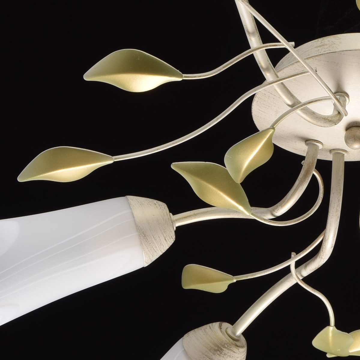 Основание: металл, окрашивание по технологии хай-лайт, основной цвет - белый, декоративный слой цвета золота. Рожки и завитки выполнены по технологии проката на роликовом станке. Плафоны: стекло отлитое в форму, матирование, ручное окрашивание по поверхности.Декор: растительные элементы из металла, окрашивание в салатовый цвет.