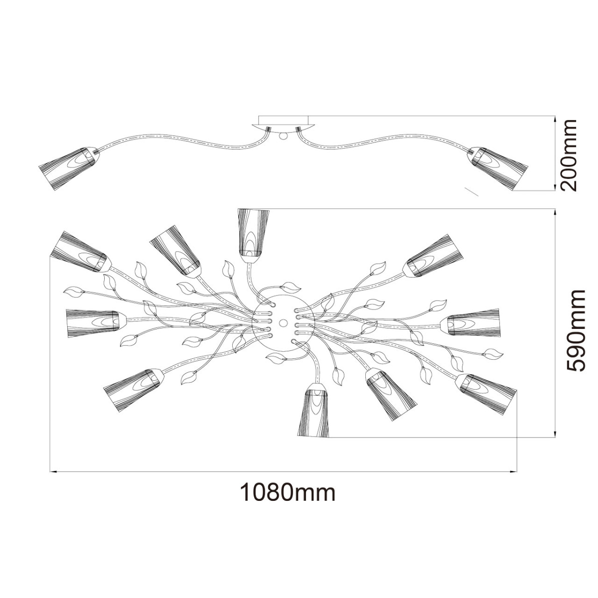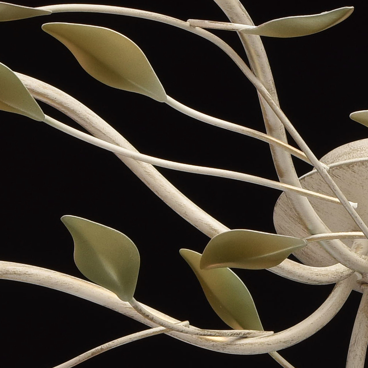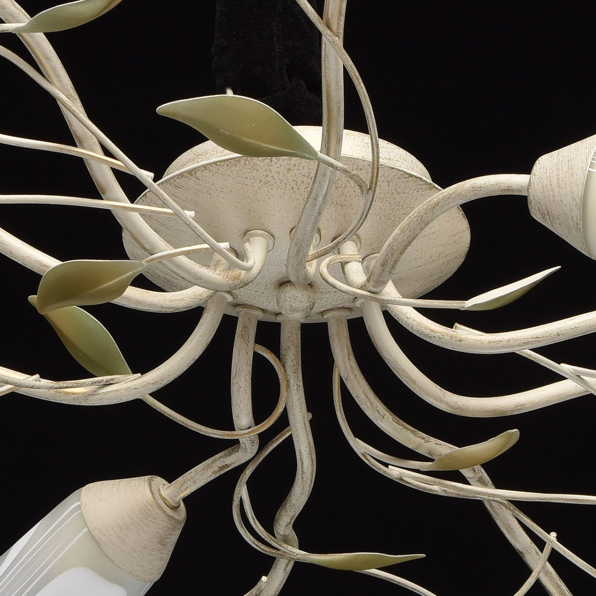 Основание: металл, окрашивание по технологии хай-лайт, основной цвет - белый, декоративный слой цвета золота. Рожки и завитки выполнены по технологии проката на роликовом станке. Плафоны: стекло отлитое в форму, матирование, ручное окрашивание по поверхности.Декор: растительные элементы из металла, окрашивание в салатовый цвет.