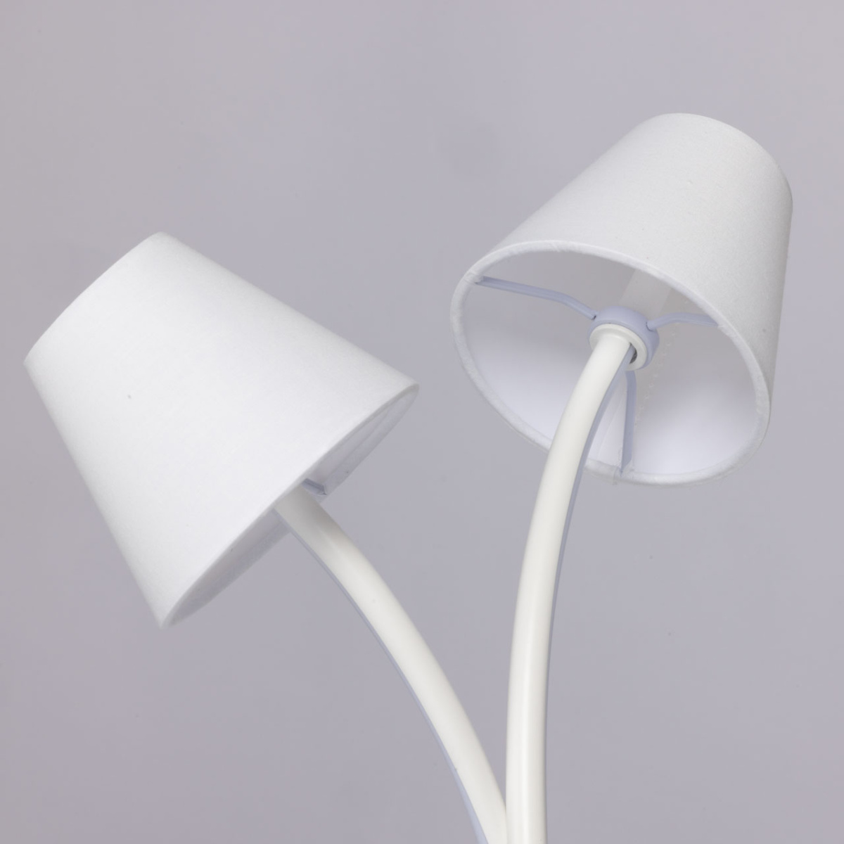 Металлическое основание настольной лампы окрашено в белый цвет. Корпус плафонов изогнутой формы выполнен из сплава алюминия с цинком и окрашен в цвет основания. Двухслойные абажуры состоят из текстиля белого цвета и термостойкого акрила с внутренней стороны. Абажуры прошиты. Светодиодные источники света закрыты белым силиконом.
