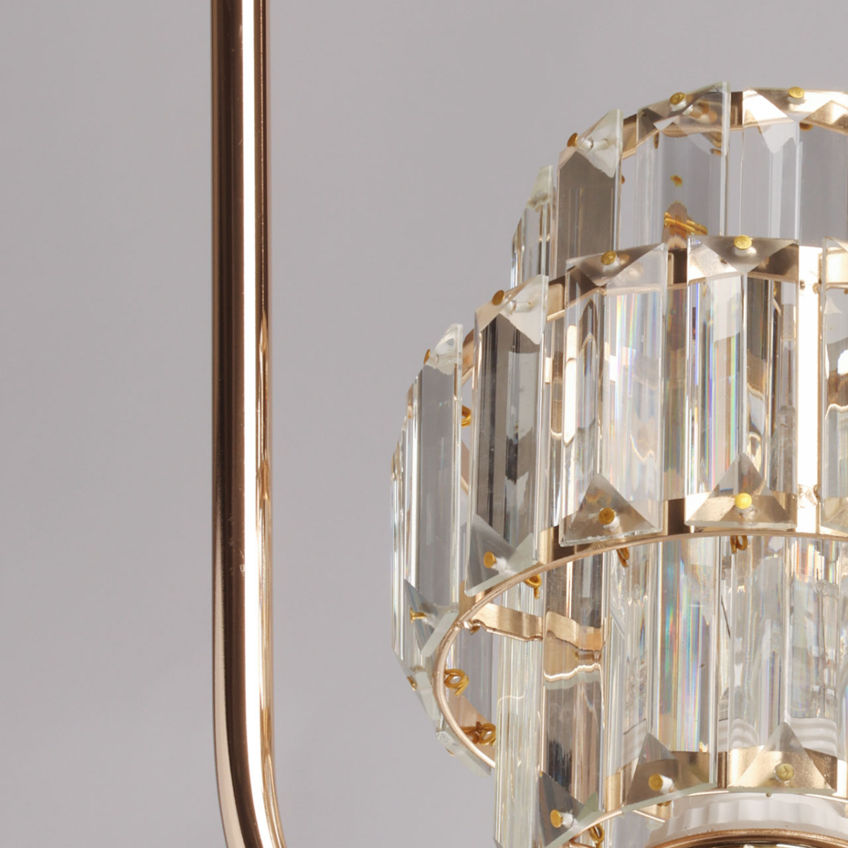 Металлическое основание подвеса гальванизировано в цвет золота. Плафон декорирован прозрачным хрусталем прямоугольной формы.