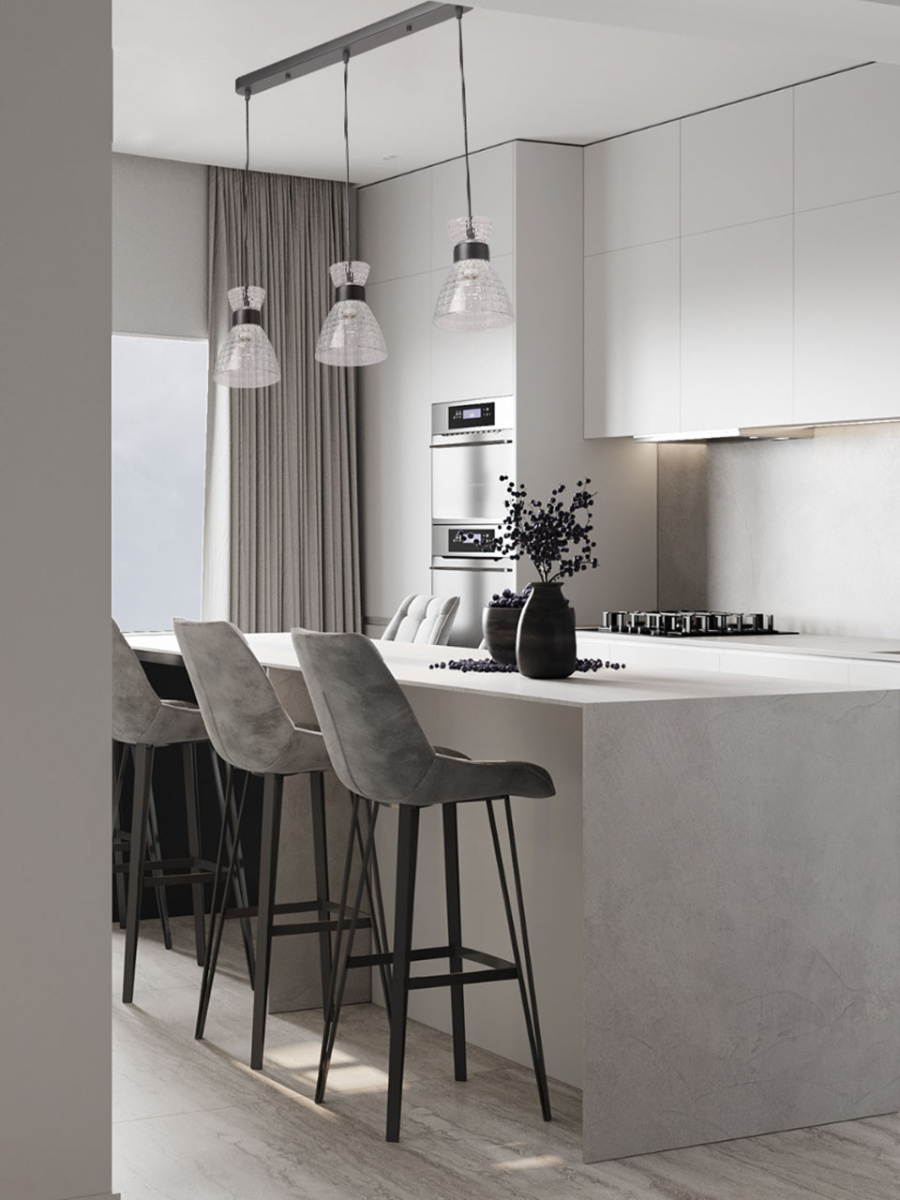 Металлическое основание люстры окрашено в черный цвет. Прозрачные стеклянные плафоны с геометричной фактурой отлиты в сложную форму.