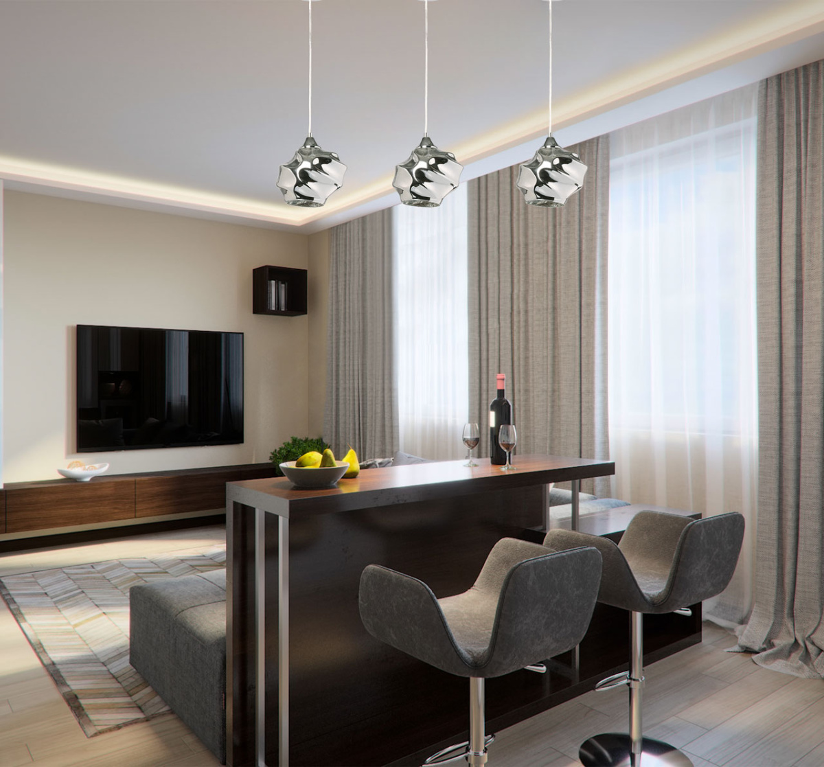 Металлическое основание подвеса гальванизировано в цвет хрома. Плафон отлит из стекла оригинальной формы и гальванизирован в цвет хрома.
