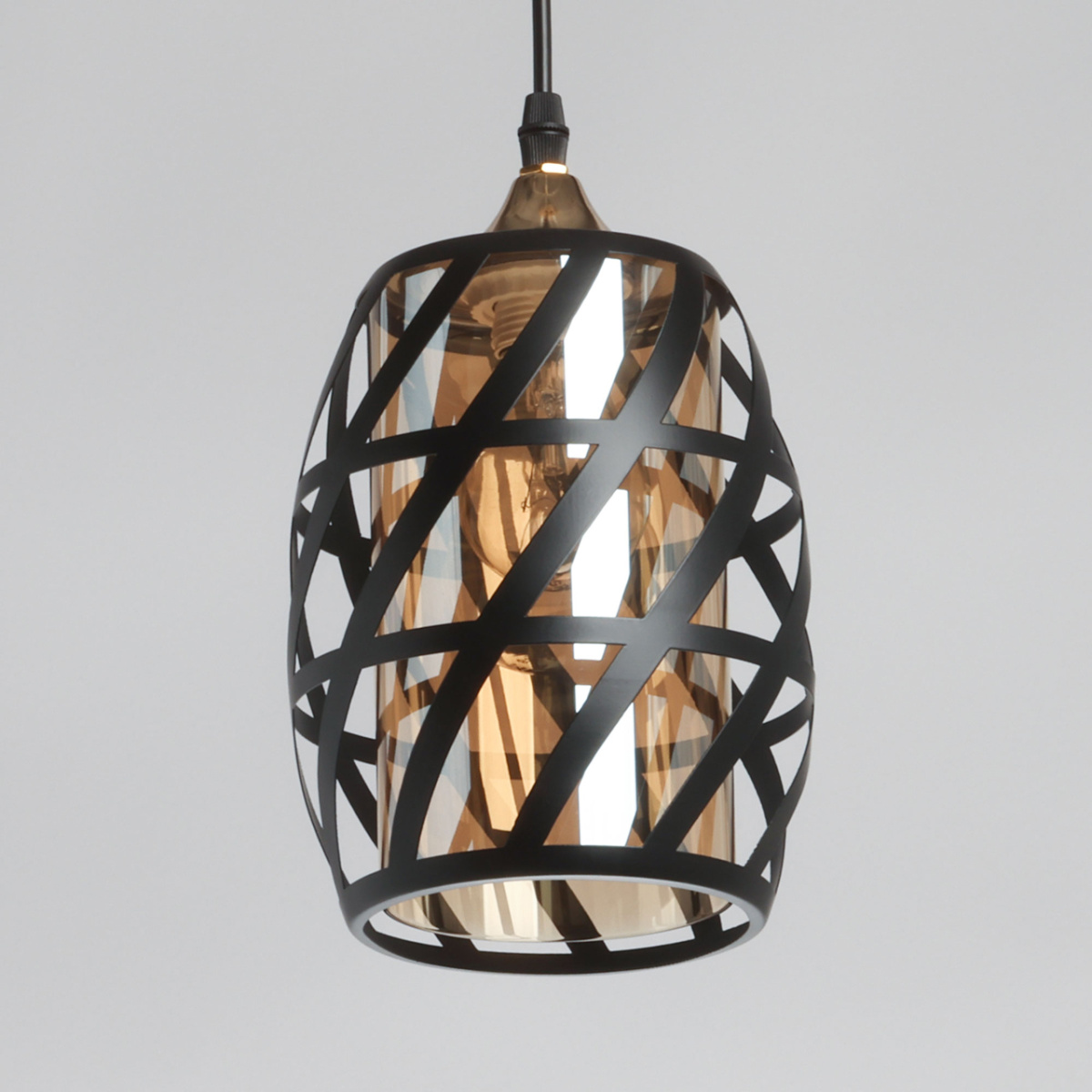 Потолочная чаша и держатель плафона выполнены из металла и гальванизированы в цвет золота. Металлический плфон окрашен в черный цвет. Внутренний стеклянный плафон гальванизирован в цвет шампань.