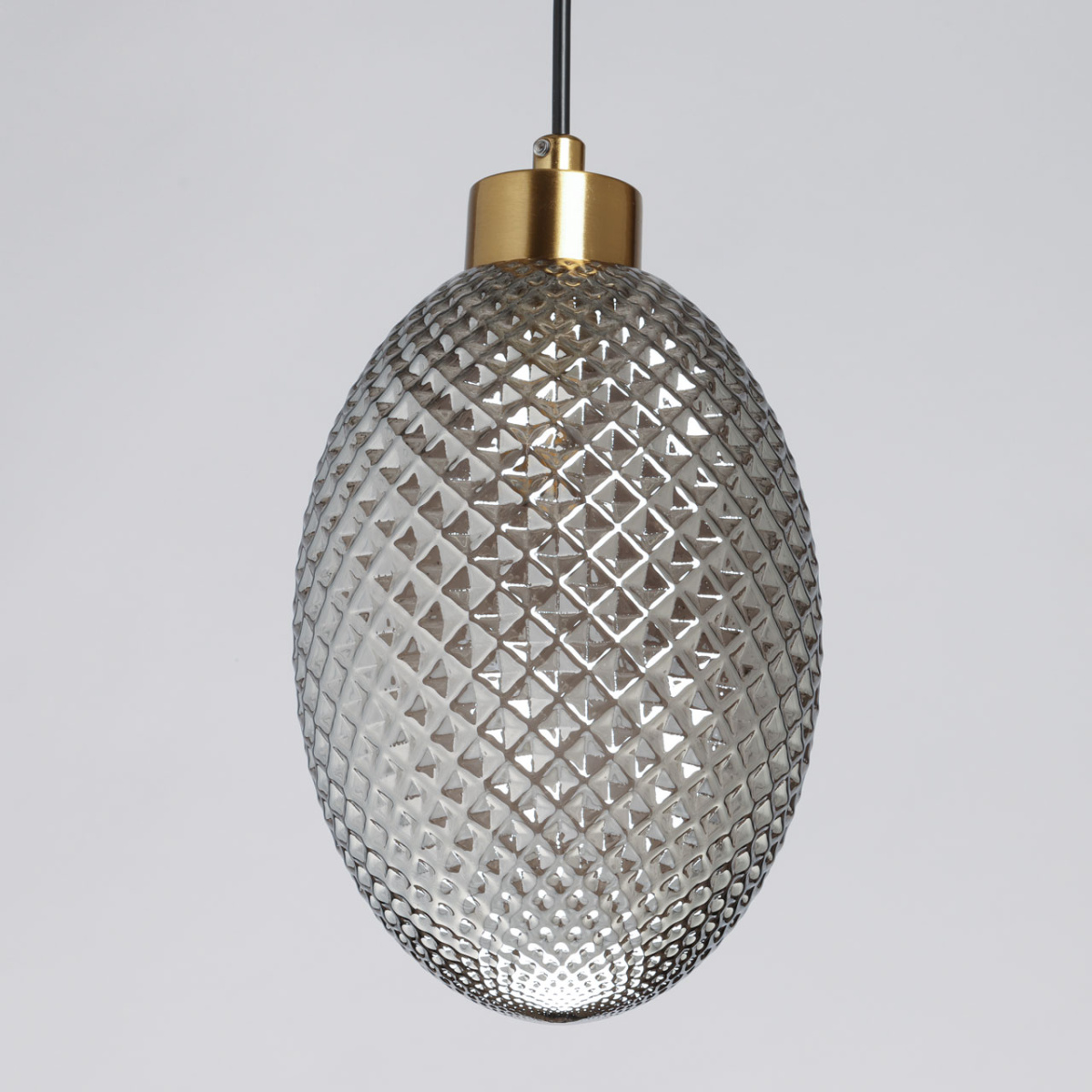 Металлическое основание подвеса окрашено в черный цвет. Отдельные элементы основания гальванизированы в цвет латуни. Стеклянный плафон отлит в сложную форму и гальванизирован в дымчатый цвет.