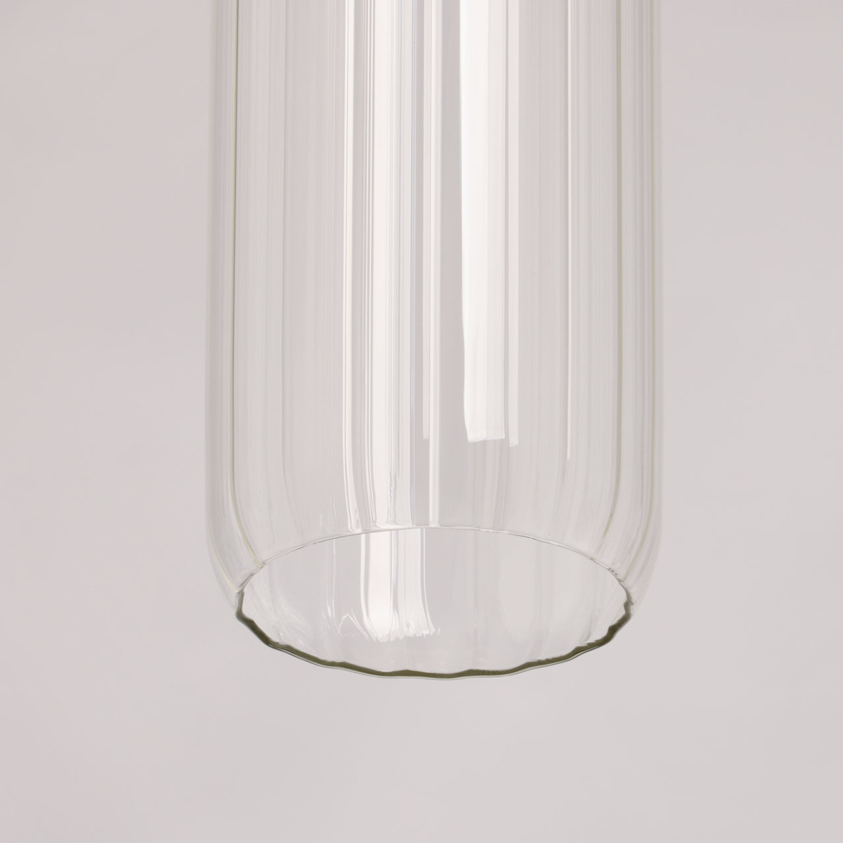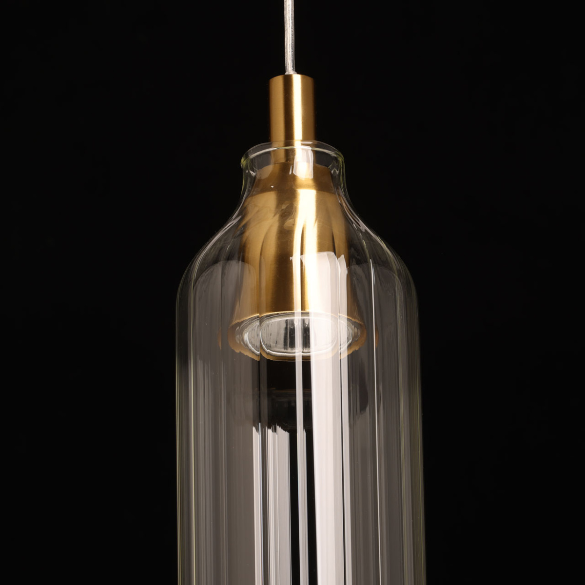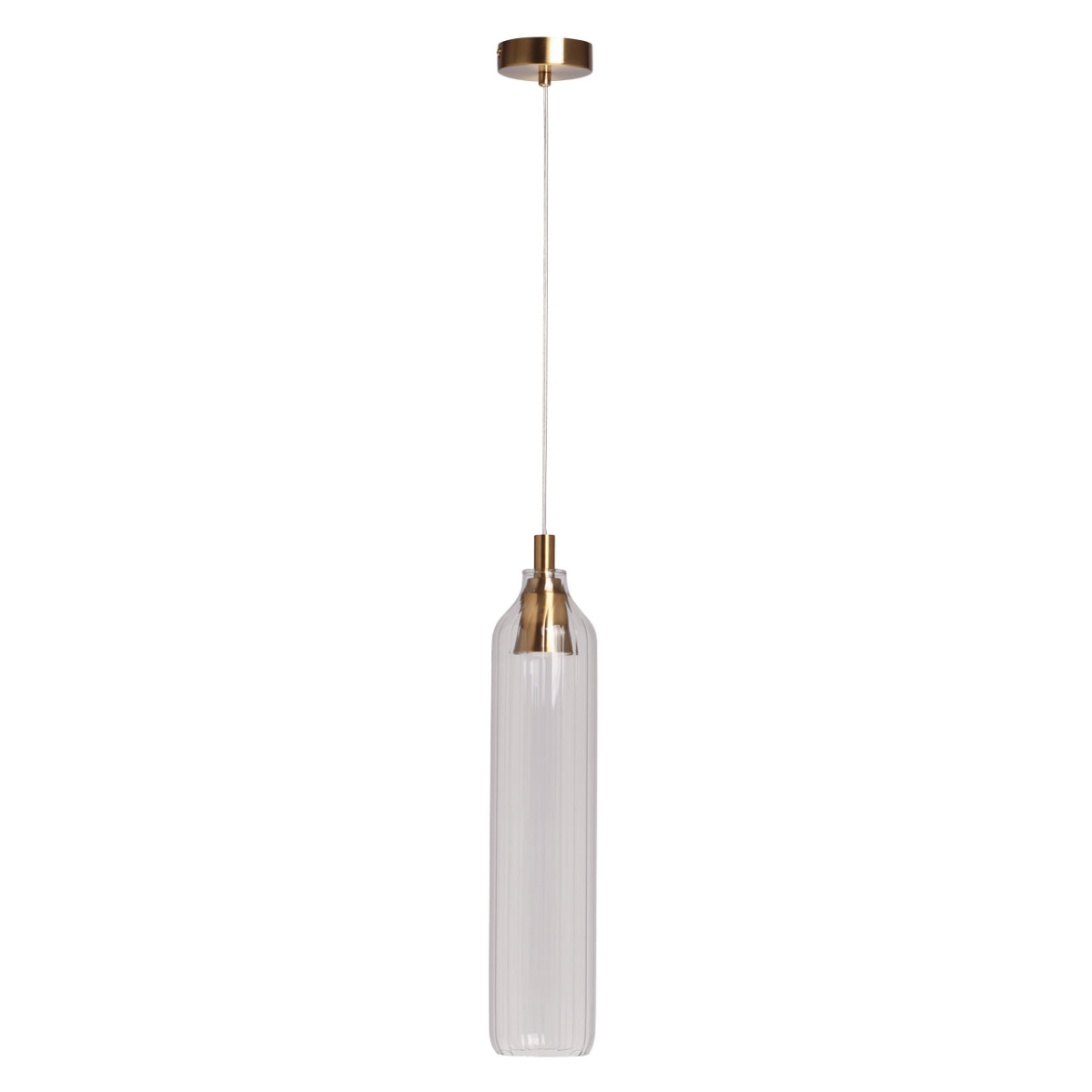 Металлическое основание подвеса гальванизировано в цвет латуни. Плафон вытянутой формы отлит из прозрачного стекла.