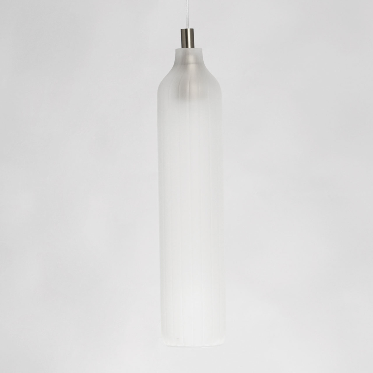 Металлическое основание подвеса гальванизировано в цвет никеля. Плафон вытянутой формы отлит из стекла и матирован.