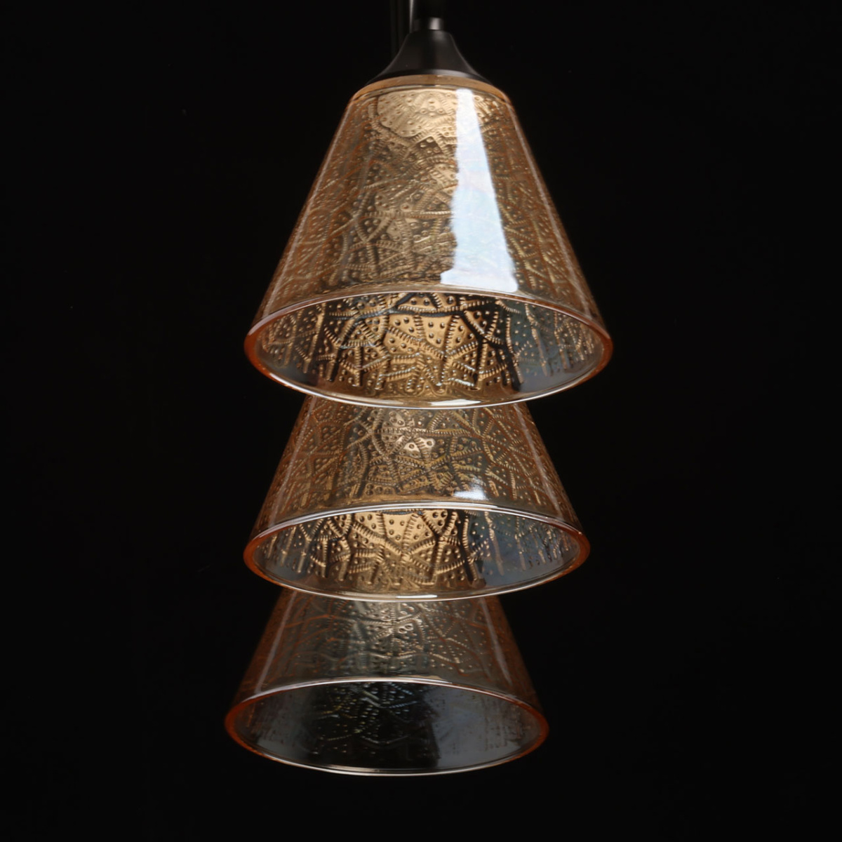 Металлическое основание потолочной люстры окрашено в черный цвет. Стеклянные плафоны отлиты в фактурную форму и гальванизированы в цвет коньяка. Потолочная люстра декорирована элементами из светлого натурального дерева.